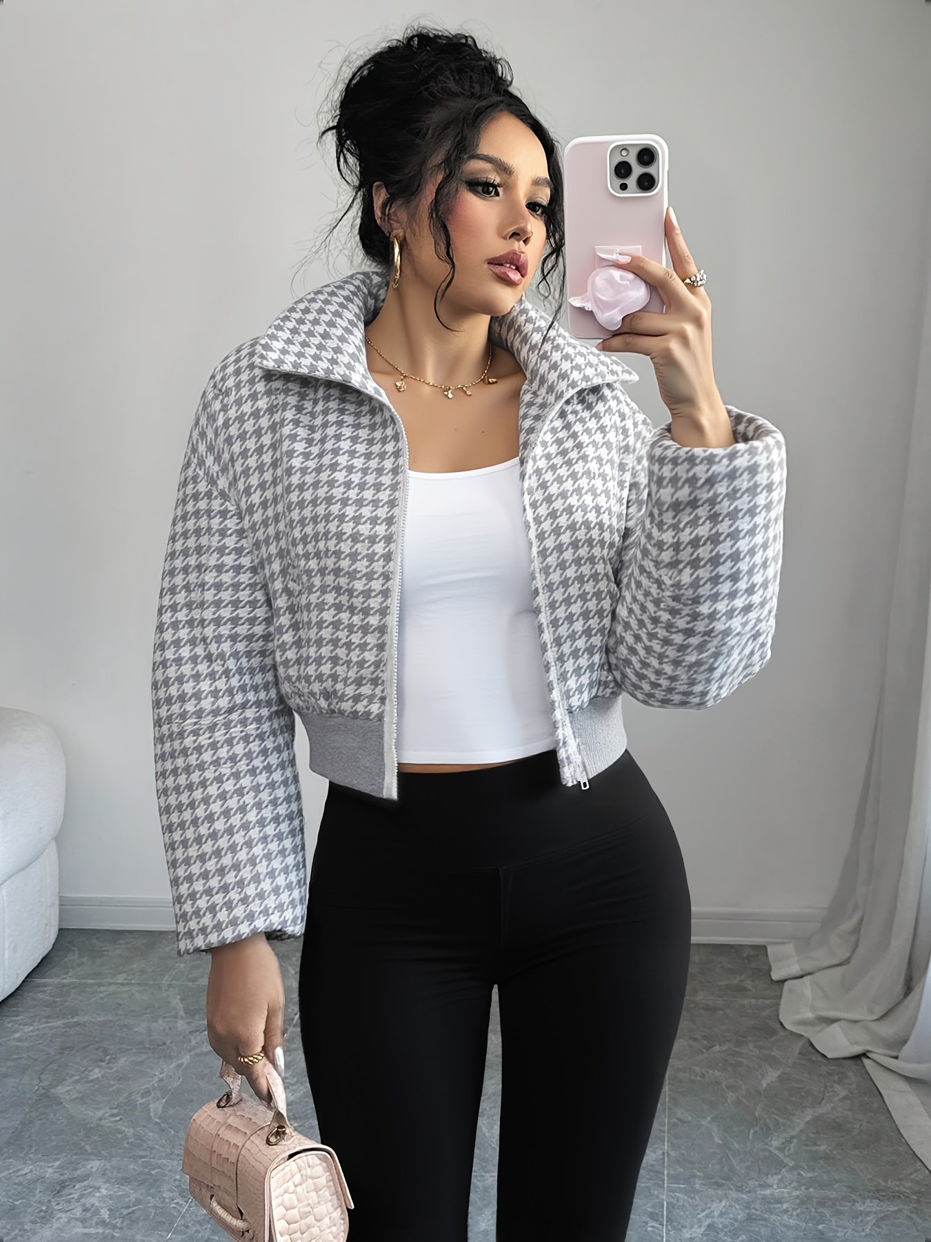 استعدي لاستقبال الشتاء بأناقة لا مثيل لها ودفء يغمرك! نقدم لكِ الجاكيت القصير بنقشة الكاروهات الساحرة، رفيقكِ المثالي للأيام الباردة والتنقلات اليومية. تصميم عصري يجمع بين الراحة الفائقة والأناقة الجريئة ليمنحكِ إطلالة مميزة أينما ذهبتِ، سواء في لقاءات الصباح السريعة أو نزهات بعد الظهر الممتعة.
