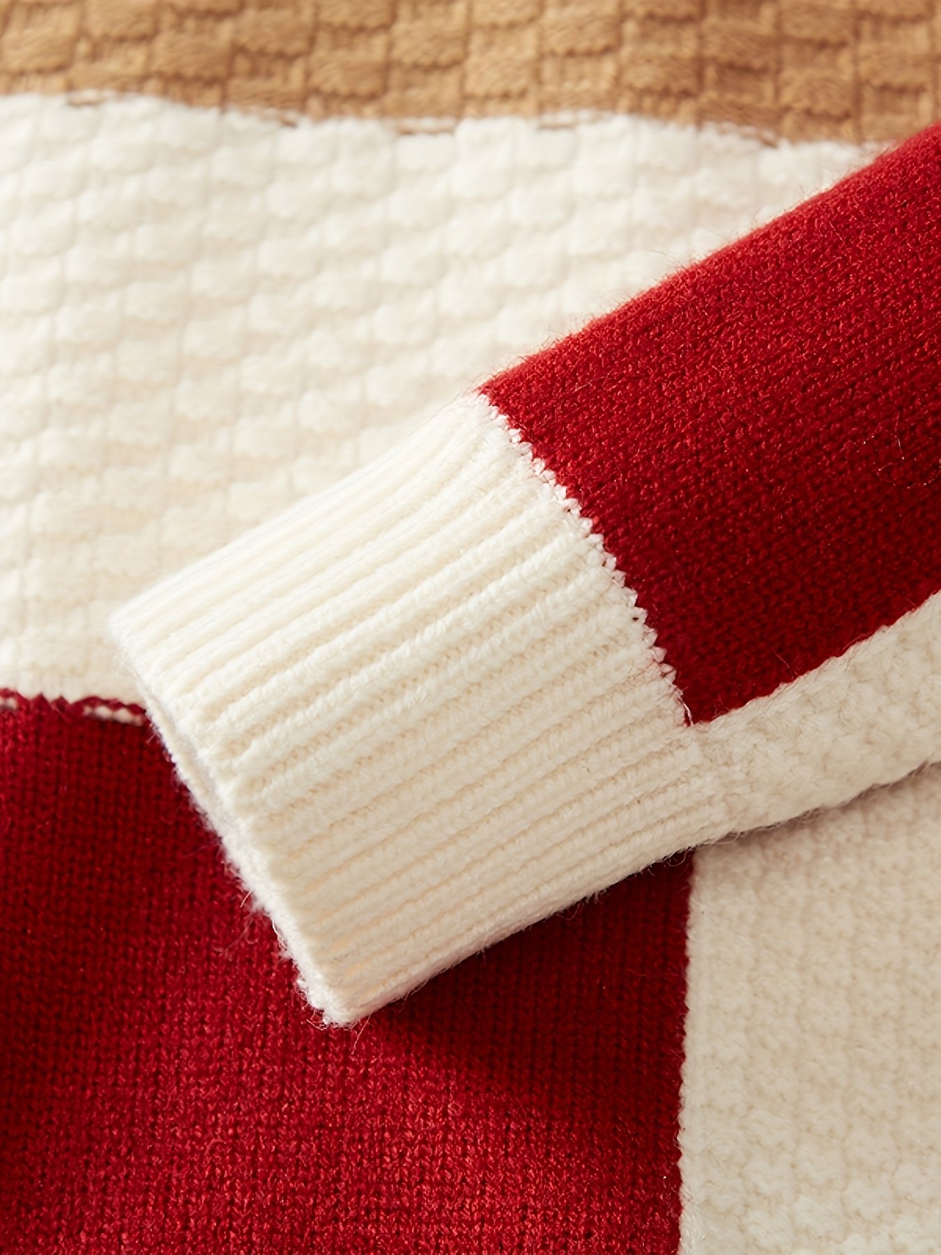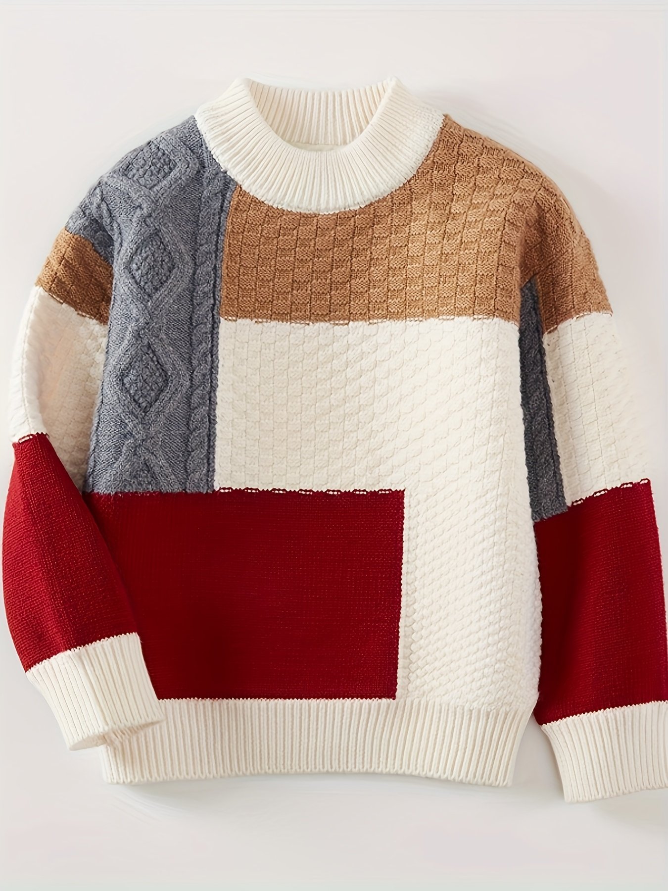 - تصميم كتل الألوان العصري: يتميز بتصميم جذاب يجمع بين كتل الألوان الأنيقة (البيج، الأبيض، الرمادي، والأحمر) مع نمط هندسي مميز ليمنحك إطلالة شبابية متفردة وعصرية تبرز ذوقك الرفيع.
