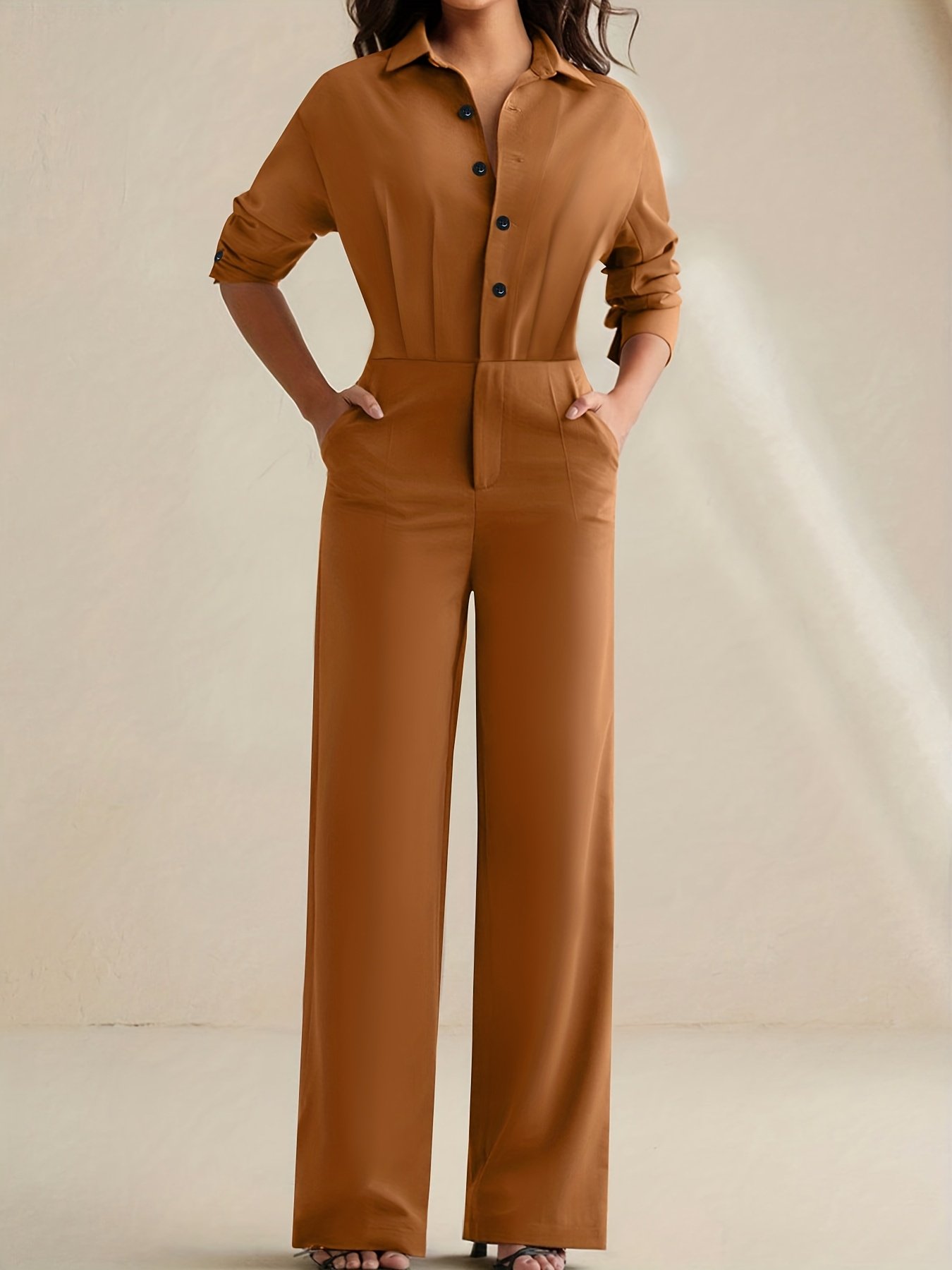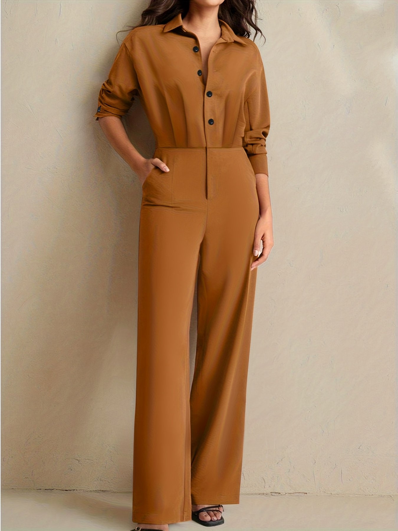 - עיצוב שלם ויוקרתי: האוברול מתאפיין בגזרה מובנית ומדויקת המבליטה את יופיו של גופך באלגנטיות שאין דומה לה, עם חולצה בעלת שרוולים ארוכים וכפתורים קדמיים וצווארון קלאסי, ומכנסיים רחבי רגליים המעניקים לך מראה מודרני ונוח כאחד.