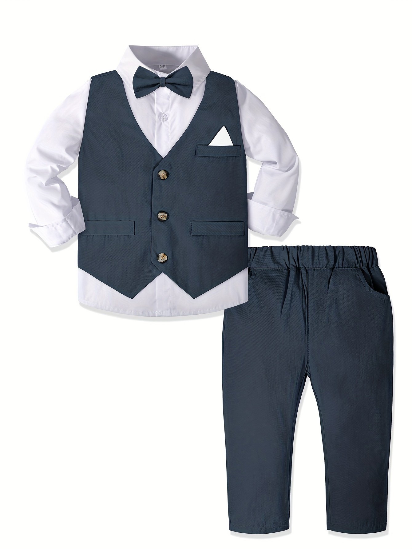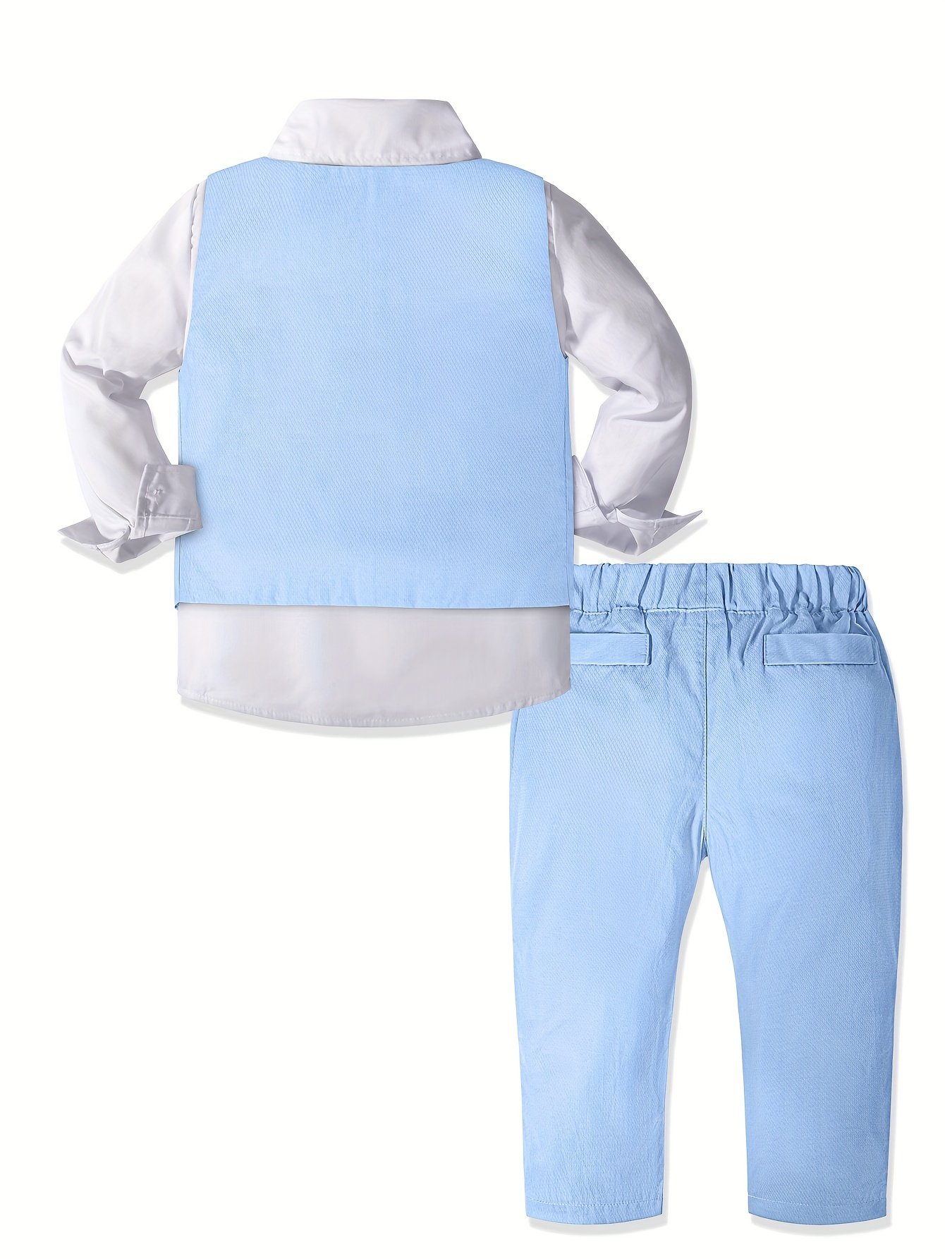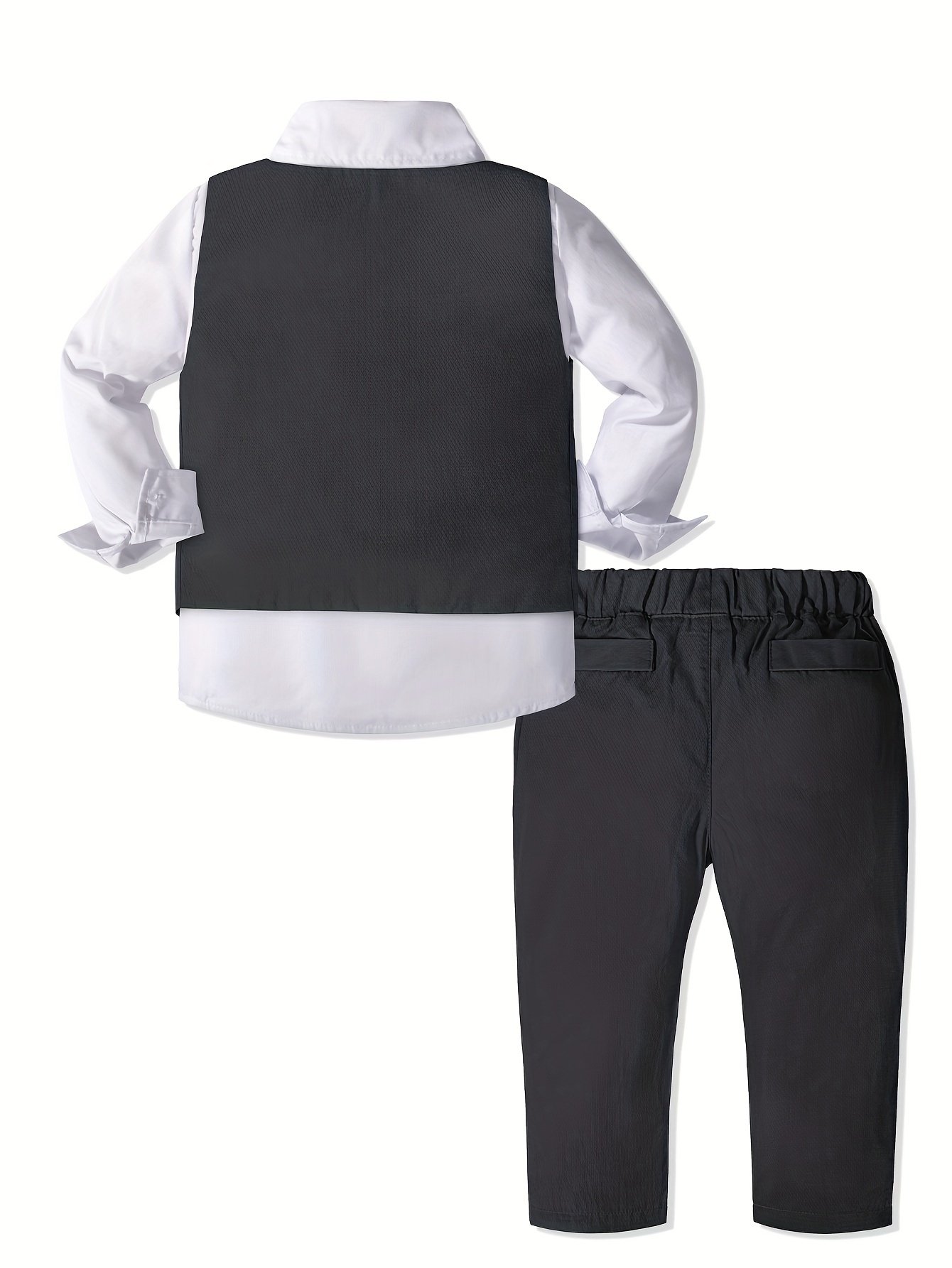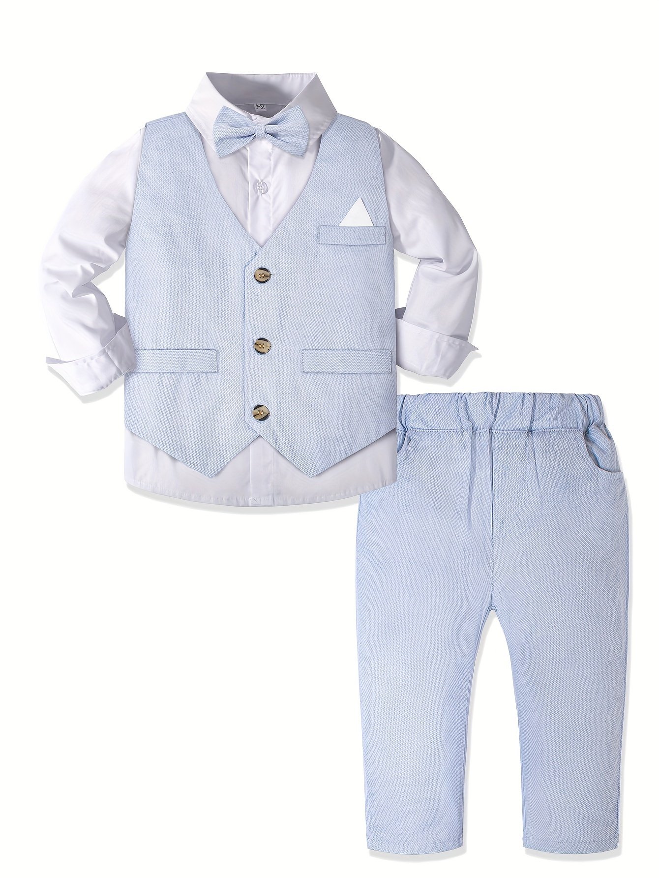 - אלגנטיות מלאה בארבעה חלקים: היפרדו מחיפוש אחר פריטים תואמים! תיהנו משקט נפשי עם סט הכולל את כל מה שהקטן שלכם צריך: חולצה לבנה בוהקת עם שרוולים ארוכים, ז'קט אלגנטי עם פרטי כיס, מכנסיים ארוכים ונוחים, ועניבת פרפר מקסימה, למראה זוהר שאי אפשר לעמוד בפניו ומוכן לכל אירוע.