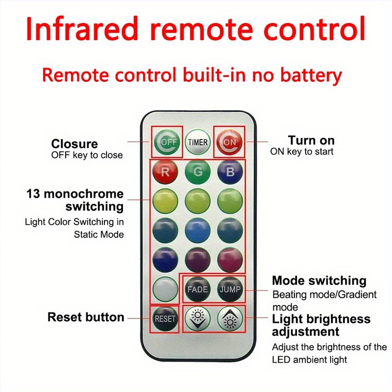- שליטה אלחוטית קלה ונוחה: הודות לפונקציית חיישן אינפרא אדום, תוכלו לשנות צבעים, בהירות ודפוסים בקלות באמצעות השלט הרחוק שלכם, מה שמעניק לכם שליטה מלאה על אווירת המקום בלחיצת כפתור.