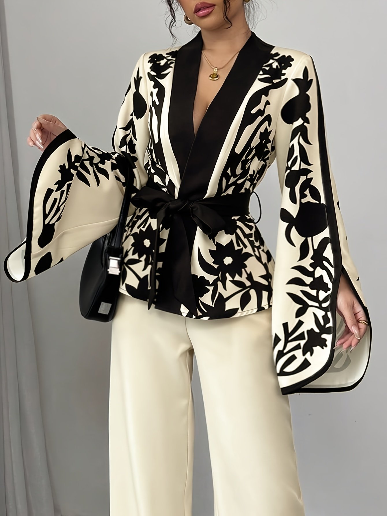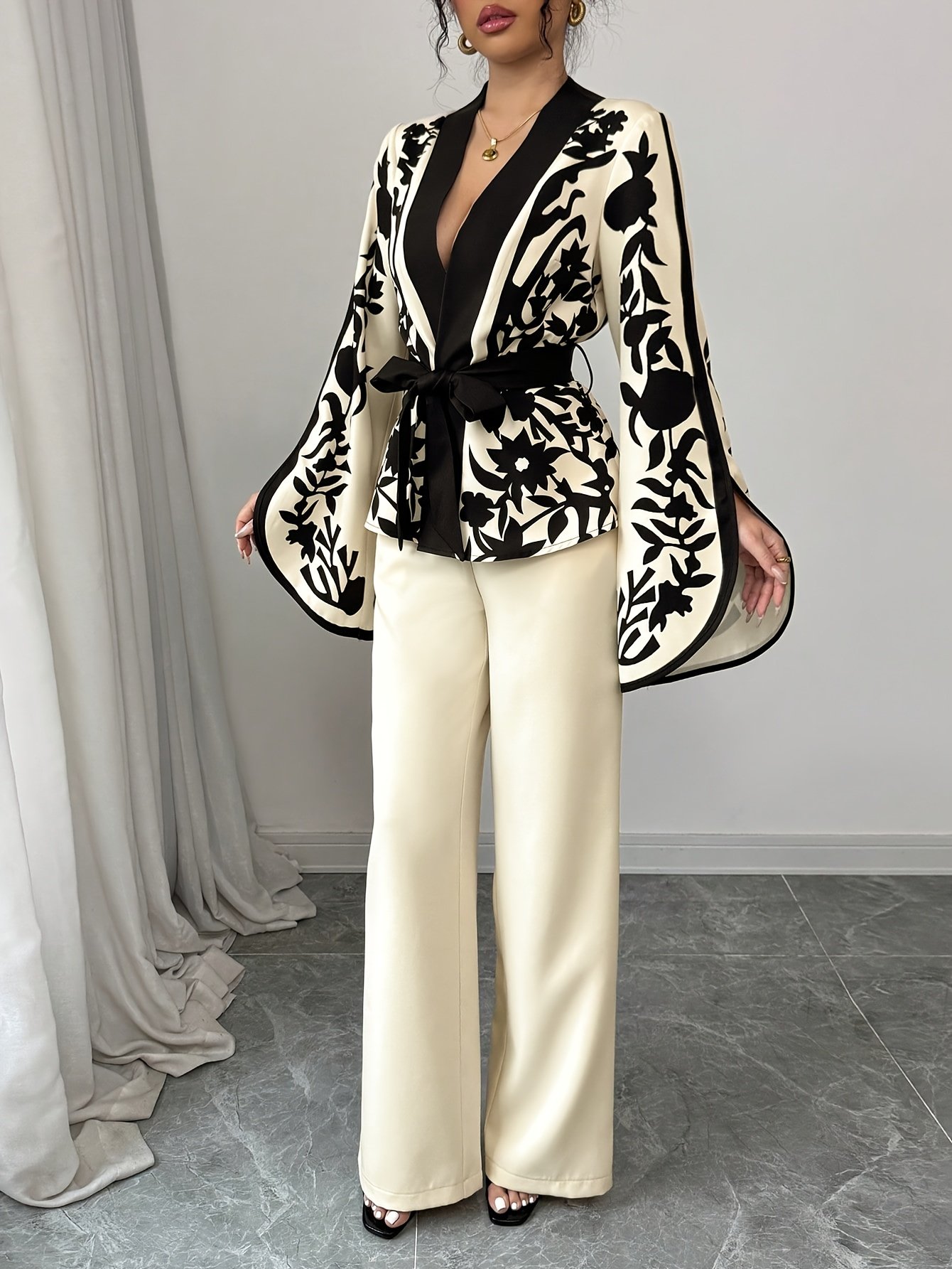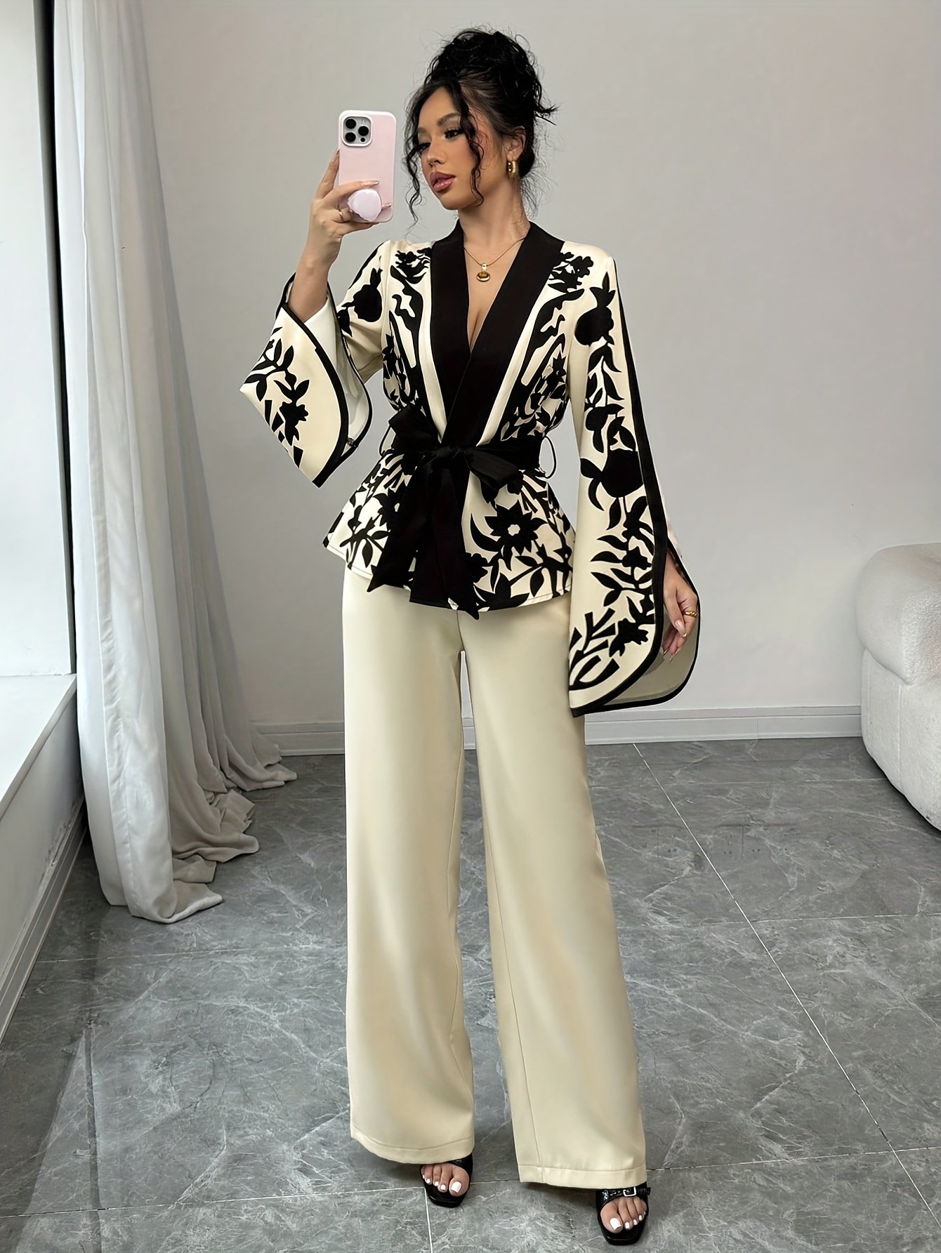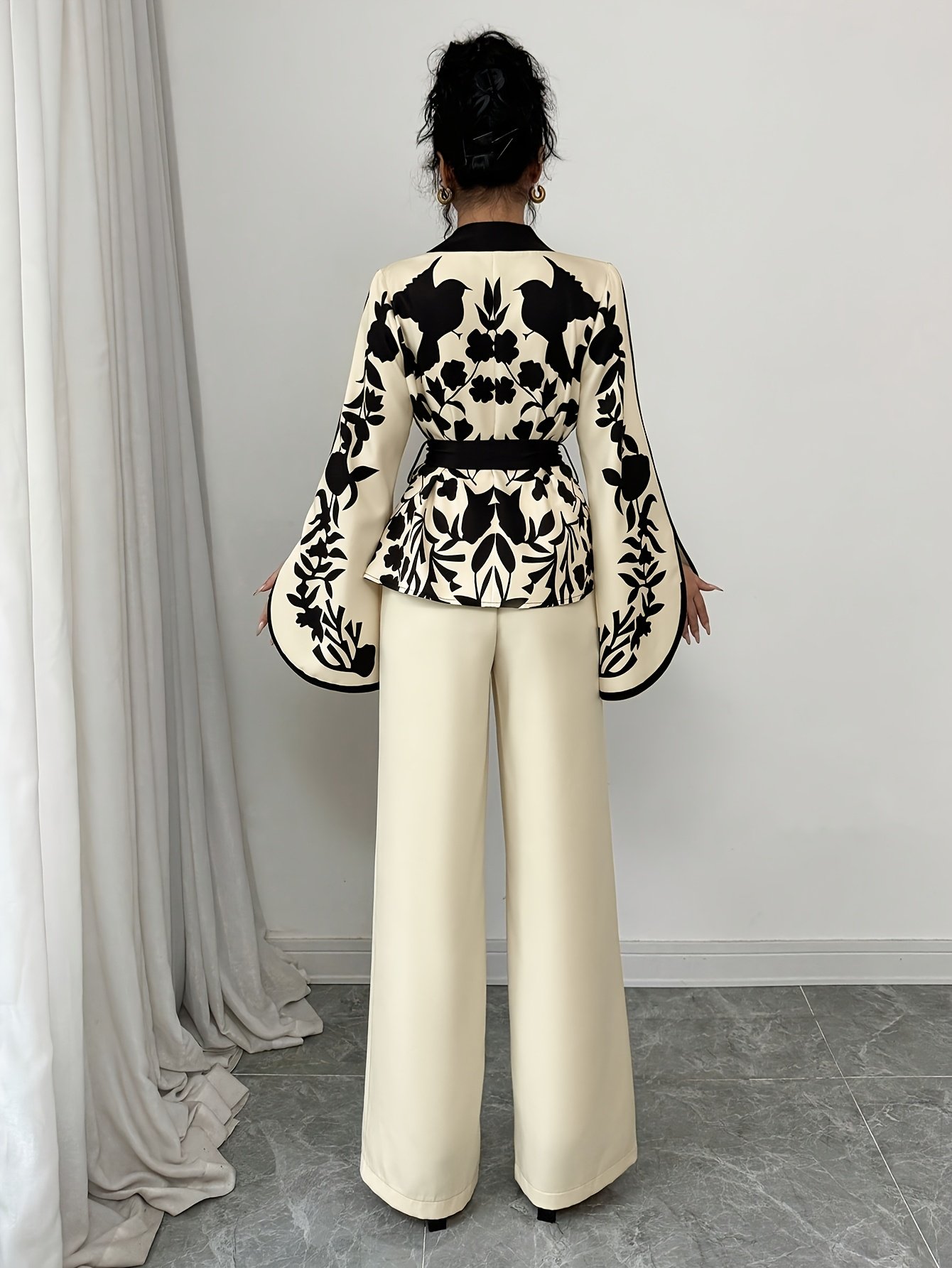 - עיצוב אופנתי וייחודי: סט מדהים זה משלב ז'קט מודפס בגזרה אופנתית ומותן מוגדרת עם חגורה אלגנטית, ומכנסיים רחבים בגזרה ישרה, כדי להעניק לך מראה שלם ונועז שבו תזהרי בכל מקום.