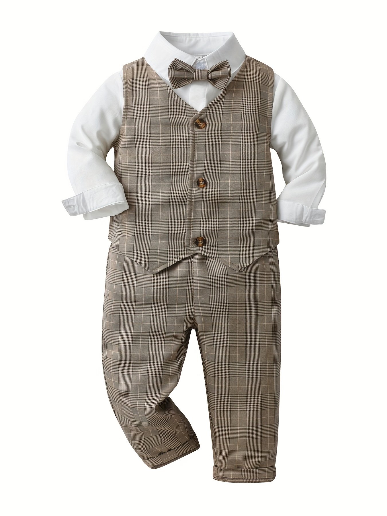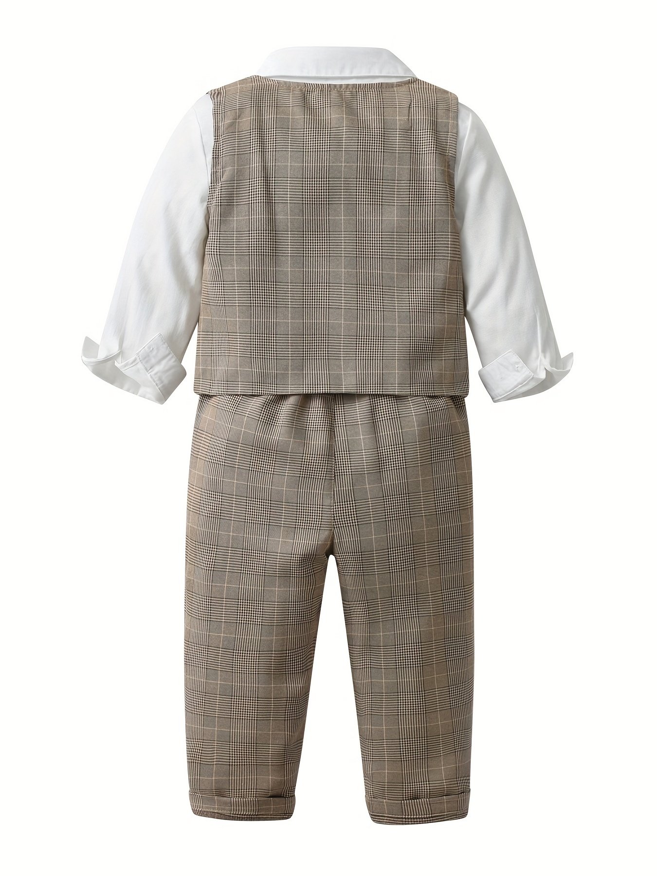 - סט מלא למראה יוצא דופן: הוא מורכב מחולצה עם שרוולים ארוכים המעוטרת בפפיון אלגנטי, ז'קט רשמי מושך, ומכנסיים אופנתיים, כדי להכין את ילדכם לכל אירוע באלגנטיות מושלמת וללא מאמץ בבחירת פריטים נפרדים.