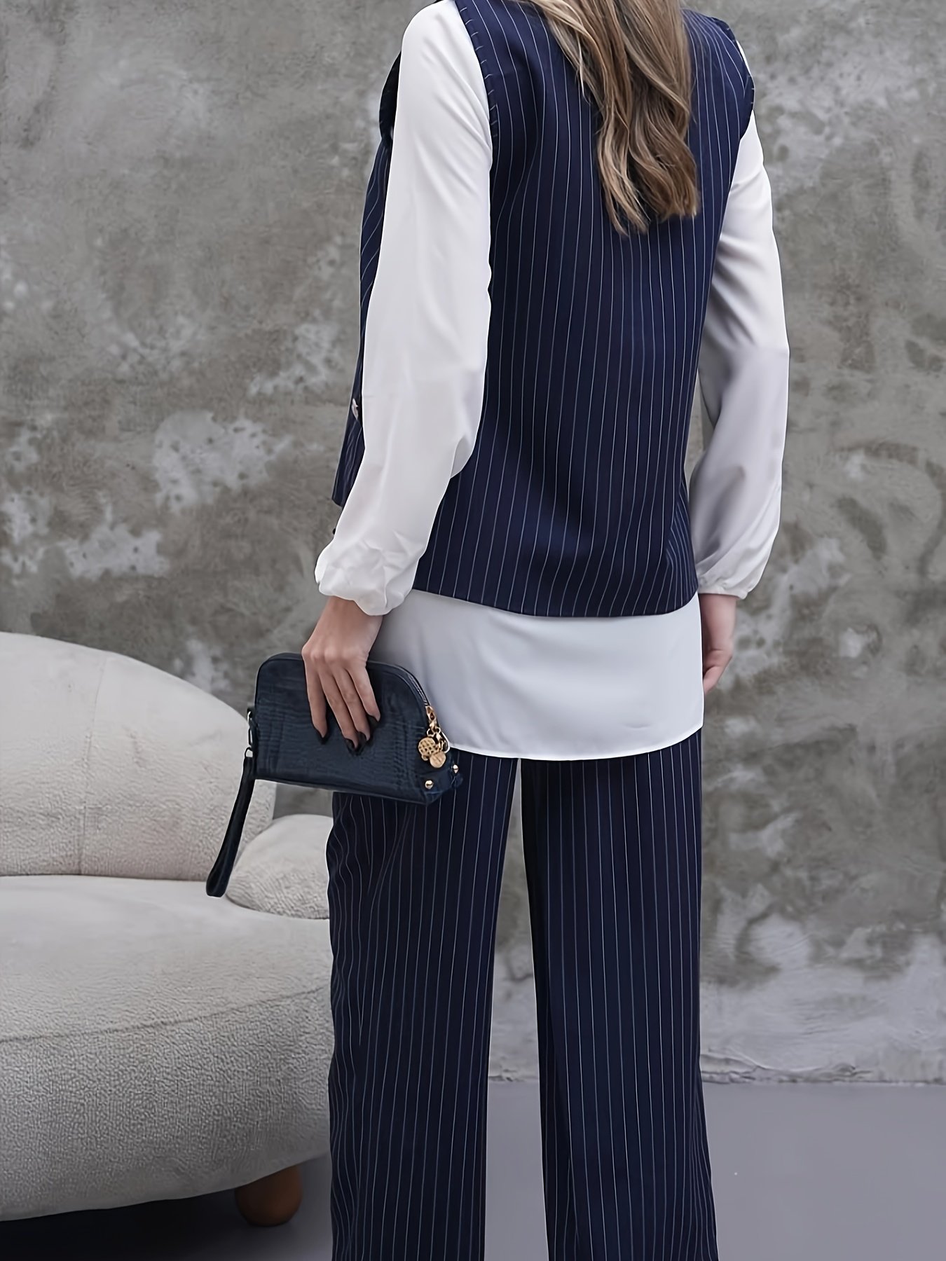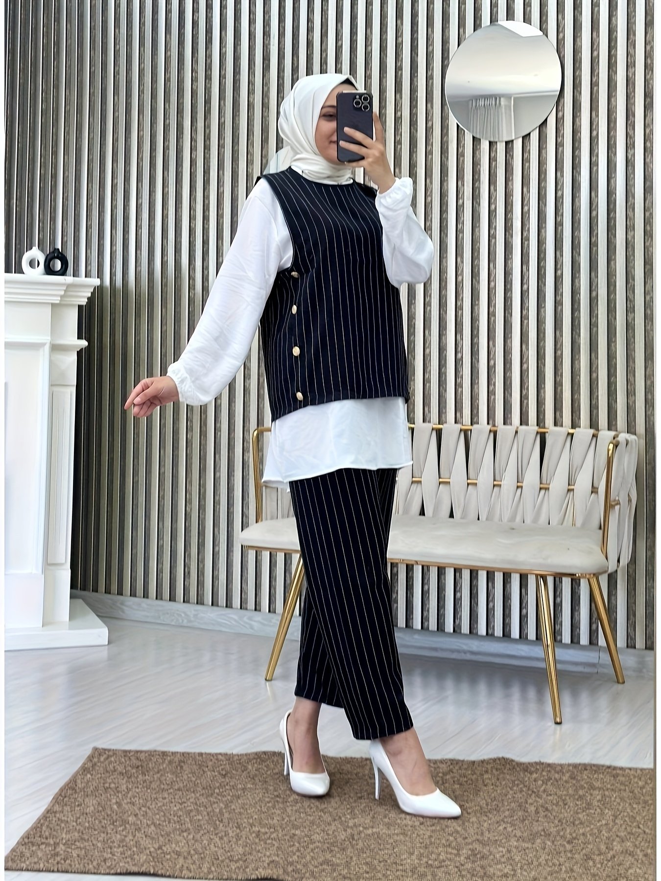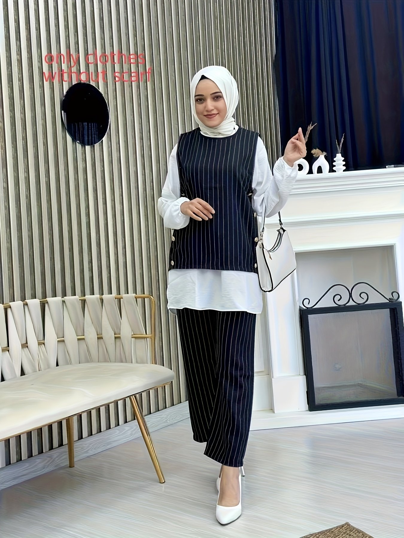 - עיצוב המשלב אלגנטיות ופרקטיות: הסט מתאפיין בעיצוב מפוספס אנכי בשחור ולבן, עם טופ פנימי ללא שרוולים המוסיף מגע עכשווי ומנוגד, מה שגורם לך לזרוח במראה קז'ואל אלגנטי בו זמנית.