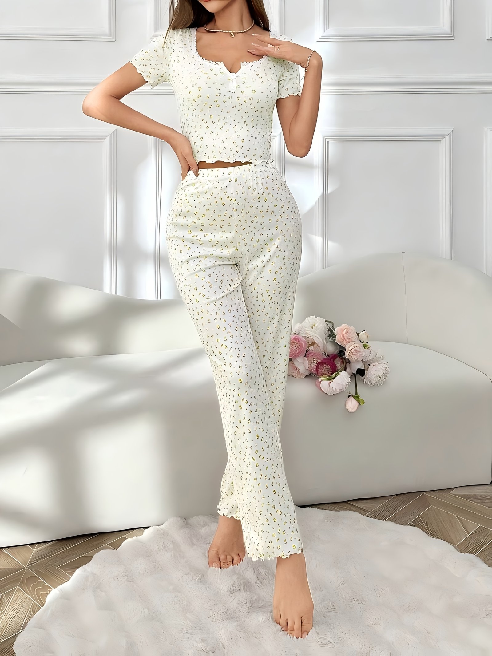 - עיצוב פרחוני קסום עם נגיעת תחרה: מעוטרת בדוגמאות פרחים עדינות ופרטי תחרה נשיים, יחד עם צווארון V אלגנטי, כדי להעניק לך זוהר ויופי גם בזמני מנוחה.