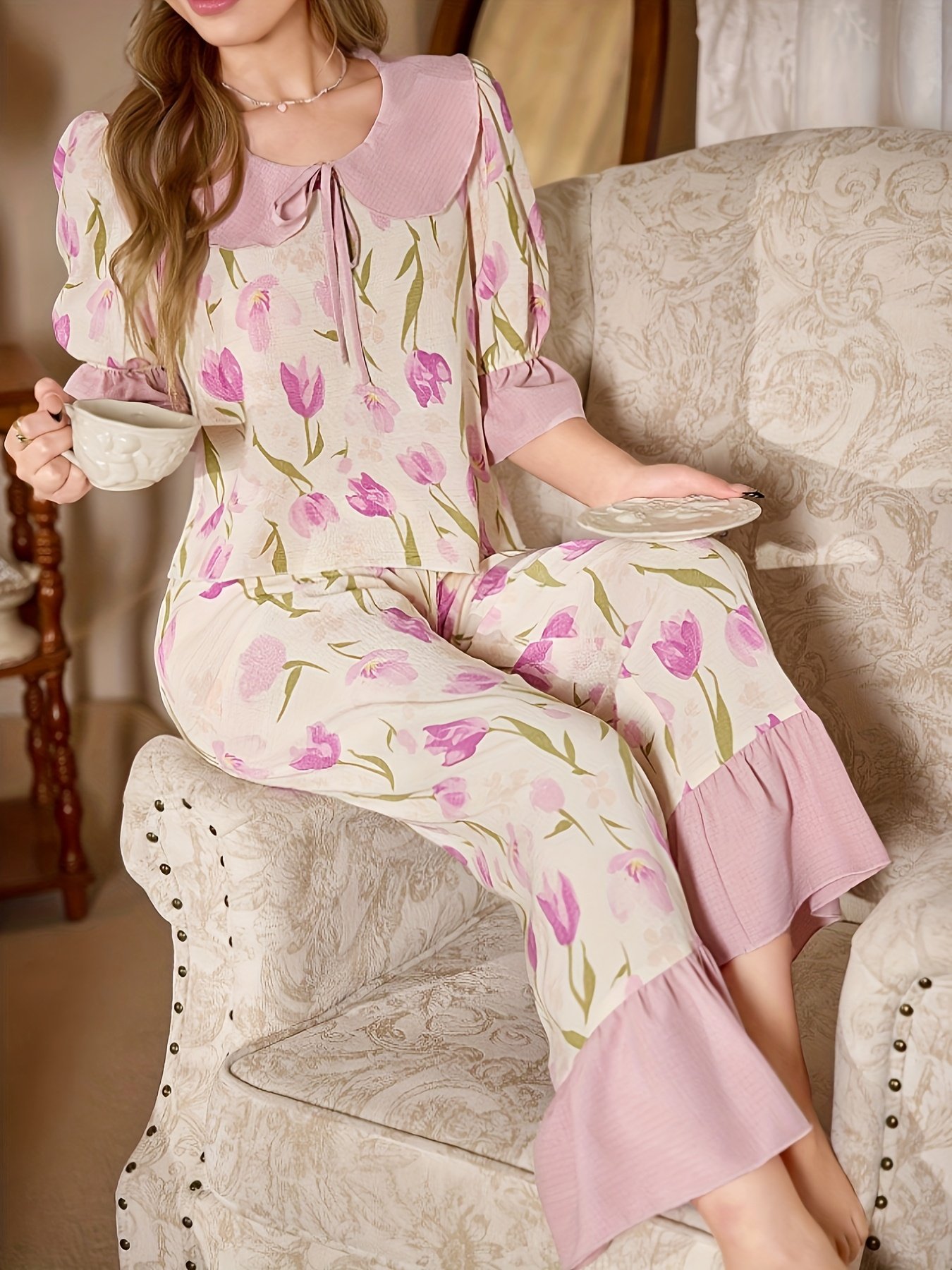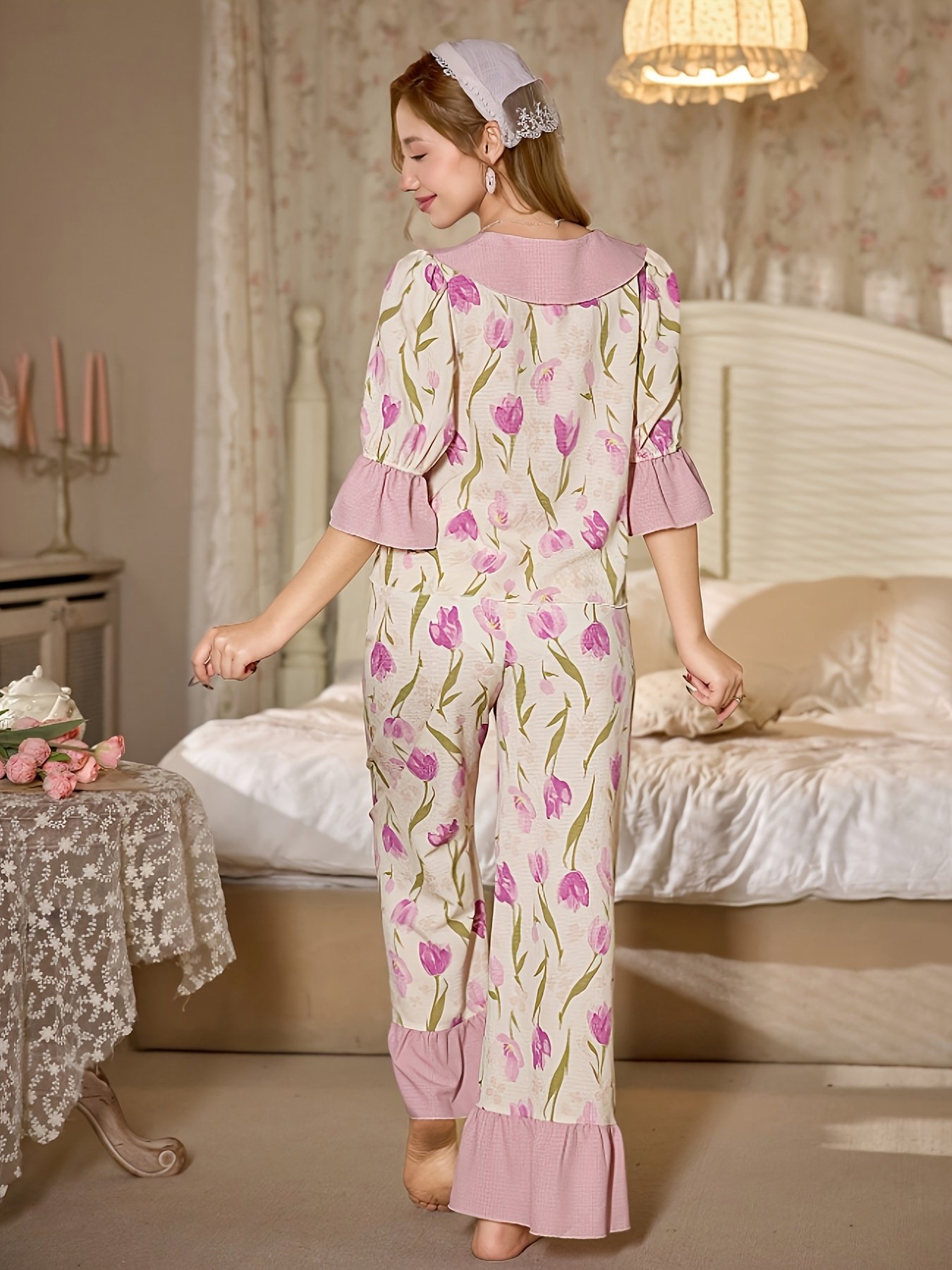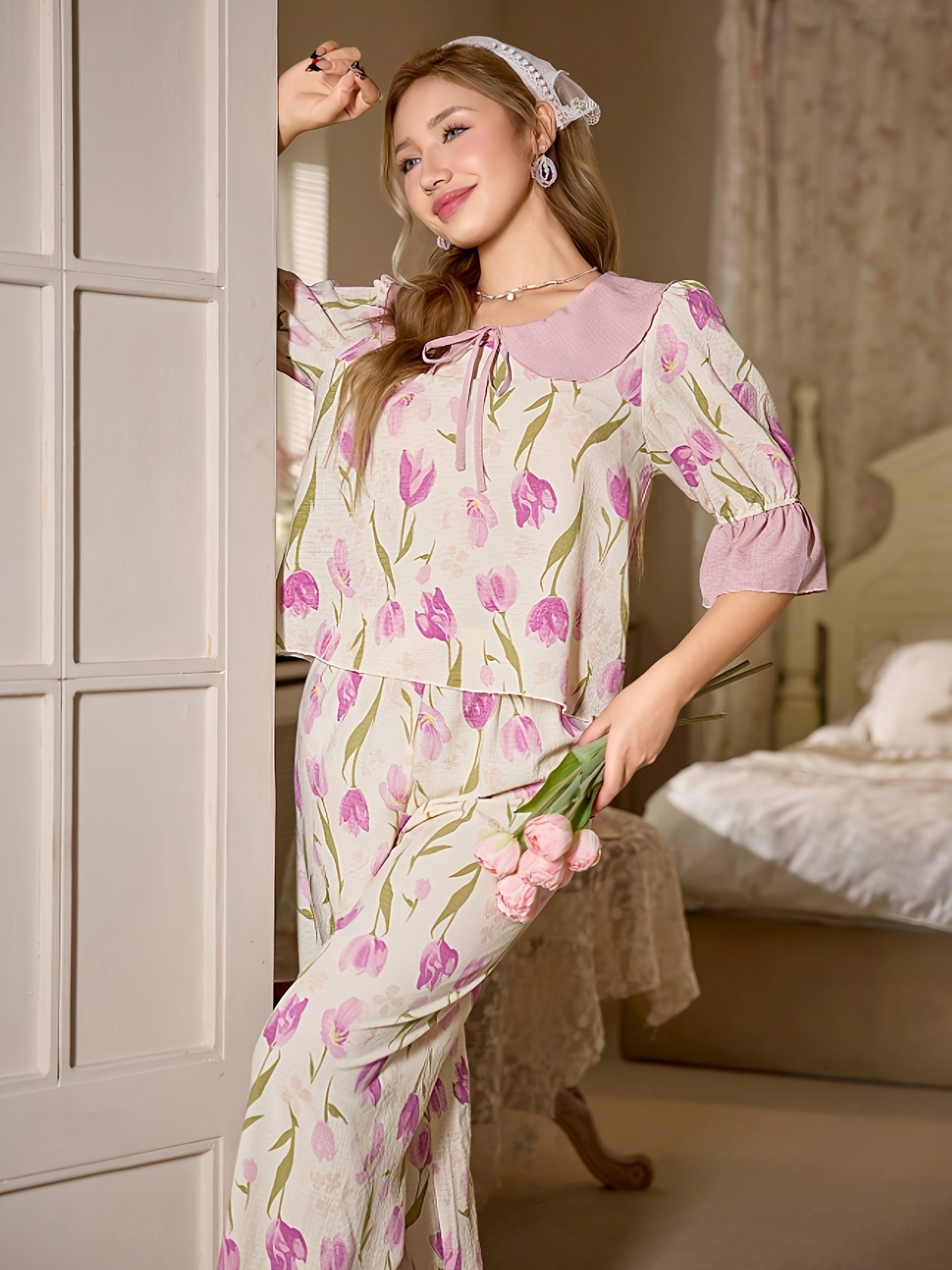 - עיצוב מודרני ואלגנטי: מאופיין בהדפס פרחוני קסום ובעיצוב "Color Block" אלגנטי, המוסיף נופך של חיוניות ומשיכה. עם צווארון עגול קלאסי ושרוולים קצרים, הסט מושלם עם מכנסיים ארוכים המוסיפים נופך של יוקרה, מה שהופך אותו למתאים למגוון זמנים בבית.