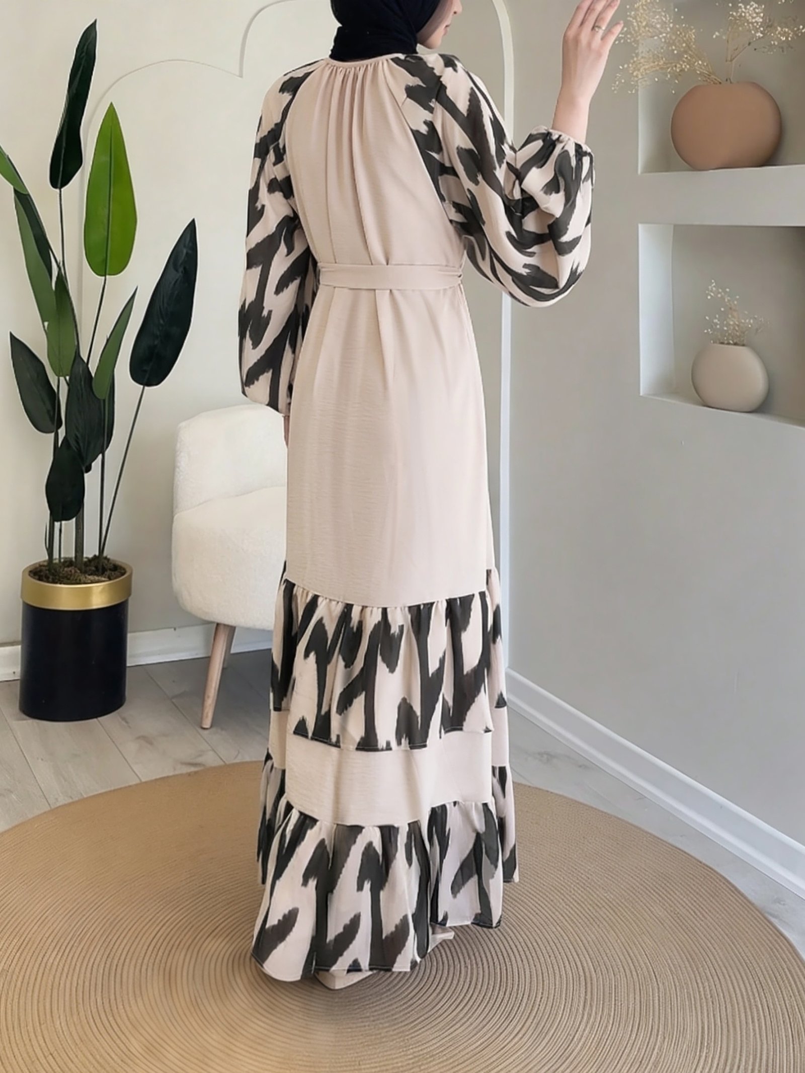 - עיצוב גאומטרי ייחודי: משלב בין גווני בז' ושחור אלגנטיים בדוגמה גאומטרית מודרנית, המוסיפה למראה שלך נגיעה של תחכום וייחודיות בהשראת אמנויות המזרח.