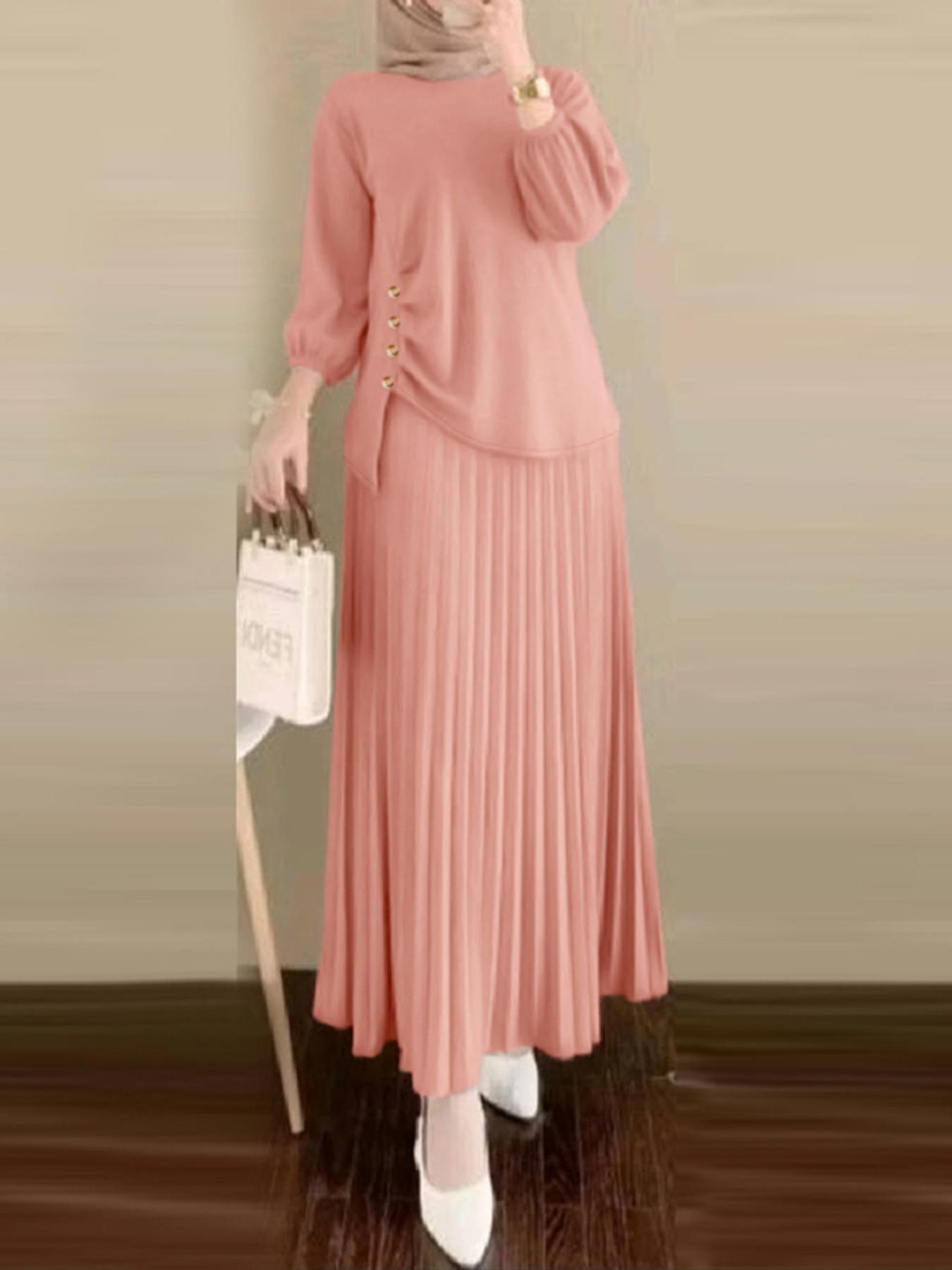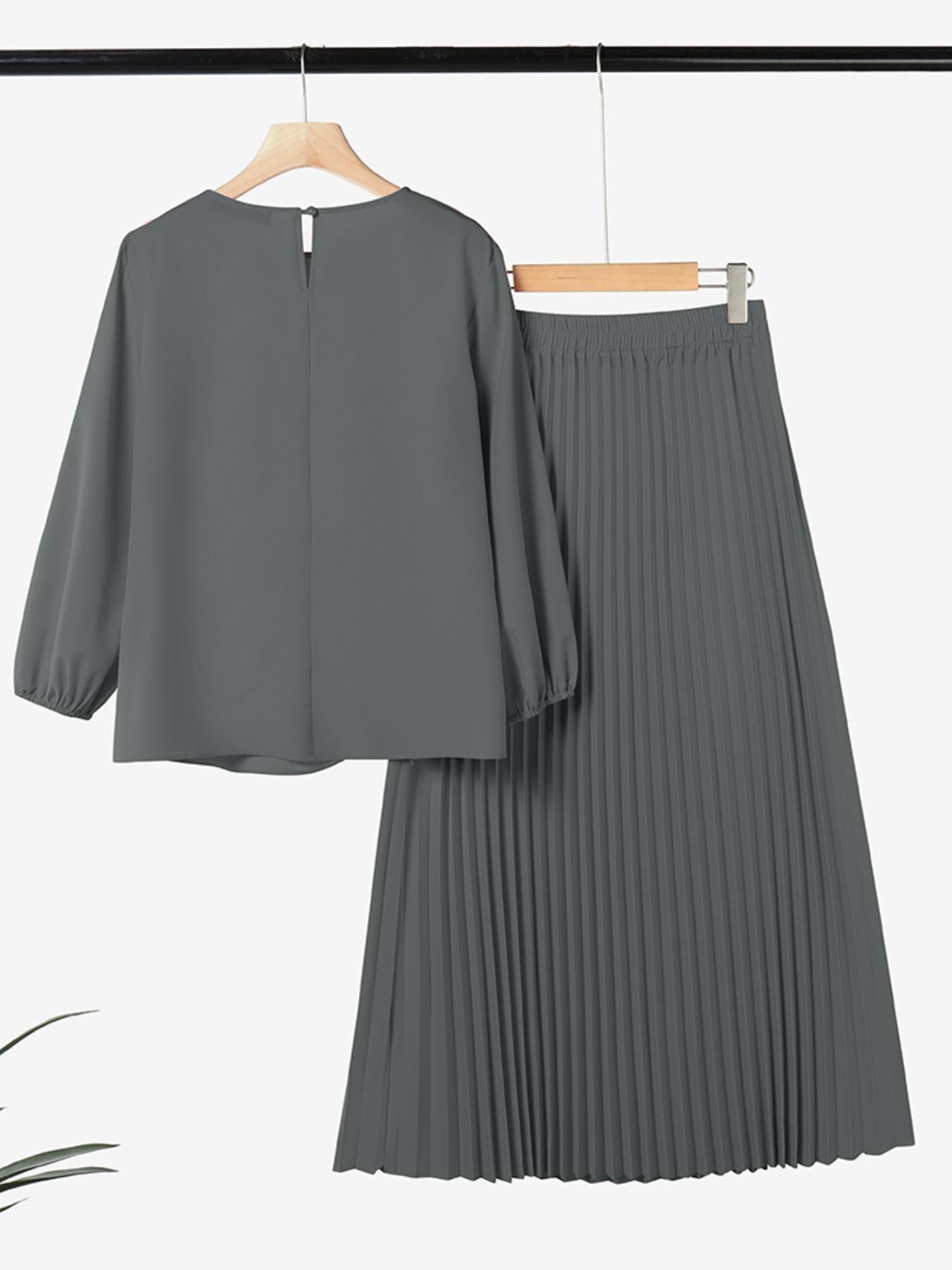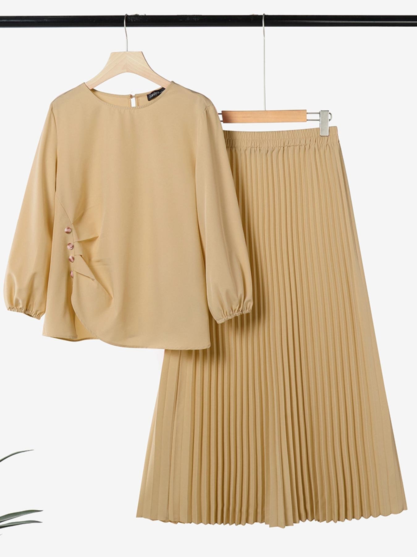 - עיצוב ייחודי ועדכני: הסט מורכב מחולצה אלגנטית עם צווארון עגול קלאסי ושרוולי פנס שלושה רבעים, בנוסף לחצאית רחבה בגזרת A-line ופרטי קפלים מקסימים, כדי להעניק לך מראה ייחודי ועדכני.