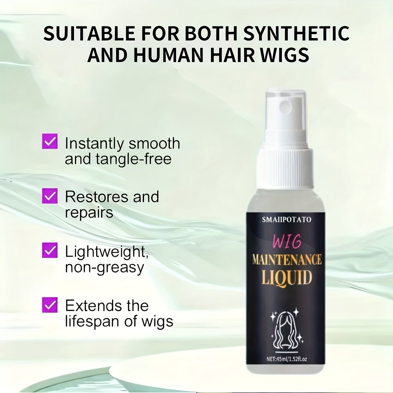 - אידיאלי לפאות סינתטיות: פורמולה שפותחה במיוחד כדי להתאים לכל סוגי סיבי השיער הסינתטיים, שומרת עליהם ומאריכה את תוחלת חייהם, והופכת אותם לטבעיים ומבריקים.