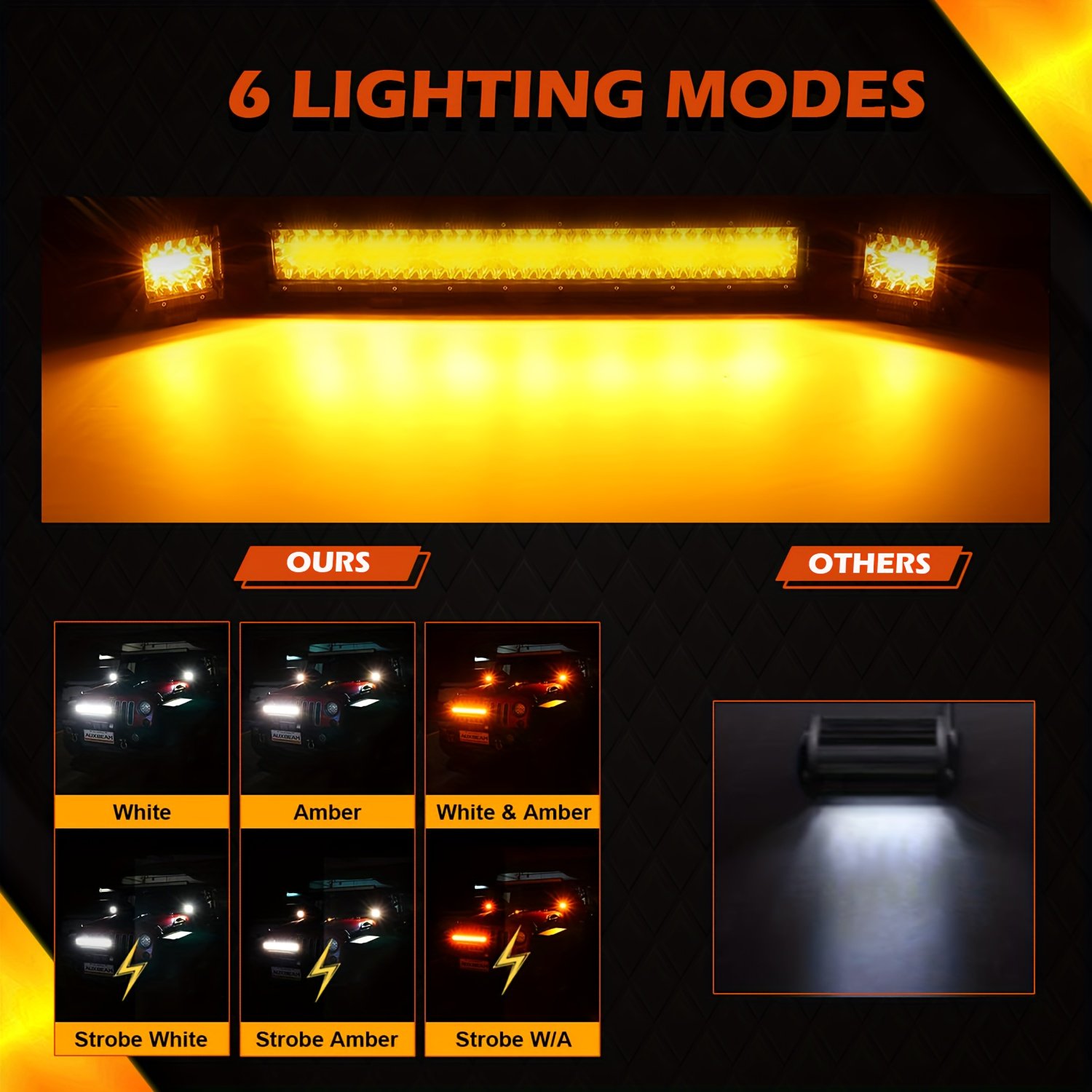 • תאורה כפולה עם 6 מצבים ניתנים להחלפה: בחר בחופשיות בין תאורה לבנה וטהורה לראייה עמוקה במיוחד, ותאורה צהובה חזקה לחדירה יעילה דרך ערפל כבד ואבק, עם 6 מצבי תאורה שונים המתאימים לכל תנאי מזג האוויר והשטח.