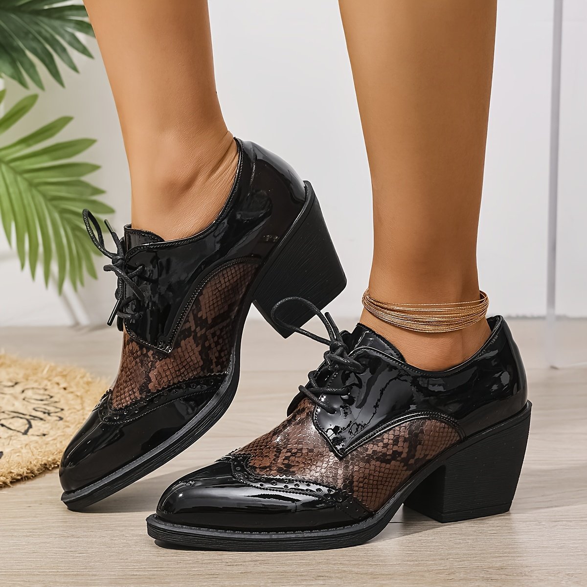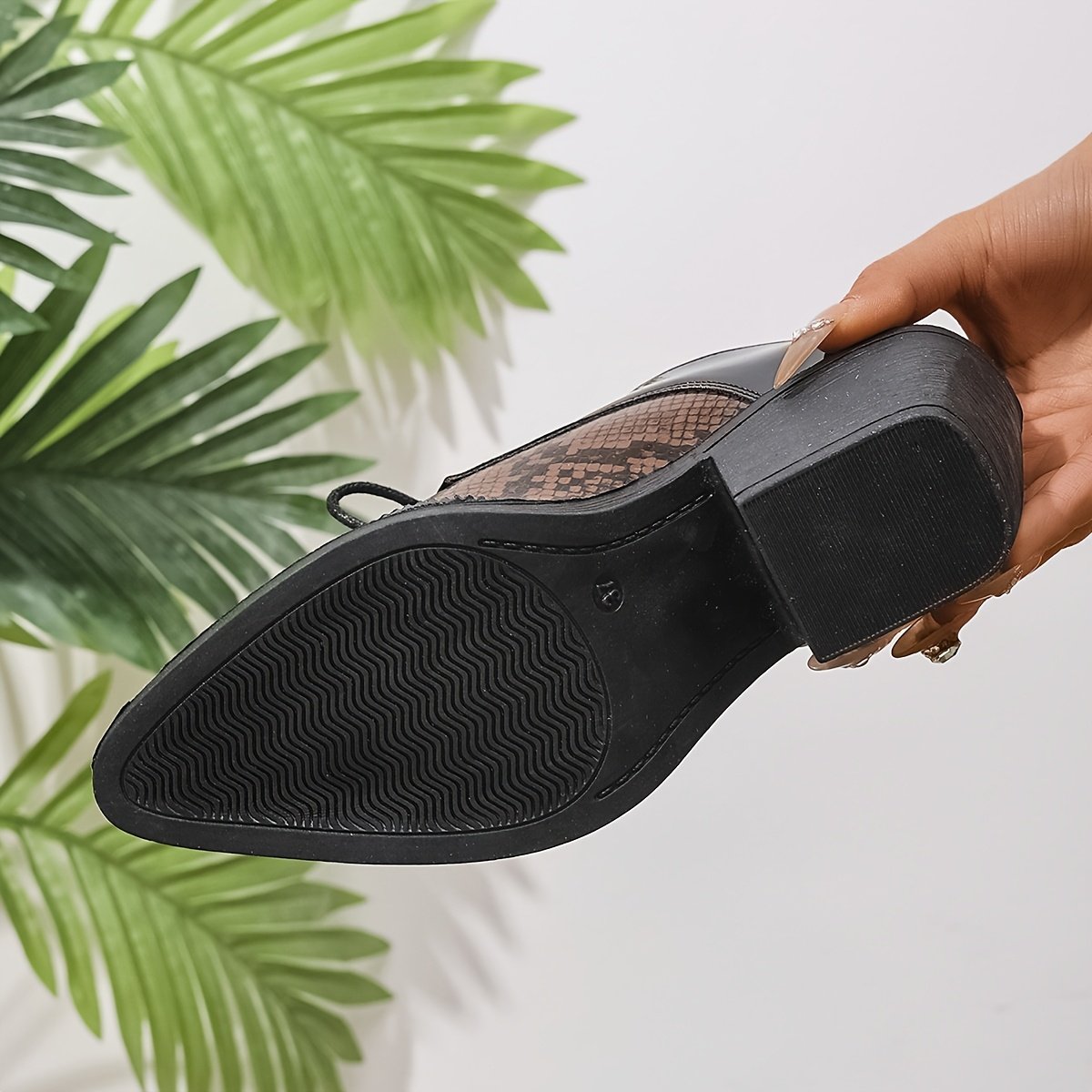 - הדפס עור נחש נועז ורקמת "ברוג" קלאסית: שילוב ייחודי המשלב את היוקרה של הדפס הנחש האופנתי עם פרטי "ברוג" מדויקים, ליצירת עיצוב הממזג במיומנות מורשת ומודרניות.