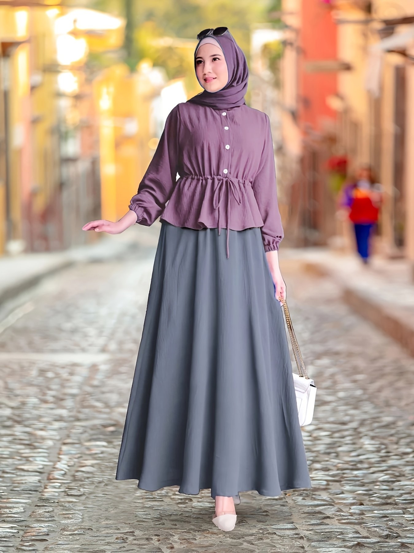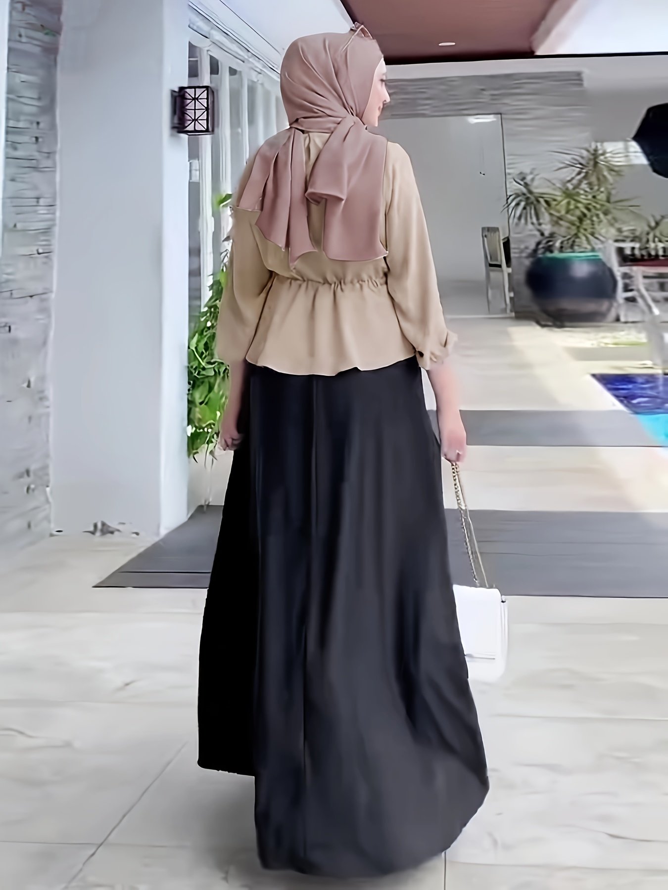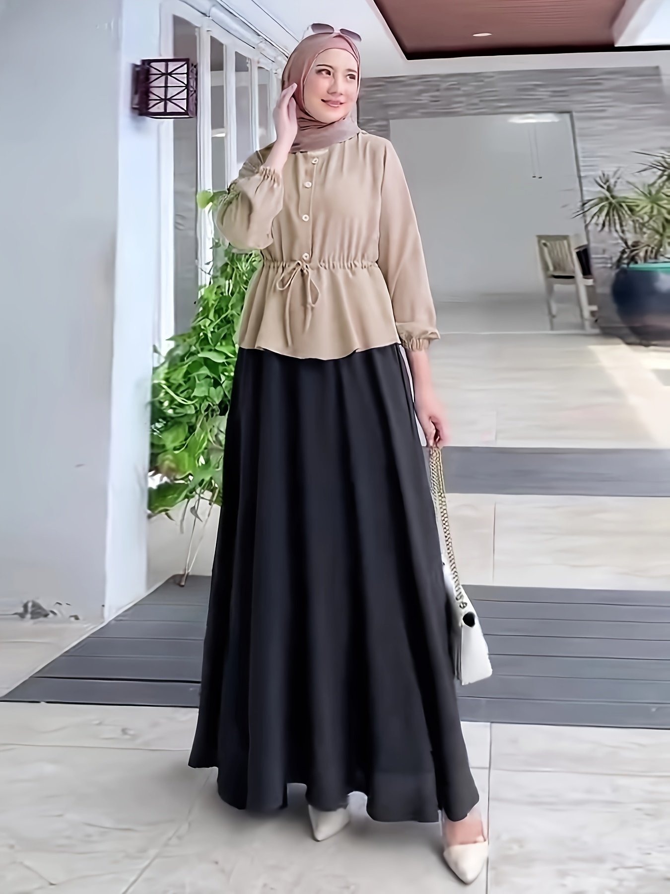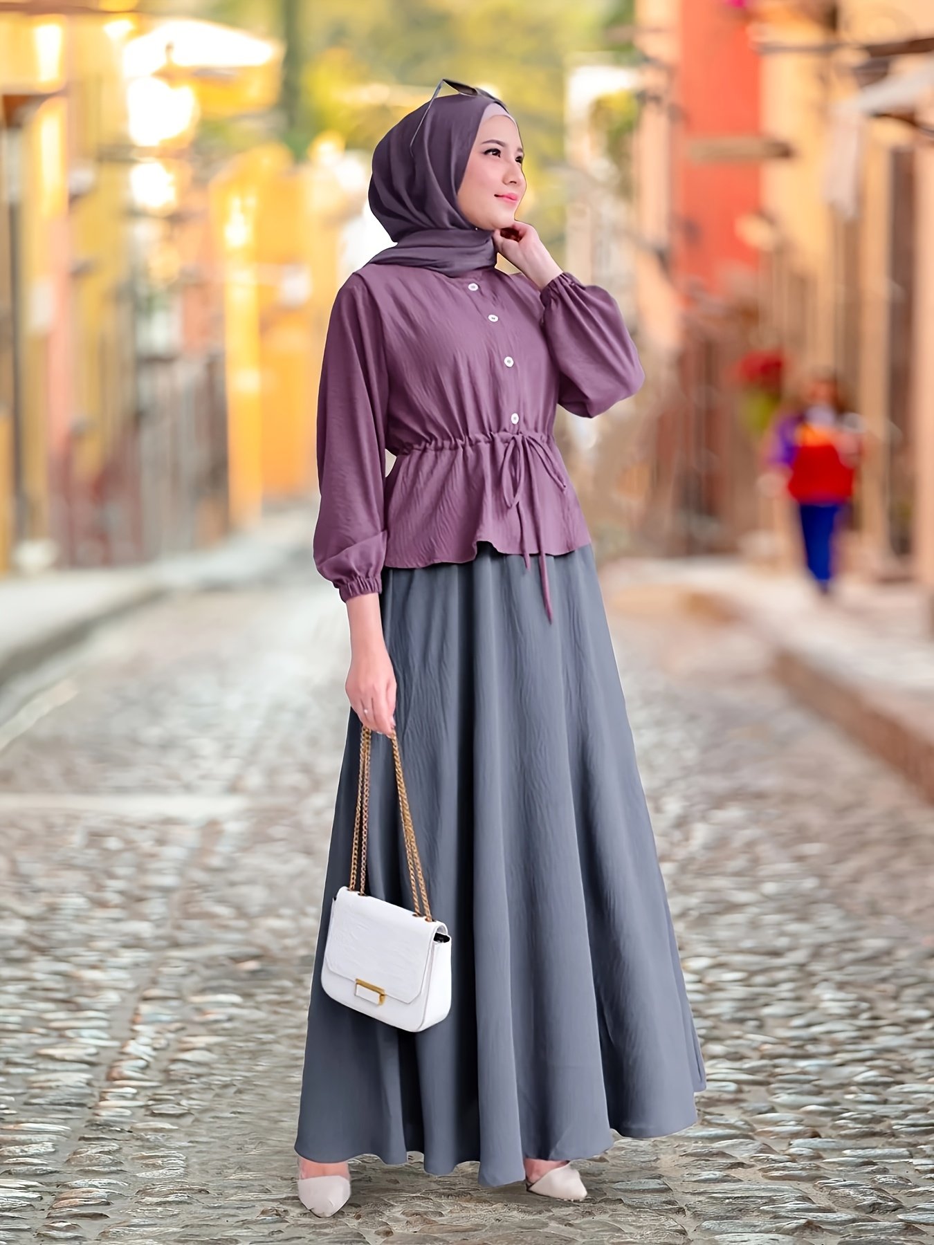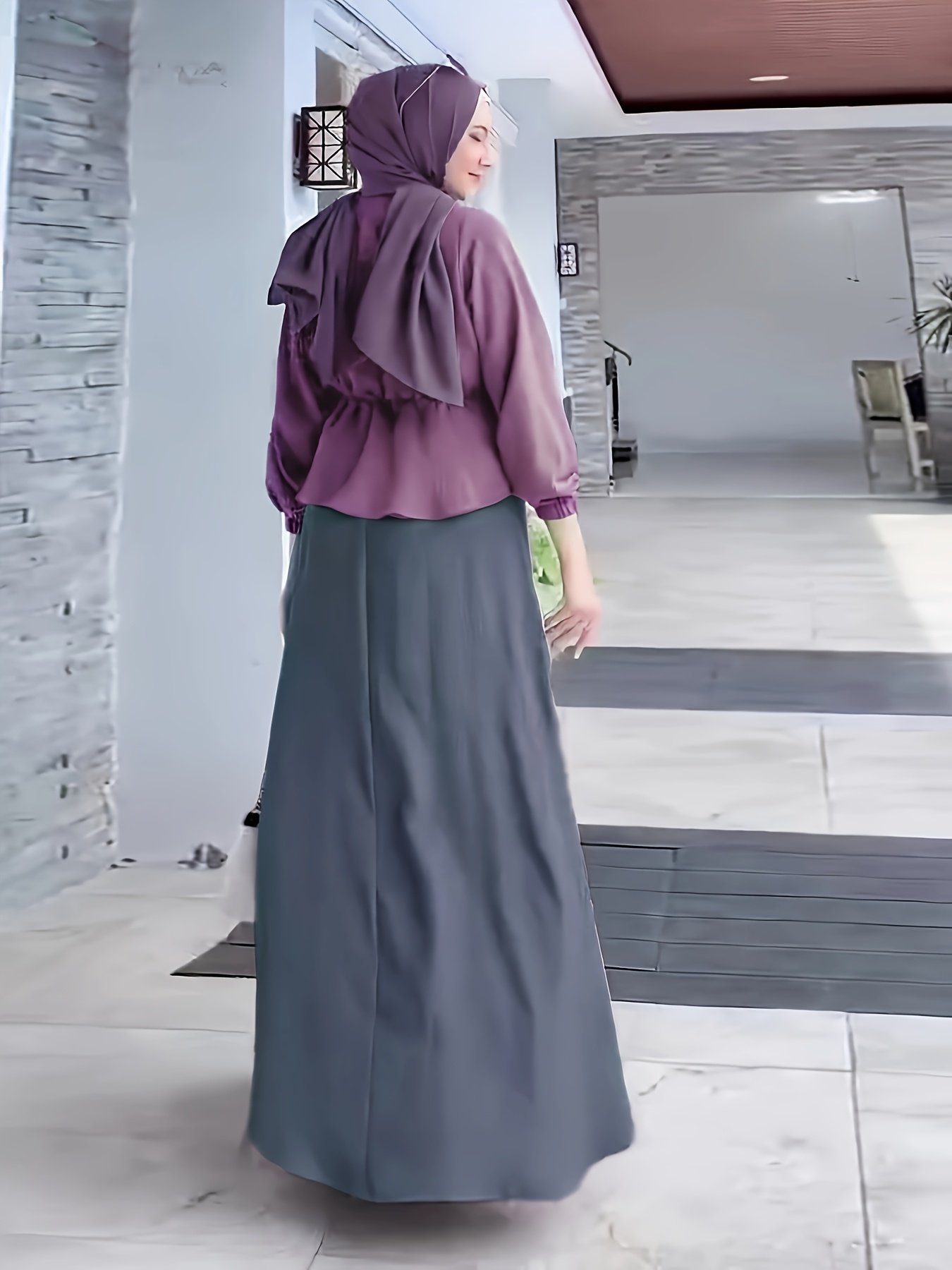 - אלגנטיות צנועה ועכשווית: הסט מורכב מחולצה אלגנטית וחצאית ארוכה בעיצוב H-contour המבטיח כיסוי מלא ומראה יוקרתי ונוח המתאים לכל אירוע.