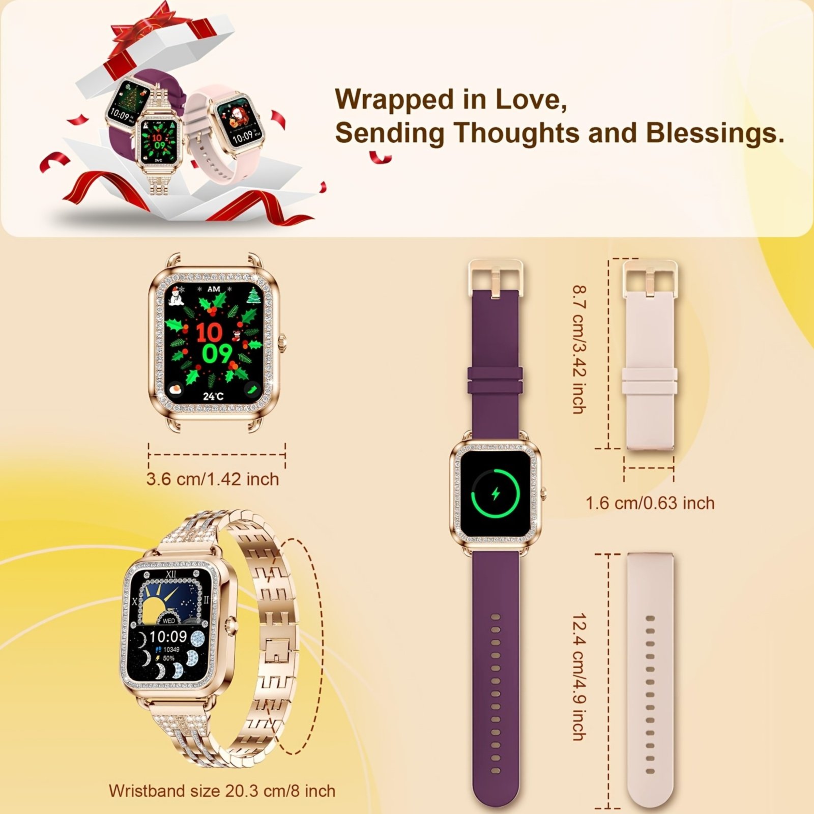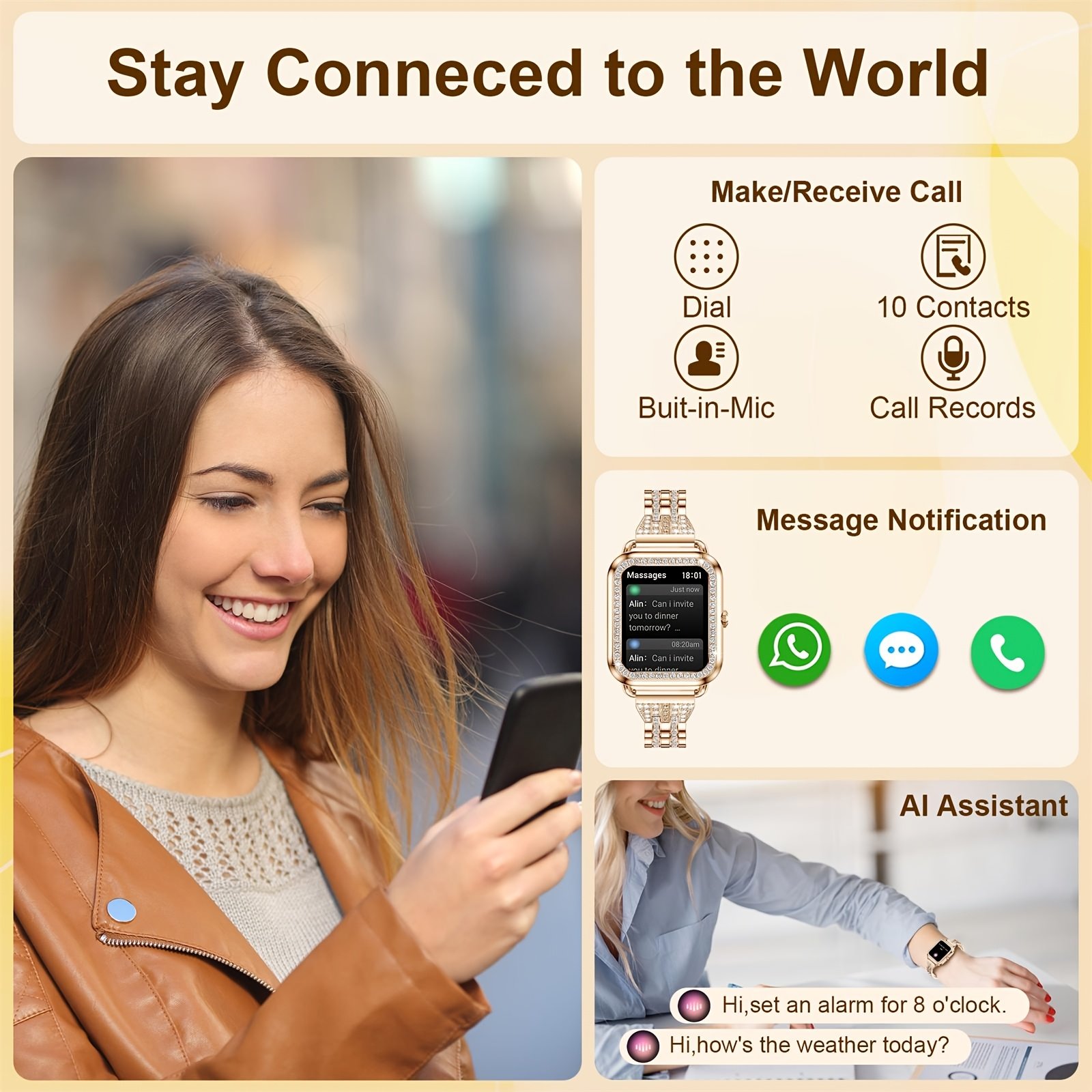 לכל אישה מודרנית שמחפשת נגיעה של יוקרה המשלבת יופי עוצר נשימה וטכנולוגיה מתקדמת, אנו מציגים לך את השעון החכם המוזהב המעוצב במיוחד כדי לענות על שאיפותייך. הפכי כל רגע ביום שלך למאורגן יותר, אלגנטי וחיוני עם האביזר הייחודי הזה המתעלה מעל גבולות השעונים המסורתיים ומניח את עולמך בין ידייך.