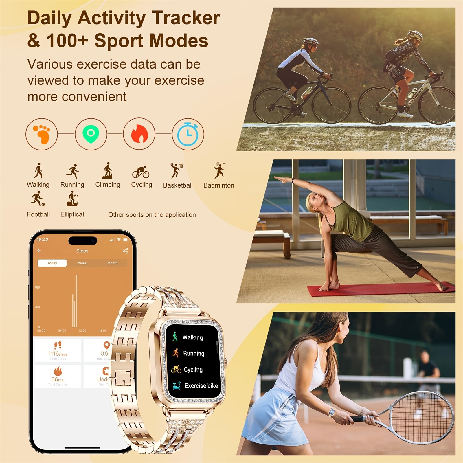 - הבת לוויה שלך לכושר ובריאות: עקבי אחר צעדייך, קלוריות שנשרפו, והמרחק שעברת בדיוק. עם למעלה מ-100 מצבי ספורט שונים, תמצאי תמיכה מלאה לכל פעילות שאת מבצעת, מה שיעזור לך להשיג את יעדי הבריאות שלך.