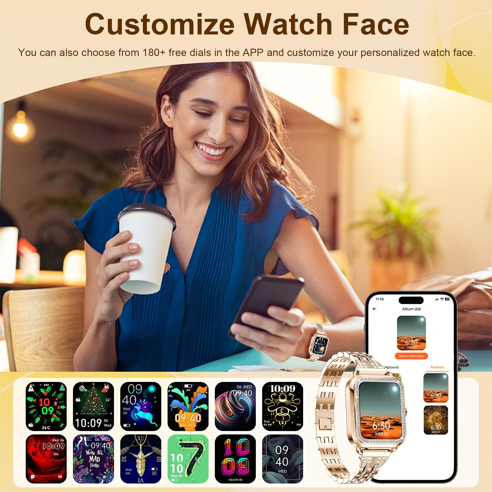 - מסכי תצוגה ניתנים להתאמה אישית: בחרי מבין מגוון רחב של פני שעון אטרקטיביים כדי להתאים לטעמך ולמצב רוחך, והפכי את השעון שלך לשקף את אישיותך הייחודית.