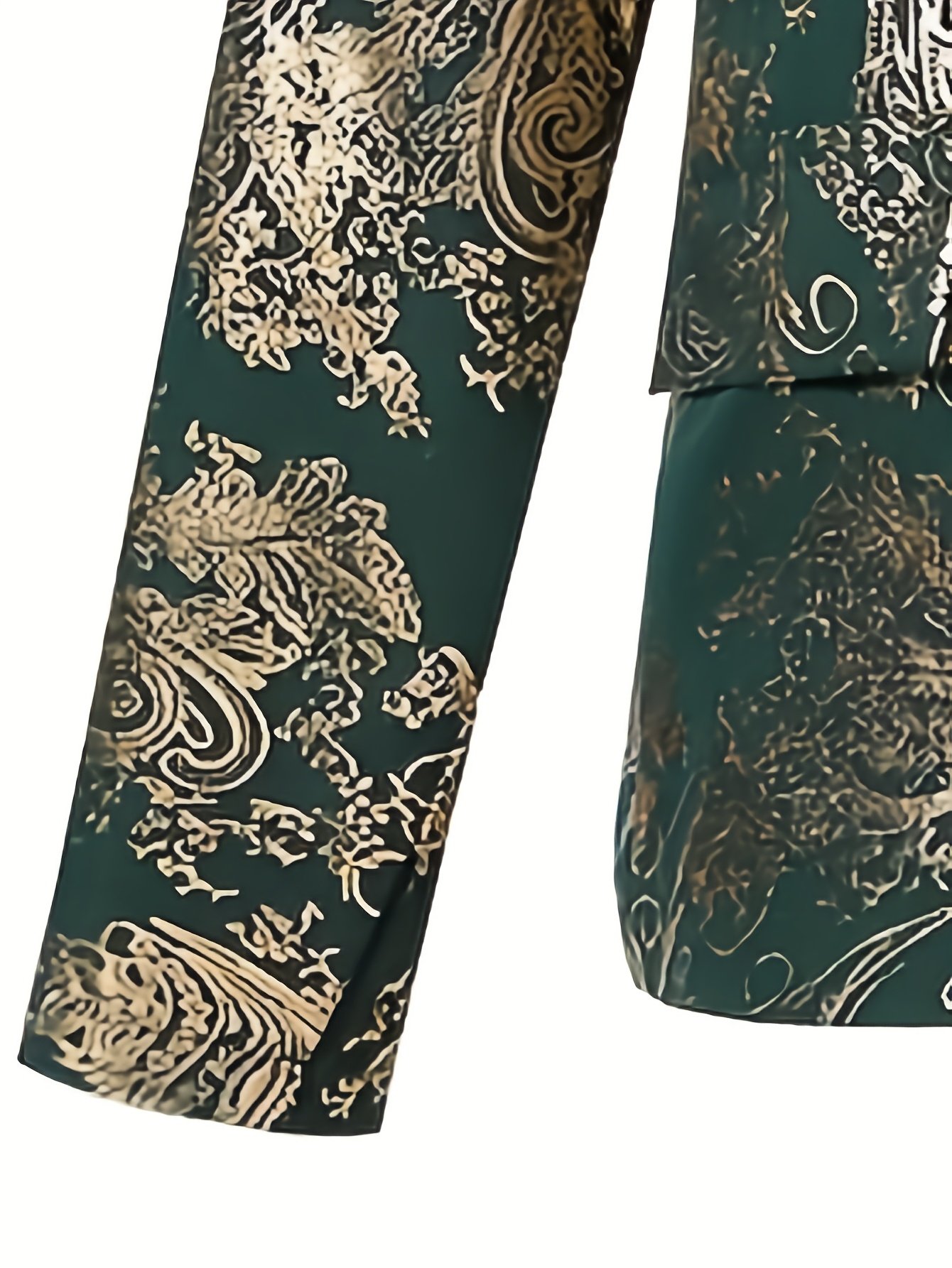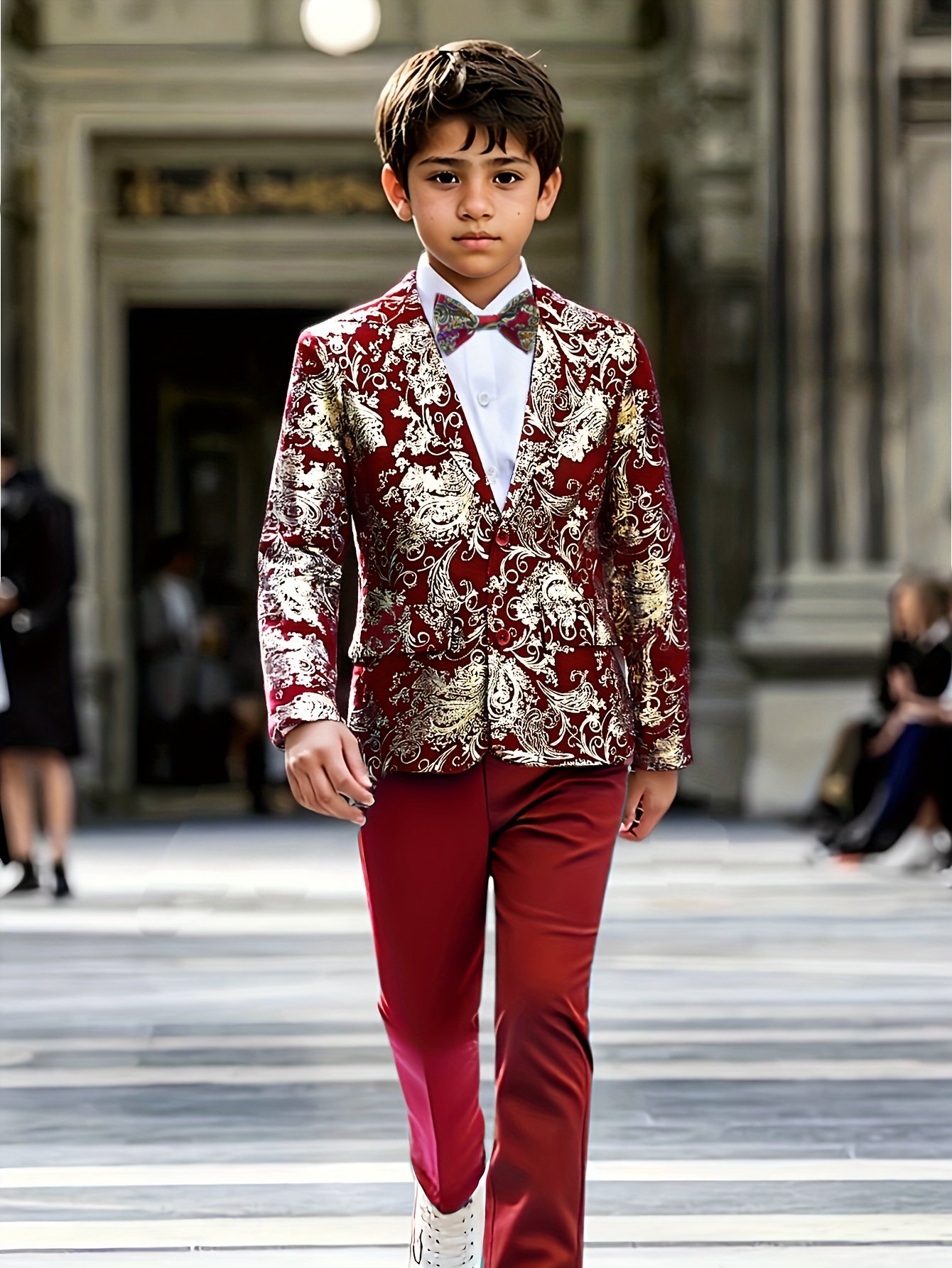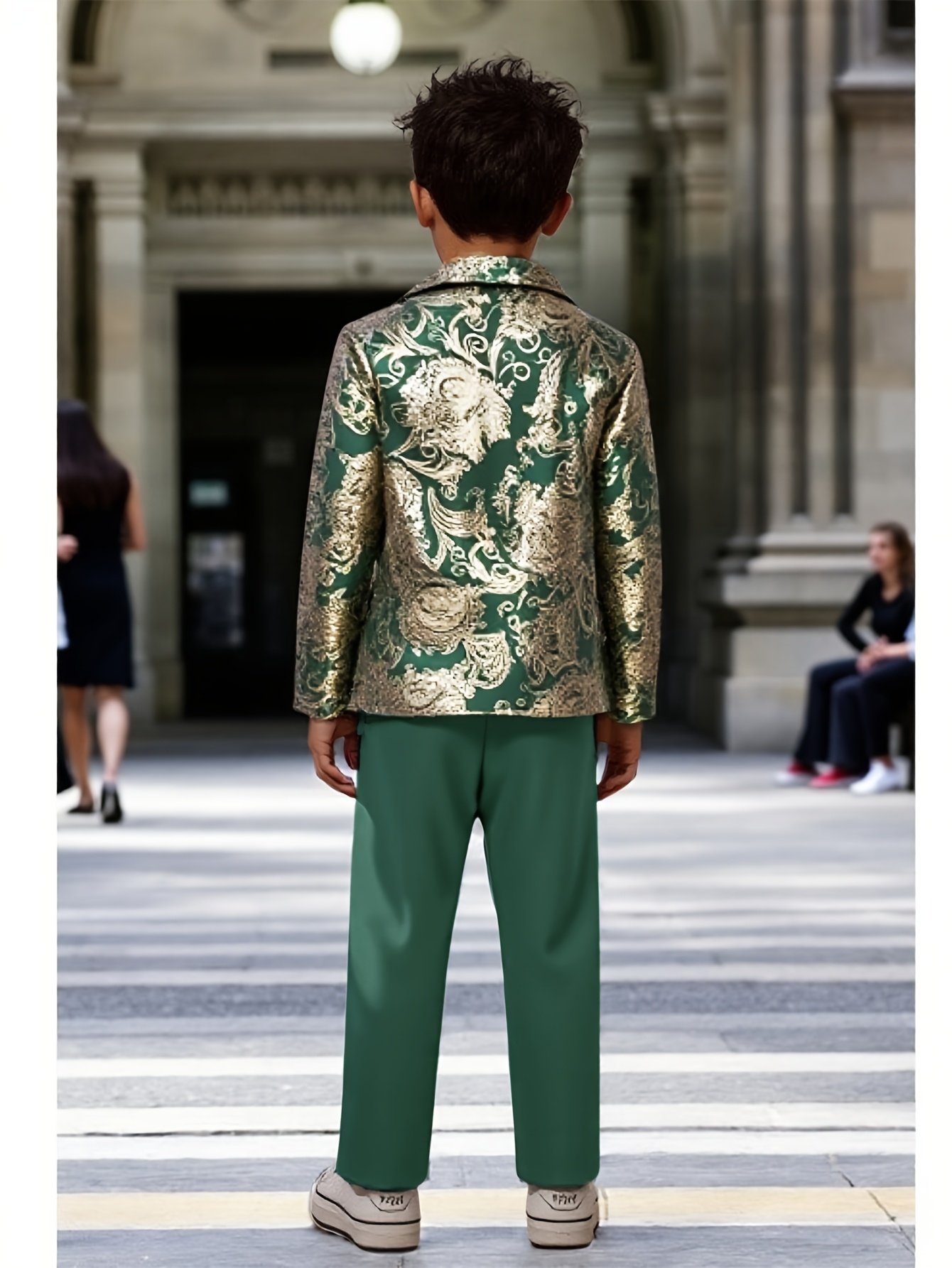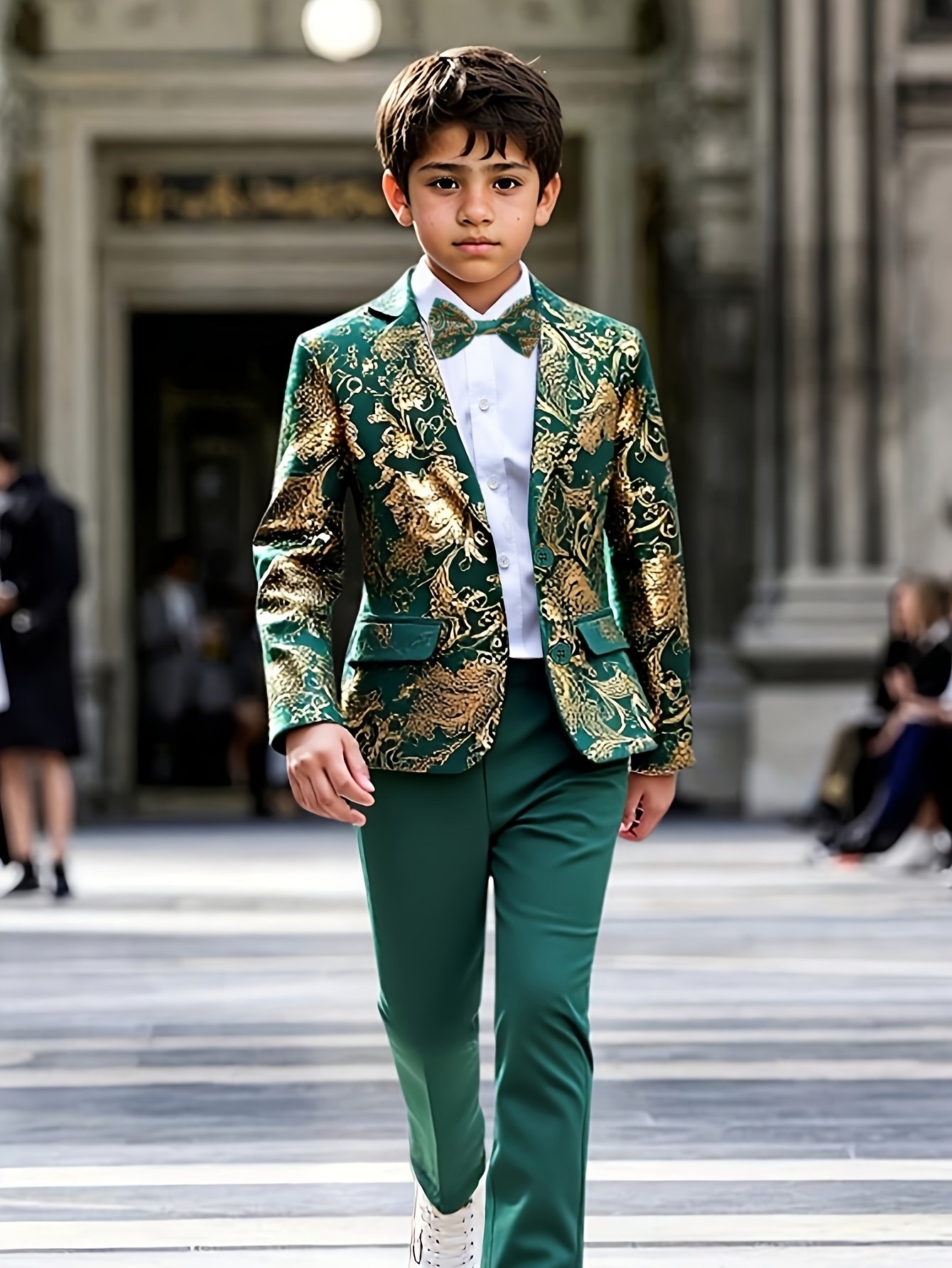 הפוך את נסיכך הקטן לזהור בכל אירוע עם חליפה יוקרתית זו! עיצוב המשלב אלגנטיות עכשווית עם מגע יוקרתי, כדי להבטיח לילדך הופעה בלתי נשכחת במסיבות, חתונות או כל אירוע מיוחד. תן לקטנך לגנוב את ההצגה עם הפרטים הזהובים המקסימים שלה על בד ירוק אלגנטי, המציעה שילוב מושלם של תחכום ונוחות.