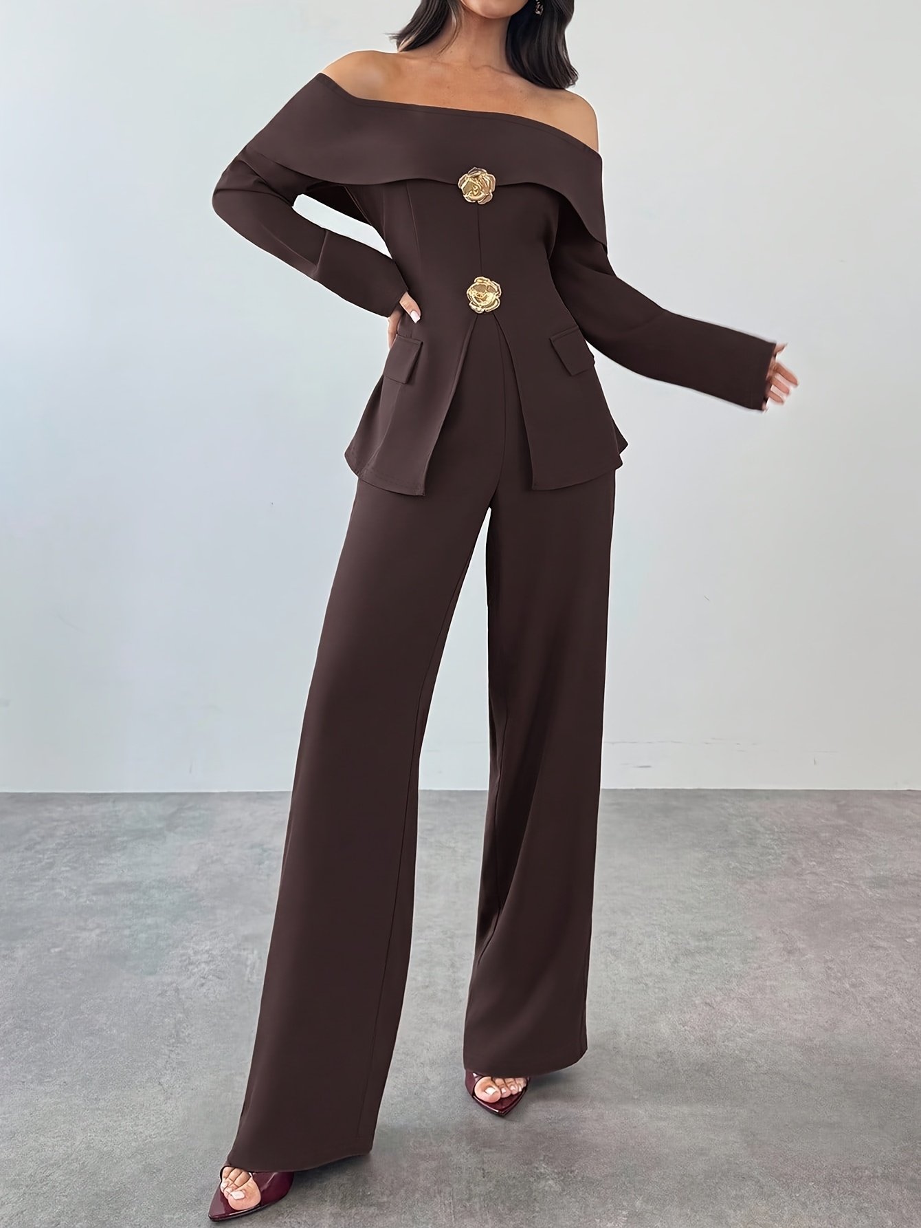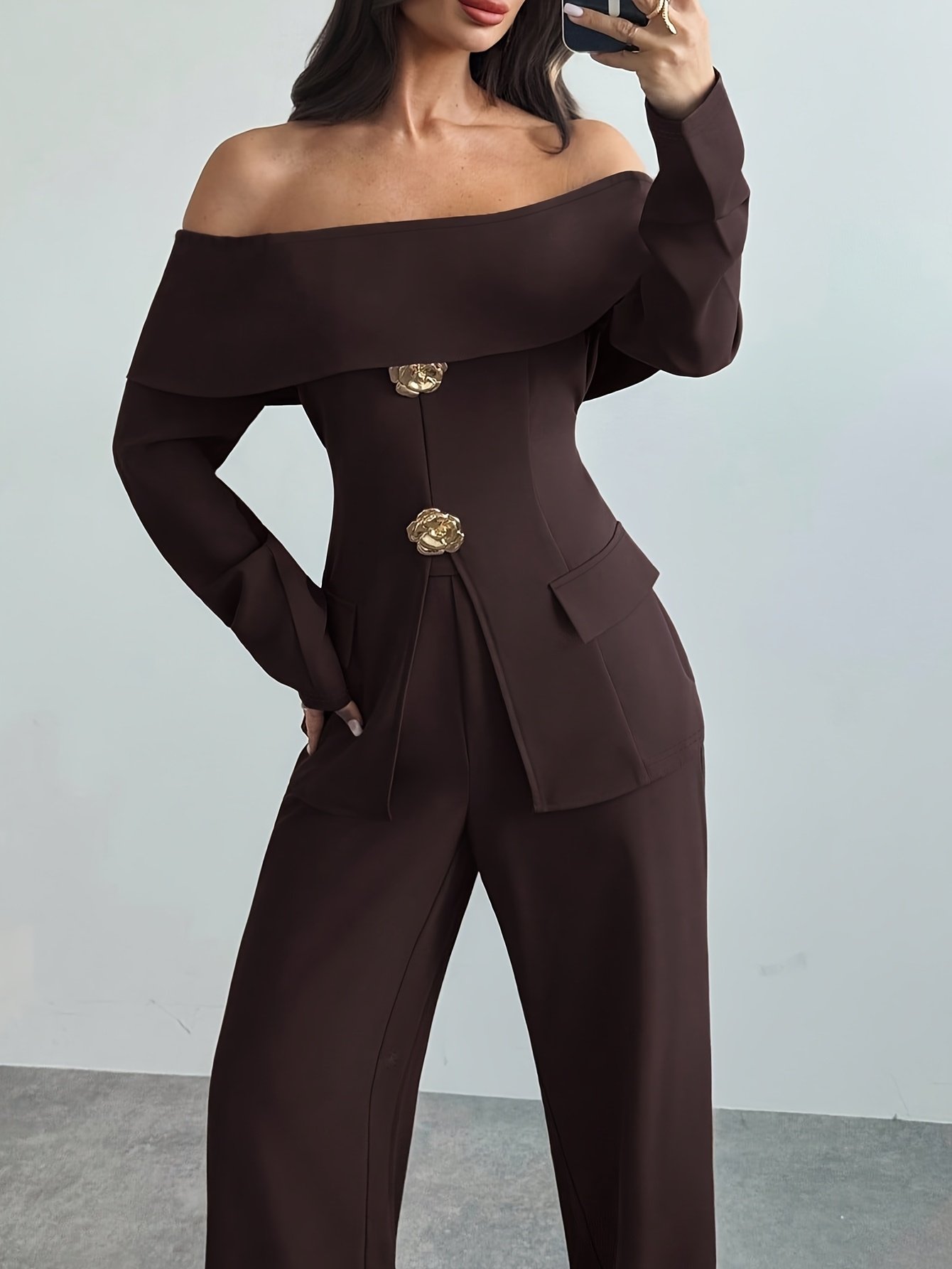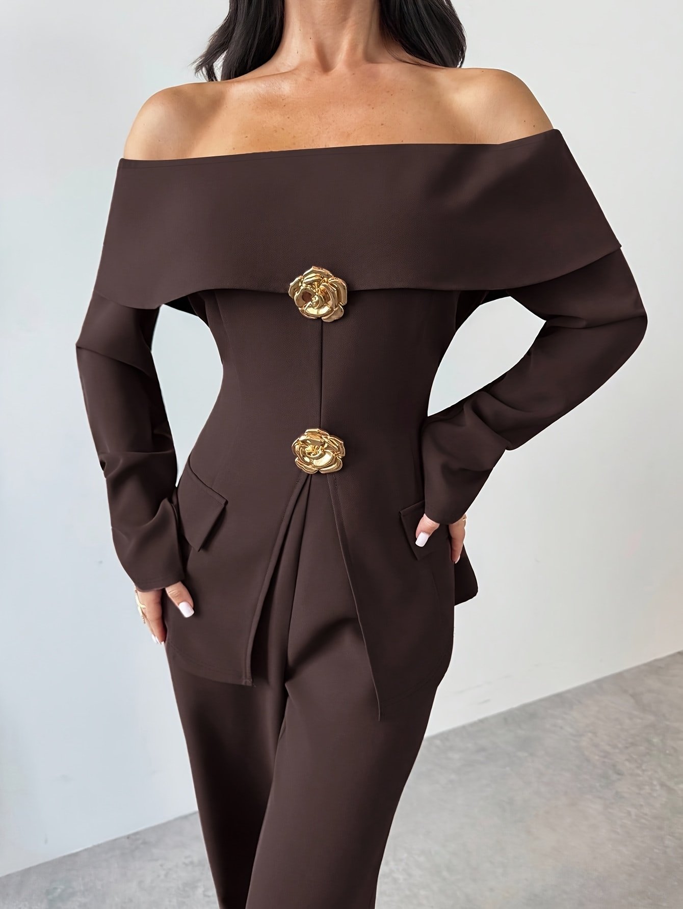 - עיצוב מודרני ואלגנטי: מתאפיין בגזרת כתף חשופה מושכת ושרוולים ארוכים ויוקרתיים, עם פרטי כפתורים אלגנטיים וצבע אחיד קל לתיאום, שיעניק לך מראה עכשווי שאינו חסר יוקרה ועידון.