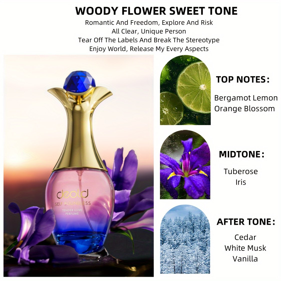 - ניחוחות קסומים: שילוב ייחודי של עצים חמים ופרחים ריחניים מעניק לך ריח מרענן ומושך השובה את החושים ומוסיף מגע של נשיות אלגנטית.