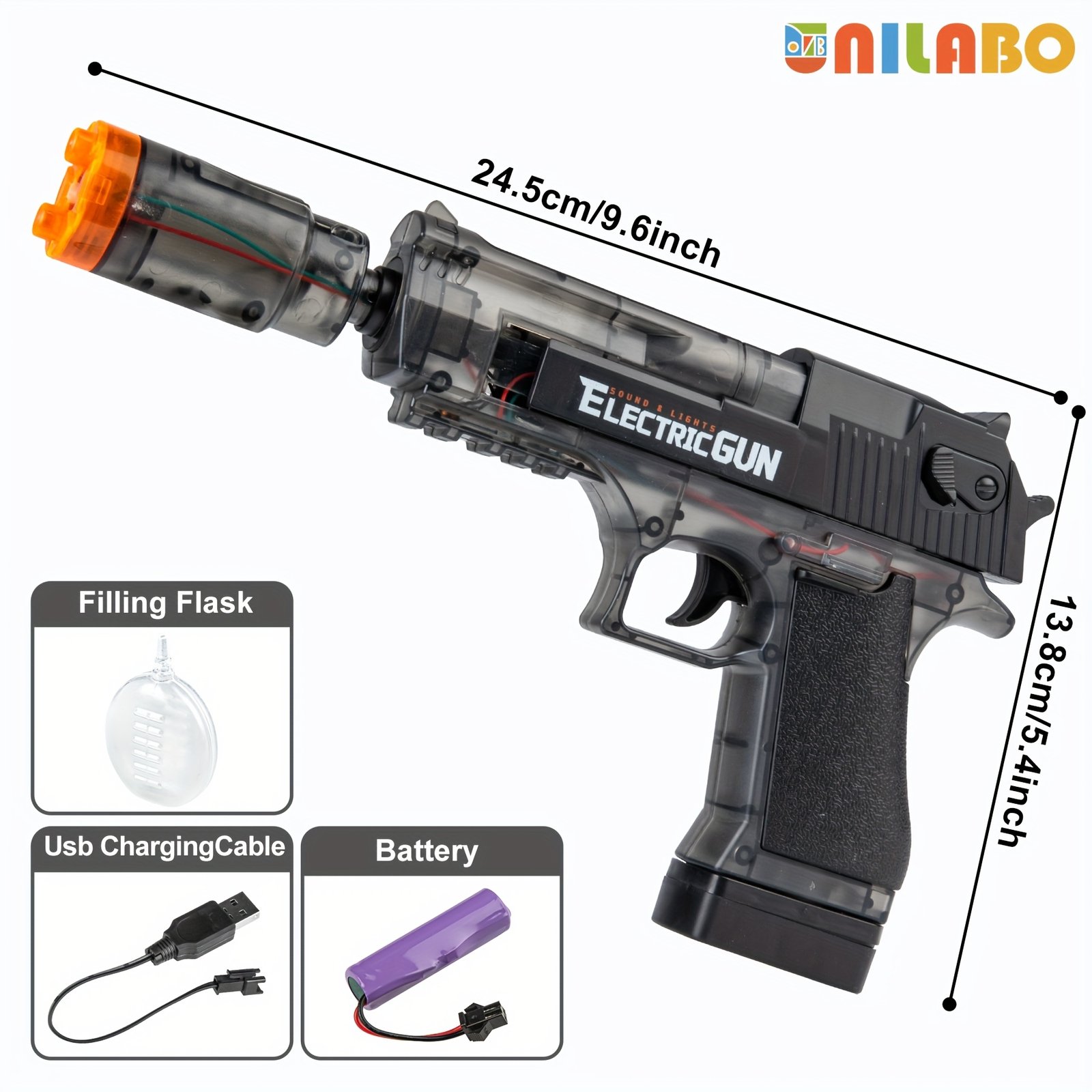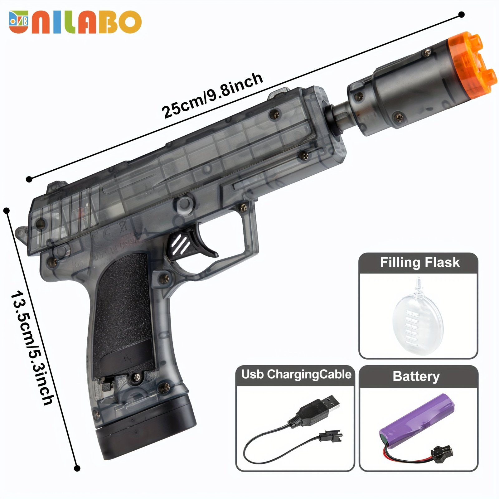 - טעינה קלה ונוחה באמצעות USB: היפרדו לשלום מטרחת הסוללות החוזרת ונשנית! האקדח מתאפיין באפשרות טעינה מהירה וקלה דרך יציאת USB, המספקת לכם ולילדכם נוחות מרבית והמשכיות במשחק ללא הפרעה.