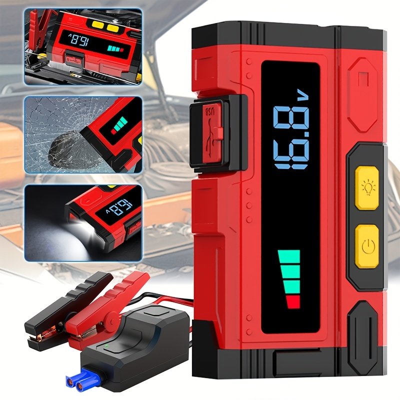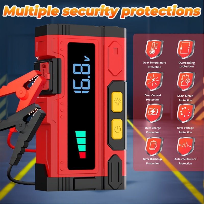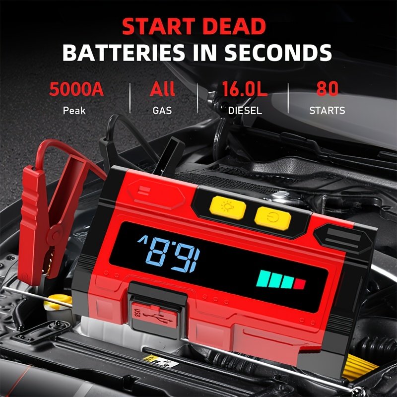 - בוסטר התנעה חירום עוצמתי במיוחד (5000 אמפר): אל תתנו למצבר הרכב המרוקן לעצור אתכם לעולם! הוא מספק דחף כוח אדיר של עד 5000 אמפר להתנעת רוב כלי הרכב בשניות, בין אם הם 12 וולט או 24 וולט.