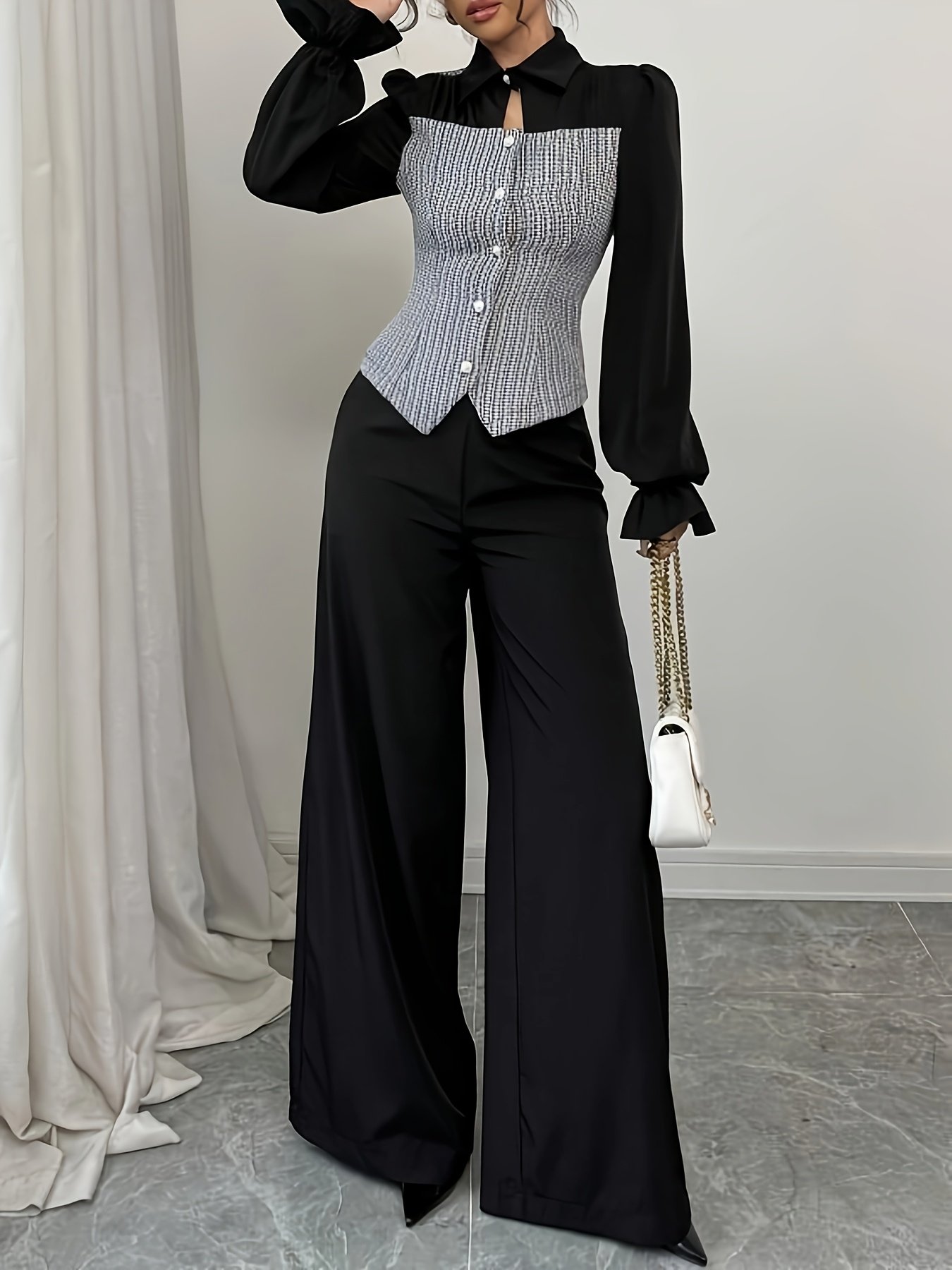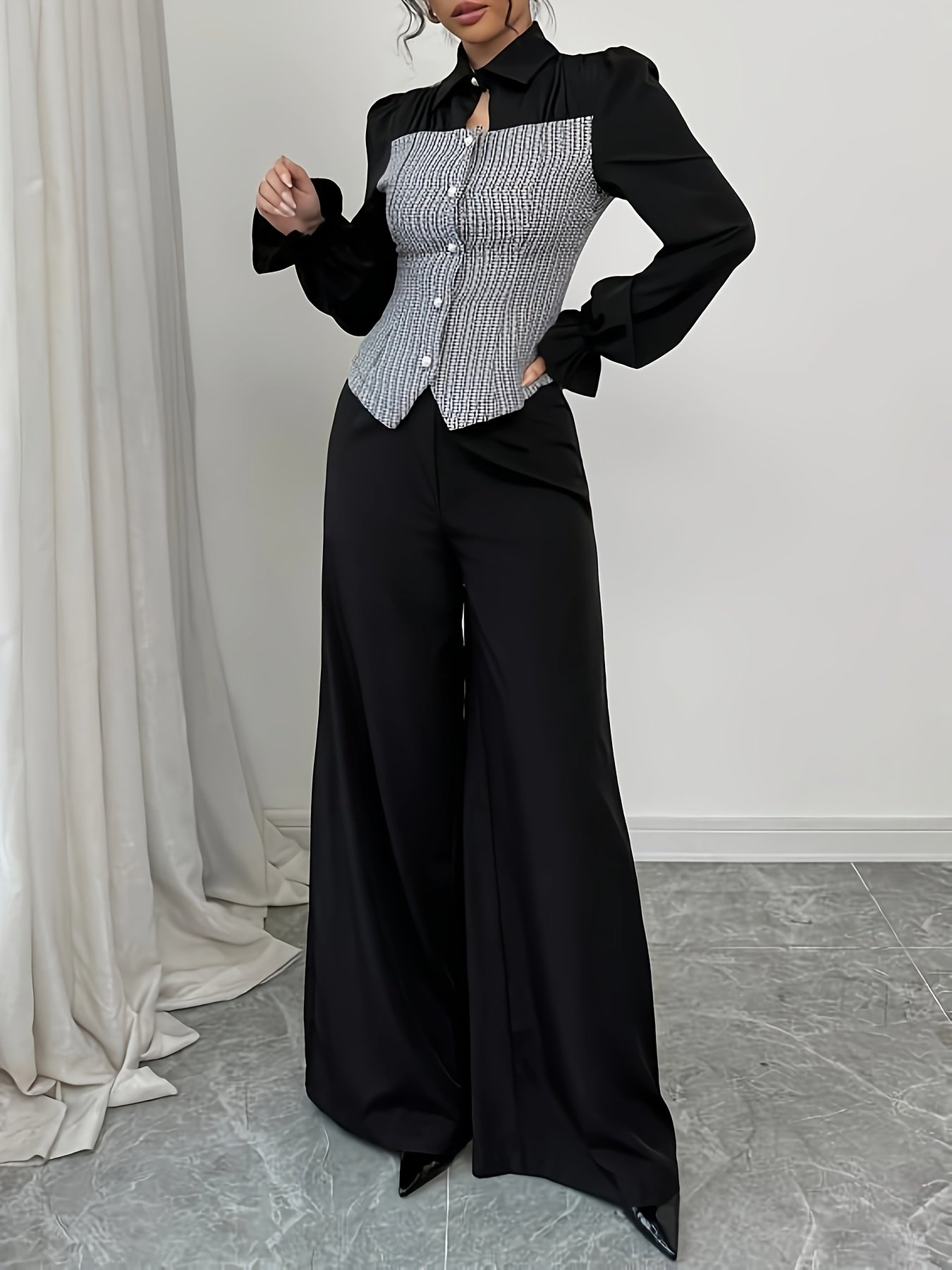 - נוחות וסטייל עם רגליים רחבות: מכנסיים עם מותן גבוה וגזרה רחבה ברגליים מעניקים לך נוחות מוחלטת וחופש תנועה, בתוספת נגיעה של אלגנטיות והדגשת גופך בסגנון שיקי ועכשווי.