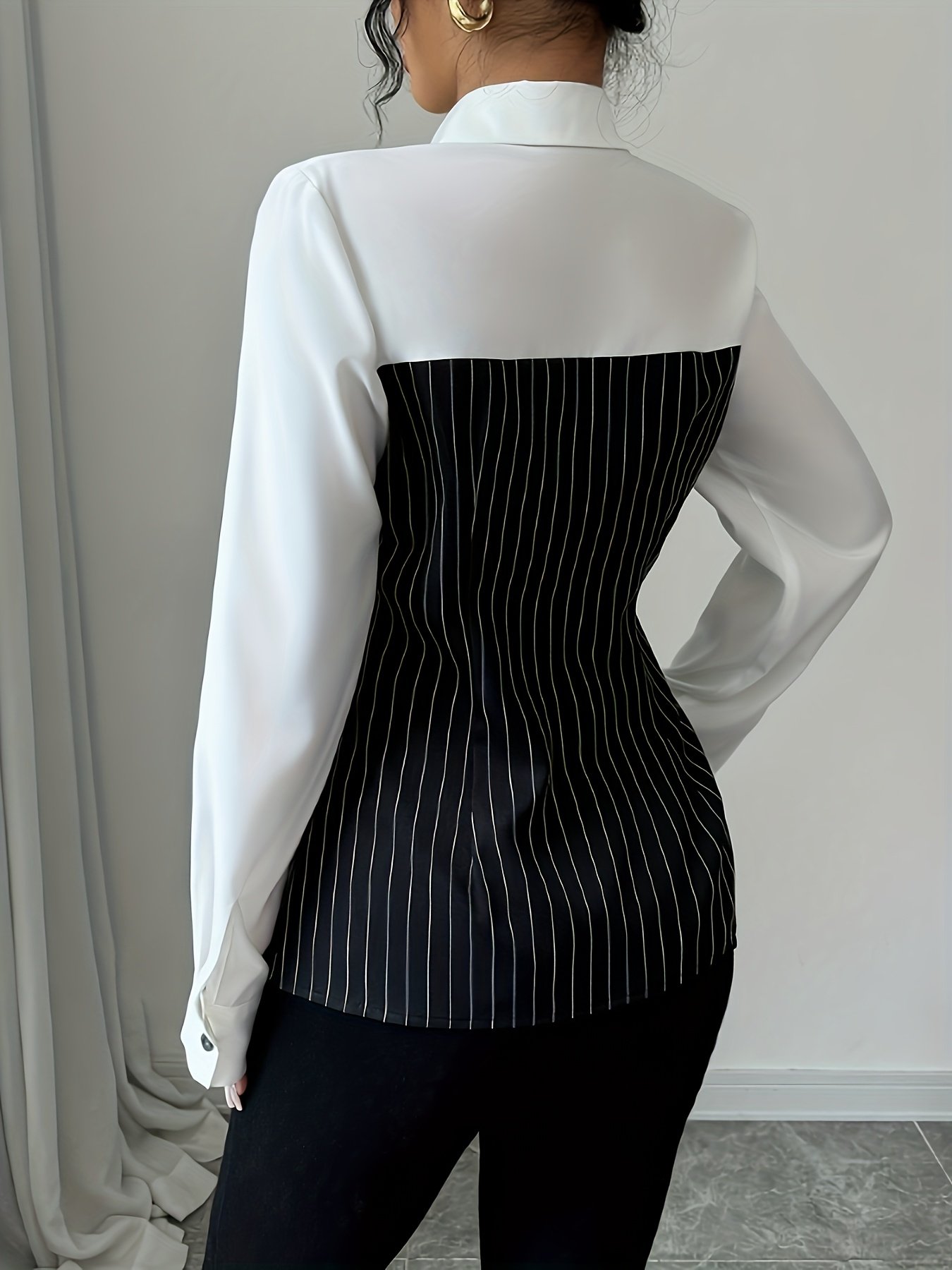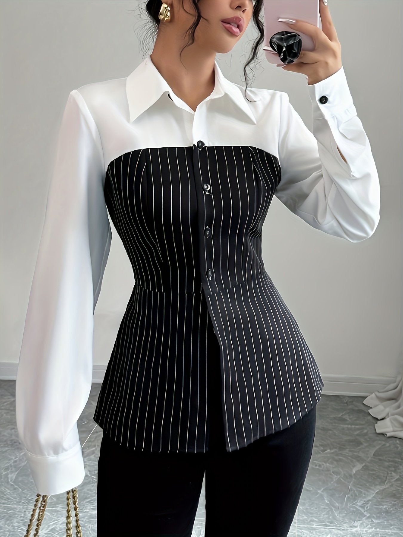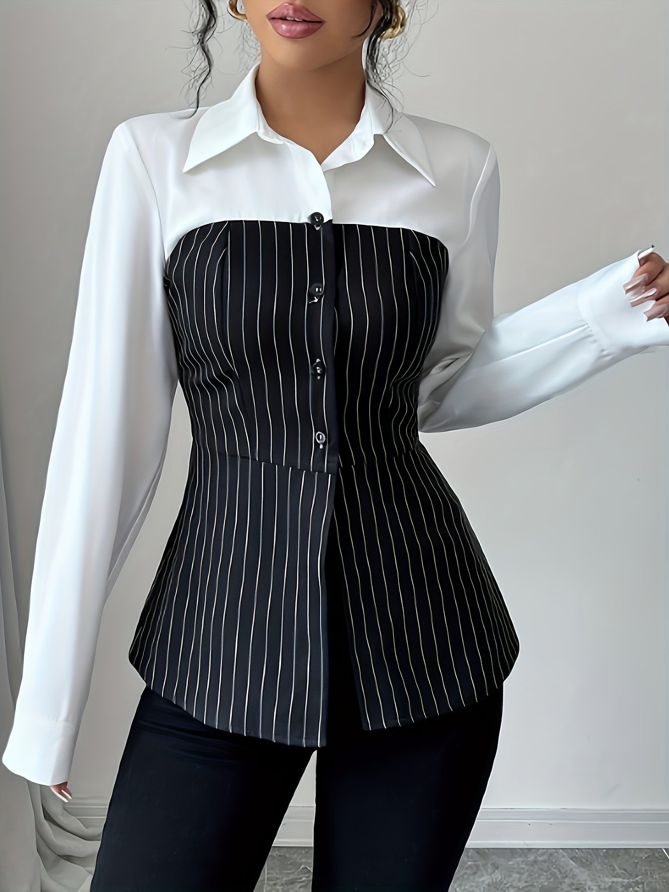 - עיצוב מודרני ואלגנטי: חולצה זו מתאפיינת בעיצוב מפוספס קלאסי עם צווארון אלגנטי וכפתורים קדמיים בודדים, המעניקים לך מראה יוקרתי ומקצועי המתאים למגוון סגנונות.
