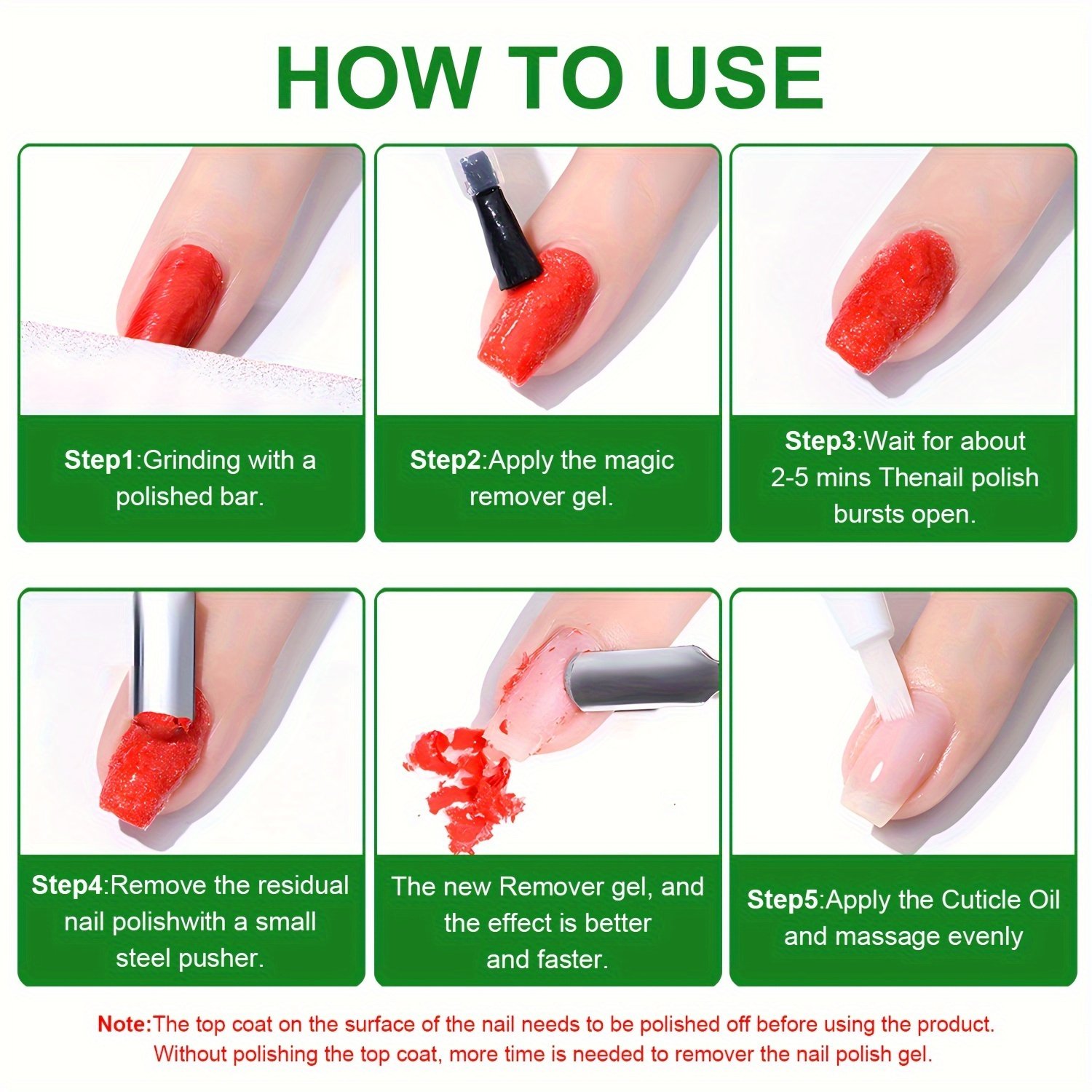 - להתראות להשריה ולעטיפה: תיהני מתהליך הסרה נטול טרחה לחלוטין! אין צורך להשרות את הציפורניים באצטון קשה או לעטוף אותן בנייר כסף, מה שמגן על הציפורניים והעור העדין שלך מפני יובש ונזקים.