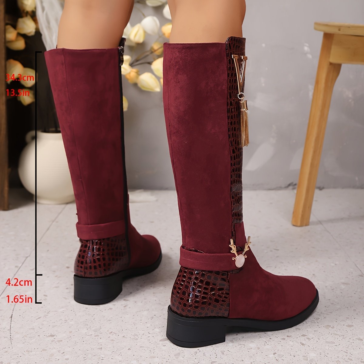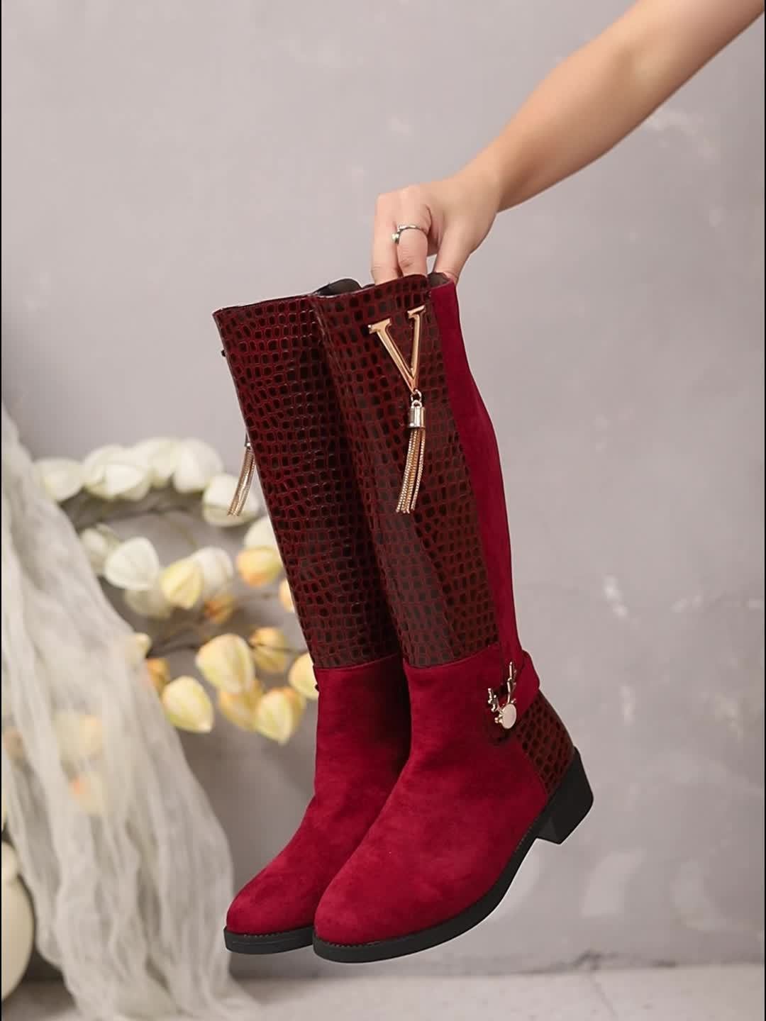 - צבע בורדו עמוק ומושך: צבע הבורדו העשיר מוסיף נופך של מסתורין וזוהר שאי אפשר לעמוד בפניו, בזמן שהמגף מכסה את הברך באורך אלגנטי ומושלם למגוון אירועים, בין אם בבוקר או בערב.