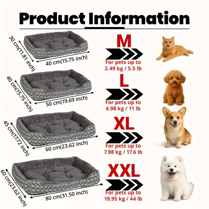 - זמין בארבעה גדלים לכולם: בין אם יש לך גור קטן, כלב גדול, או אפילו חתול שמחפש מקלט חם, המיטה שלנו זמינה בארבעה גדלים שונים כדי לענות על הצרכים של כל חיות המחמד ולהבטיח התאמה מושלמת.