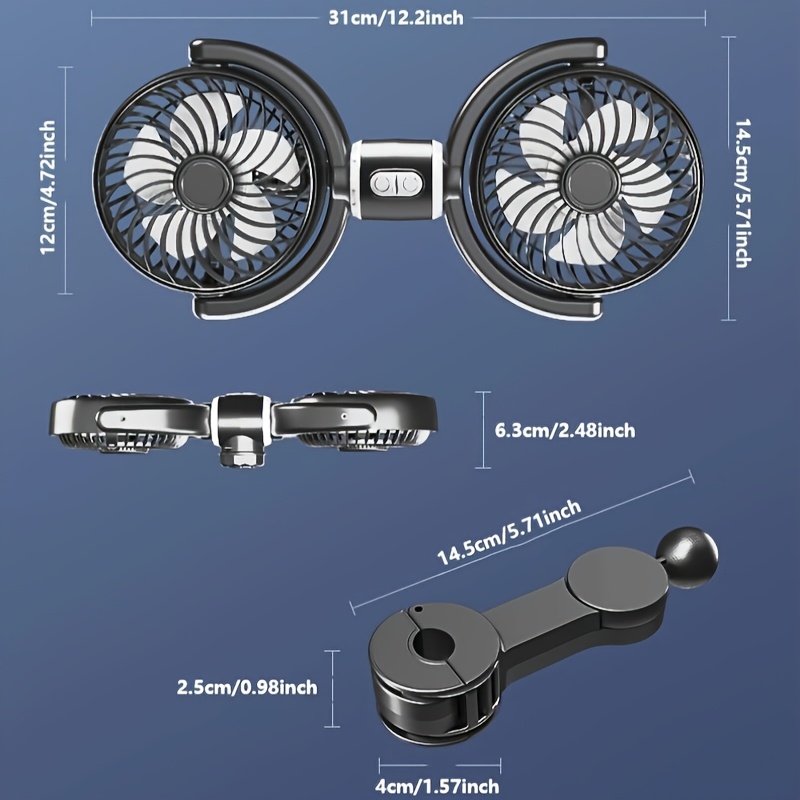 - עיצוב ראשים כפולים חדשני: מספק כיסוי אוויר רחב יותר וגישה אידיאלית למושבים הקדמיים והאחוריים, ומבטיח רענון לכל הנוסעים בו זמנית וללא מאמץ.