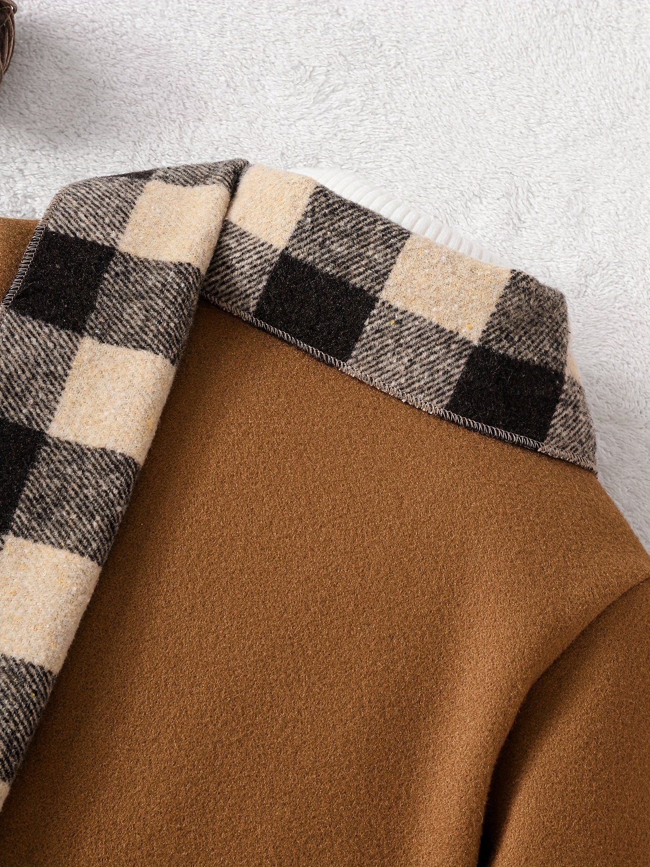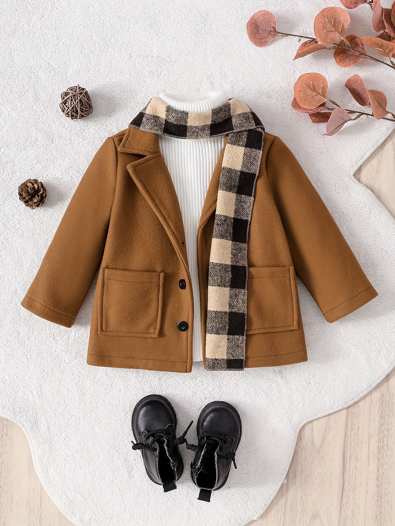 - סט שלם למראה מהפנט: הסט כולל מעיל אלגנטי בצבע קאמל חמים, ומשלים אותו צעיף משובץ בדוגמה מושכת המוסיף נופך של יוקרה וייחודיות למראה הכללי.