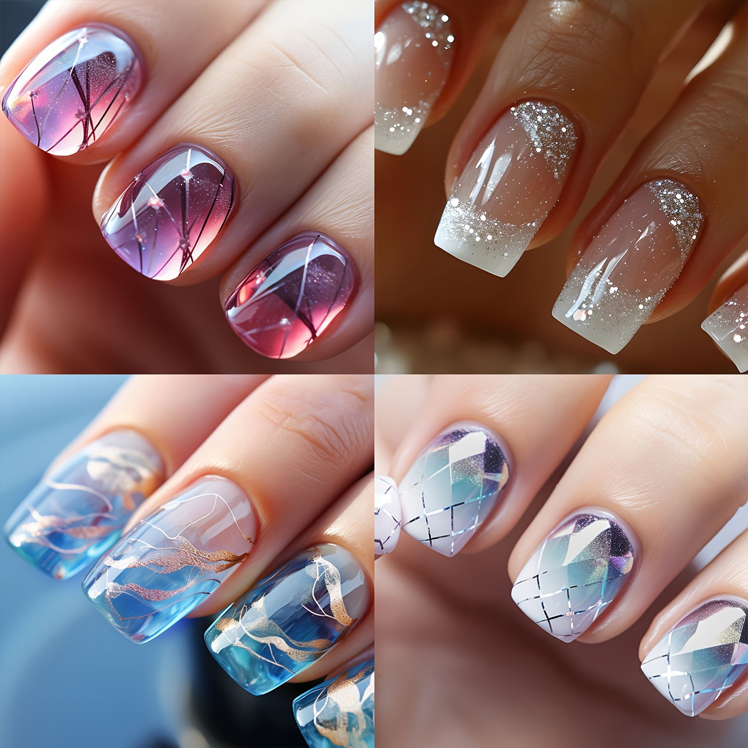 - עיצוב עכשווי: הציפורניים מאופיינות בצורתן המרובעת הקצרה, הפרקטית והאלגנטית, ומקושטות בדוגמאות פסים אופנתיות וגוונים מדורגים (אומברה) כובשים בשחור, כחול, אדום וורוד נוצץ, עם גימור זוהר שמושך את העין.
