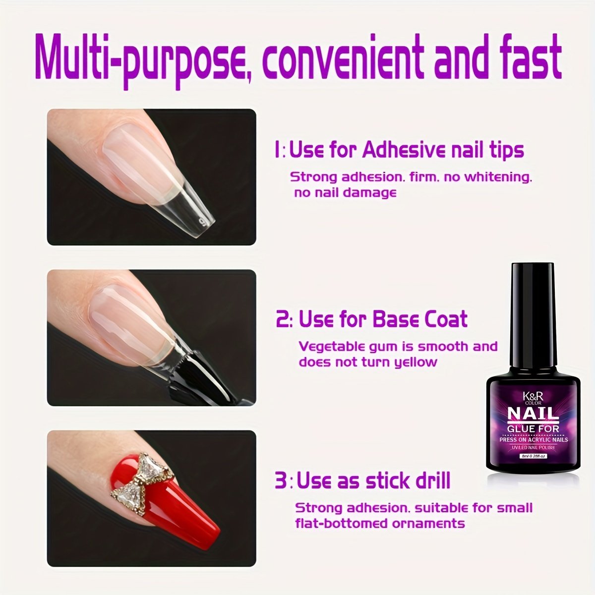 - חוזק הדבקה ללא תחרות: ג'ל שקוף זה מספק קשר חזק ואמין לציפורניים מלאכותיות, מבטיח יציבות איתנה ומונע ניתוק. תיהני ממראה טבעי ומקצועי בביטחון מלא.