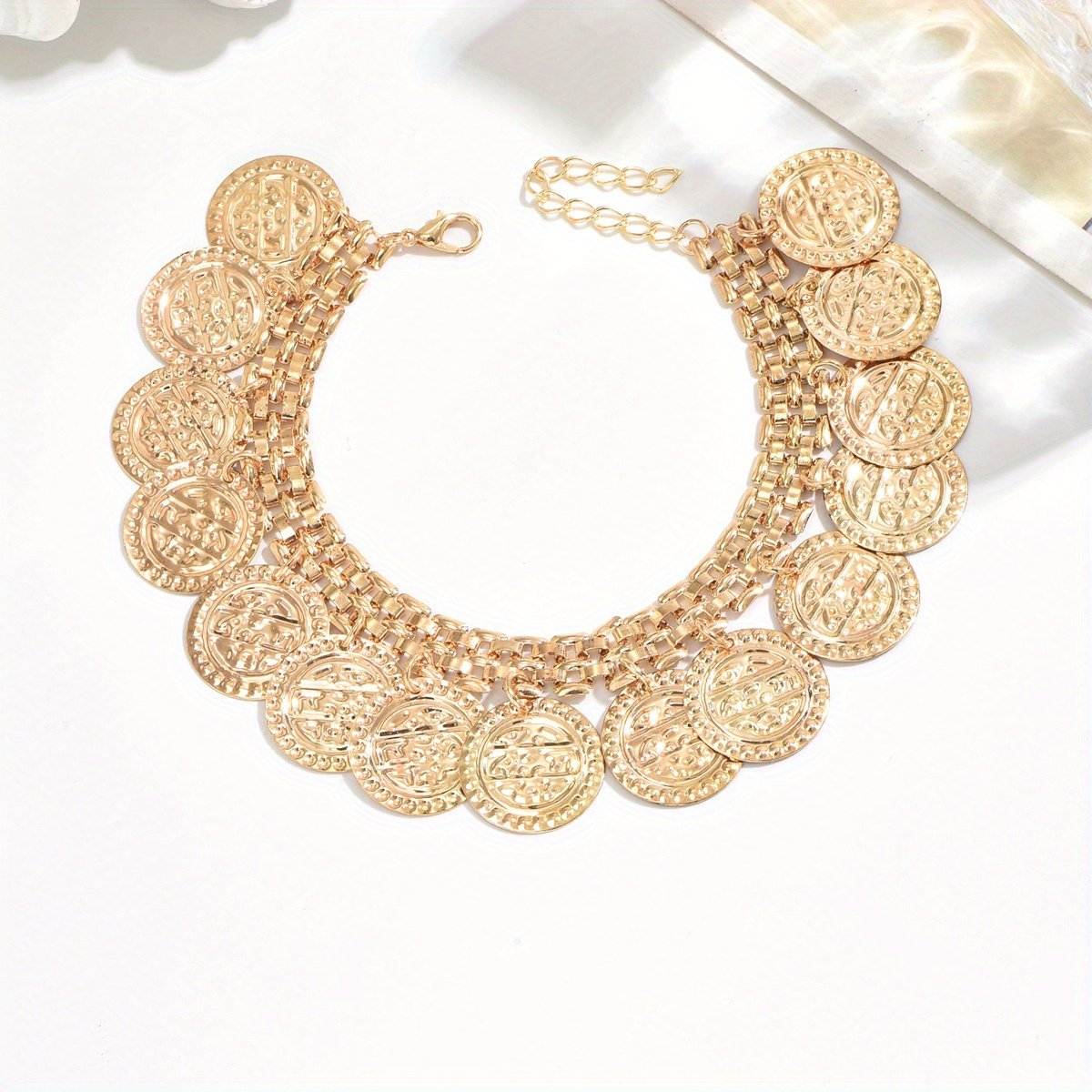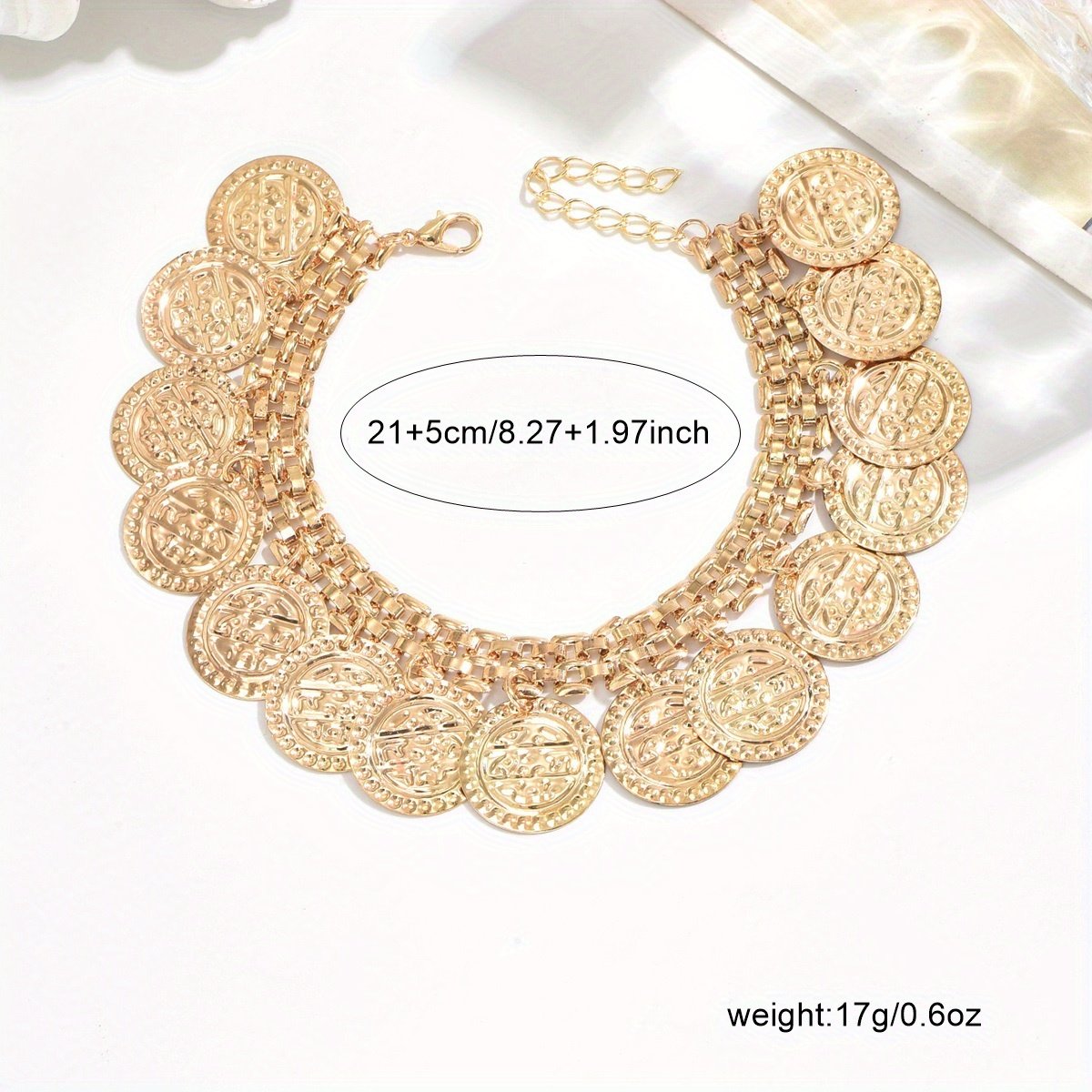 מחפשת את התוספת המושלמת שתדגיש את יופיו של מראה הקיץ שלך, או מגע ייחודי שישקף את אישיותך הזוהרת? אנו מציגים לך את צמיד הקרסול אלגנטי המטבעות, יצירת אמנות המשלבת את קסם העבר עם חיוניות ההווה. צמיד קרסול זה עוצב במיוחד כדי ללוות אותך בכל הרפתקאותייך, מטיולי היומיום שלך ועד לערבי חג שטופי שמש, ומוסיף ניצוץ מיוחד וסגנון בלתי נשכח לכפות רגלייך.