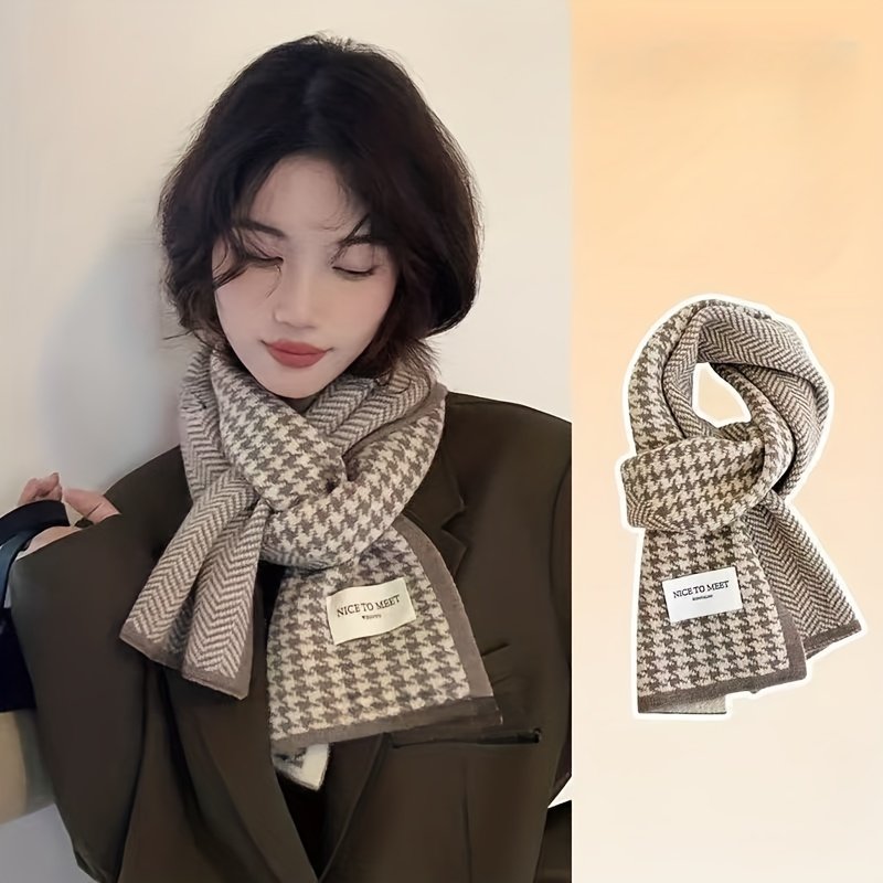- עיצוב אלגנטי ויוקרתי: צעיף זה מגיע עם עיצוב קלאסי המשלב את דוגמת המשבצות (Houndstooth) וההרינגבון (Herringbone) הנצחית, מה שמוסיף לך נופך של אלגנטיות יוקרתית שלעולם אינה דוהה, ומתאים לכל הטעמים המודרניים.