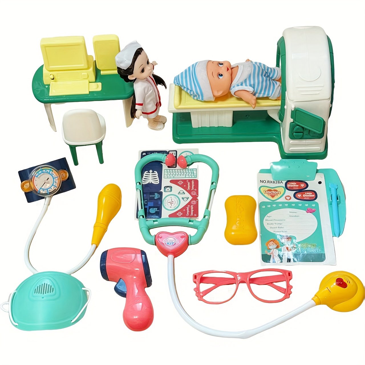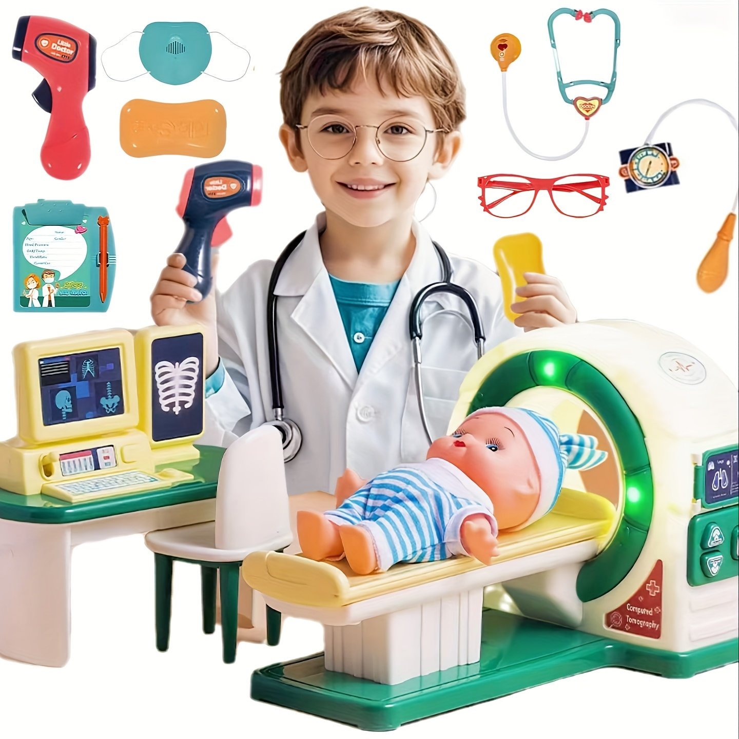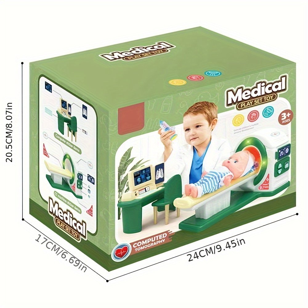 - ערכה רפואית משולבת: הערכה כוללת כל מה שהרופא הקטן צריך: סטטוסקופ, מכשיר רנטגן (X-Ray), מכשיר CT מיניאטורי, ומזרק בטוח ומדמה כדי לעזור לילדכם להבין הליכים רפואיים שונים בצורה מהנה.