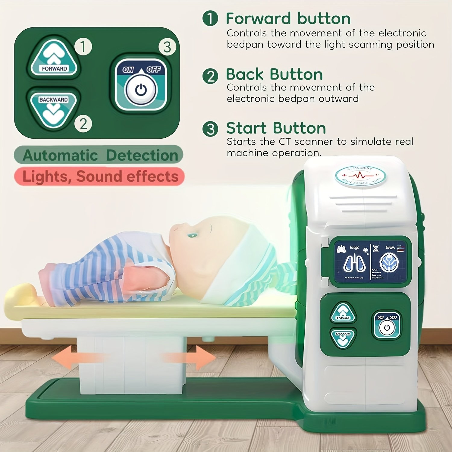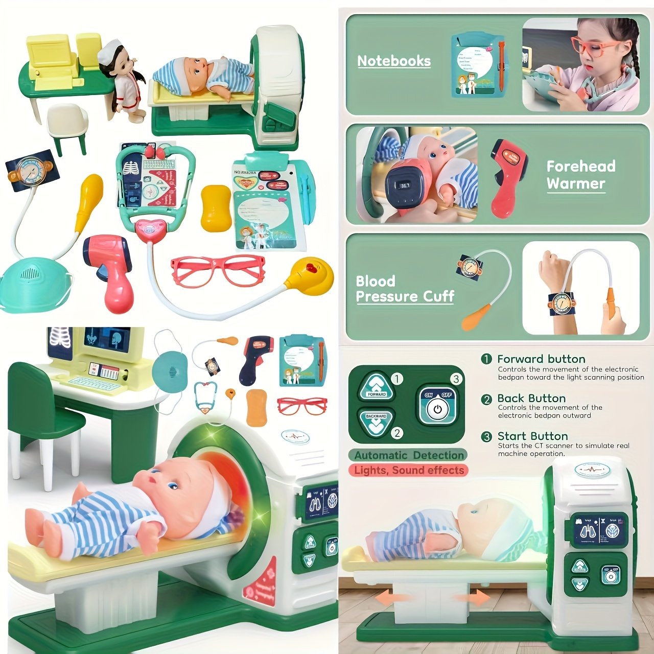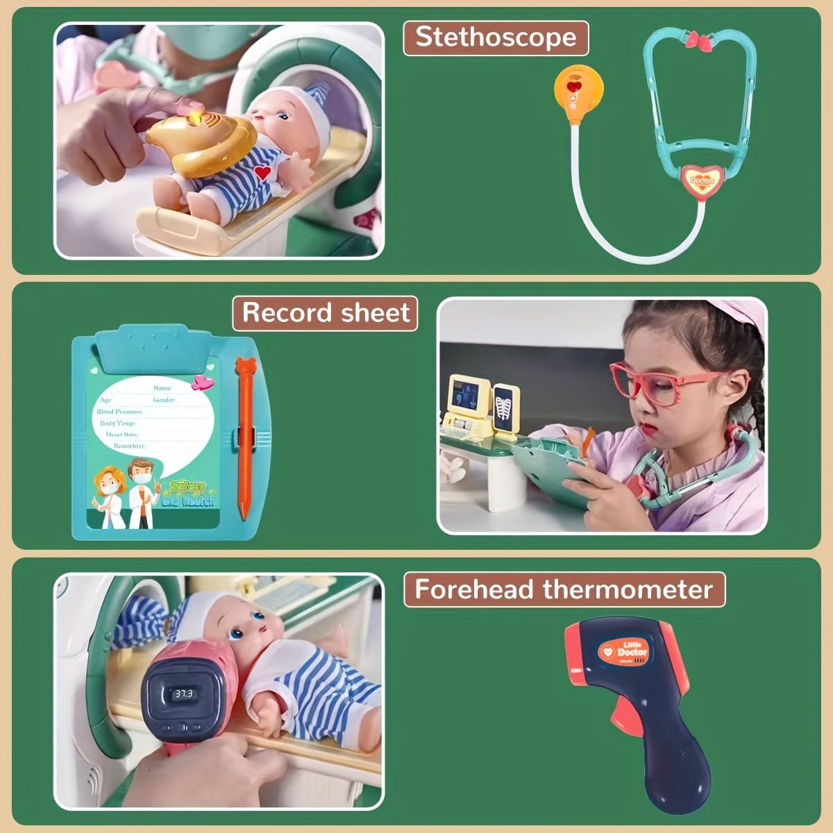 - ערכה רפואית משולבת: הערכה כוללת כל מה שהרופא הקטן צריך: סטטוסקופ, מכשיר רנטגן (X-Ray), מכשיר CT מיניאטורי, ומזרק בטוח ומדמה כדי לעזור לילדכם להבין הליכים רפואיים שונים בצורה מהנה.