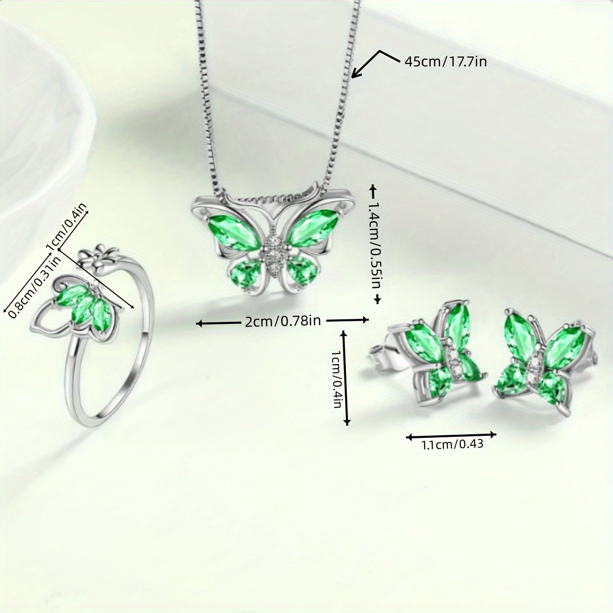 שקעי עצמך בקסם שאין שני לו ואלגנטיות על-זמנית עם סט תכשיטי הפרפר המלא. עיצוב הנוגע בנשמה ומוסיף מגע של יופי שליו וקסם טבעי למראה היומיומי שלך או לאירועים המיוחדים שלך. תני לפרפרים לרחף סביבך, נושאים עימם את הבטחת האלגנטיות הנצחית.