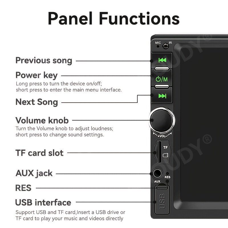 - אפשרויות חיבור מרובות: אל תדאגו לגבי מקורות הבידור שלכם! המסך תומך בכניסות USB, TF (כרטיס זיכרון) ו-AUX, מה שמעניק לכם גמישות מלאה להפעלת קבצי האודיו והווידאו שלכם מכל מכשיר.