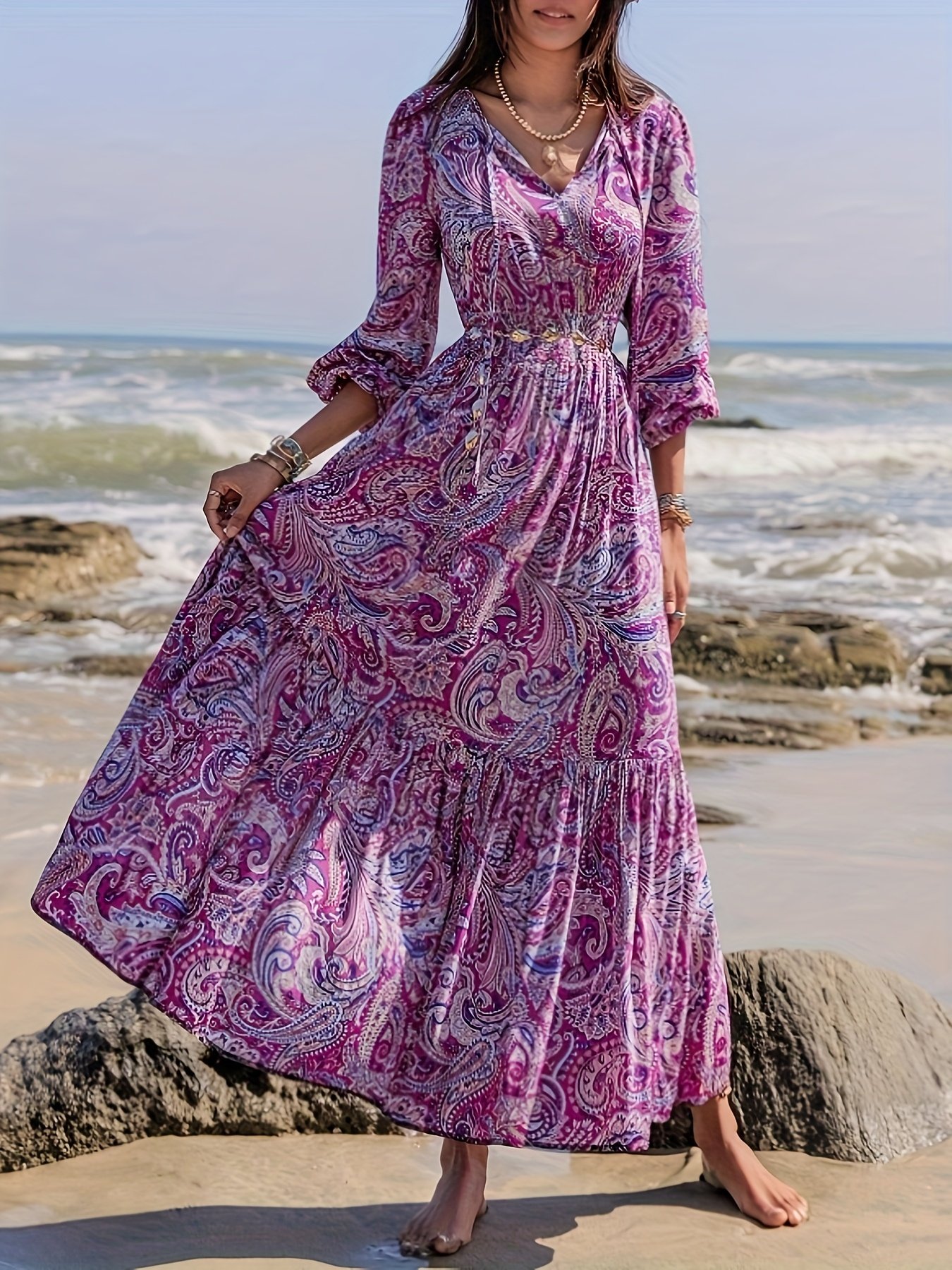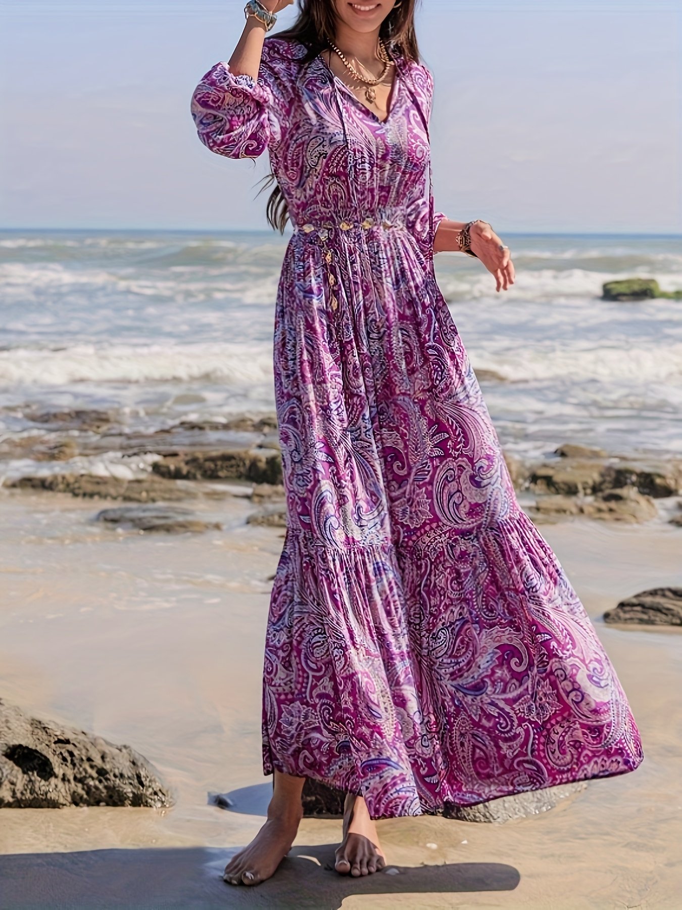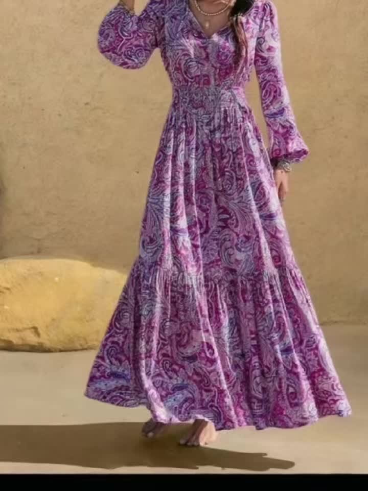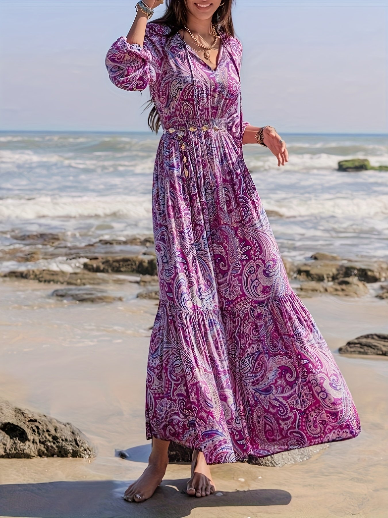 - הדפסים אמנותיים כובשים: השמלה מתאפיינת בדוגמאות פייזלי ופרחים שלובים בצבעי סגול וורוד עזים, מה שמבטיח לך מראה ייחודי ללא תחרות בזכות ההדפסה האקראית המוסיפה טאץ' אישי.