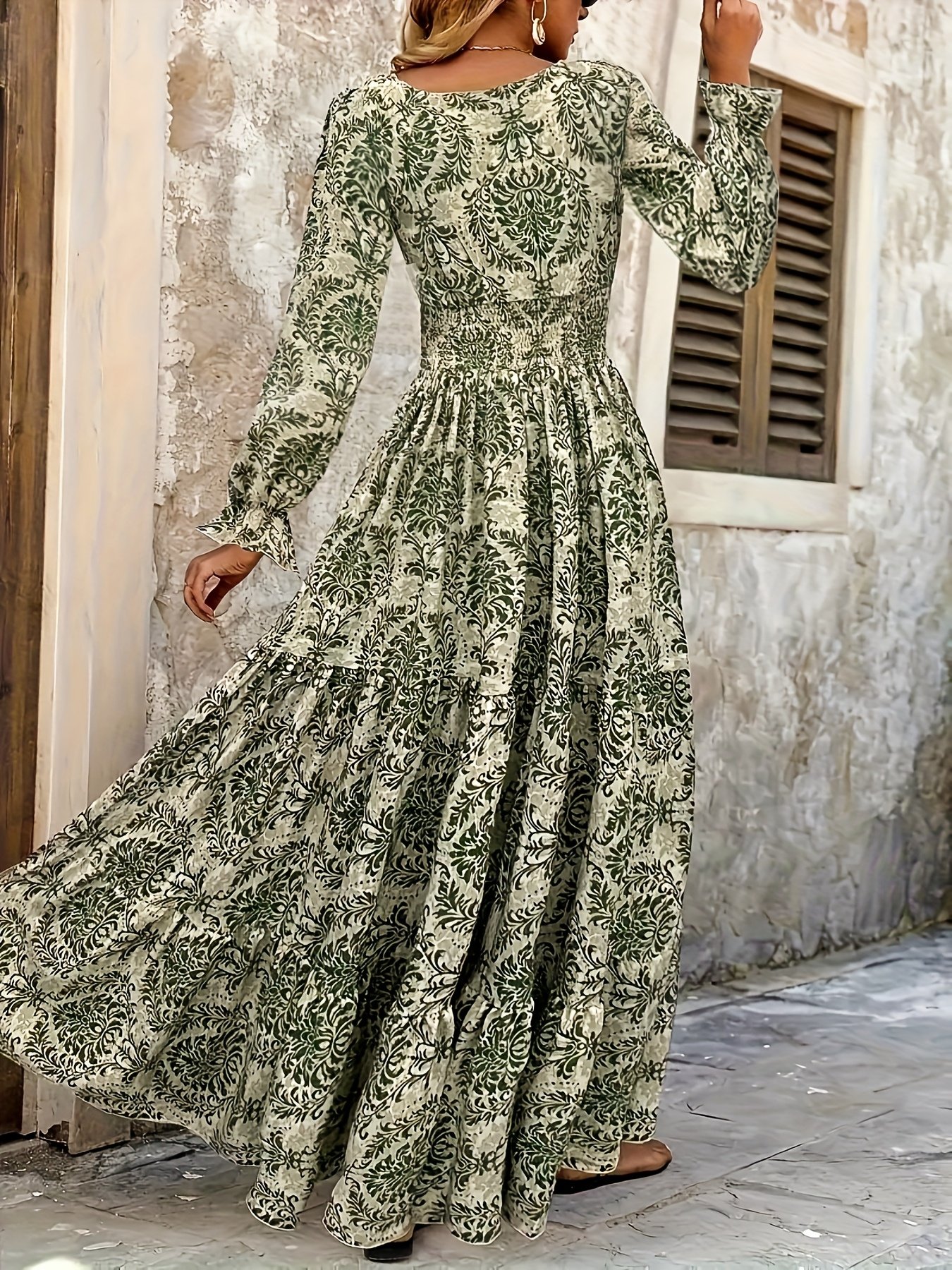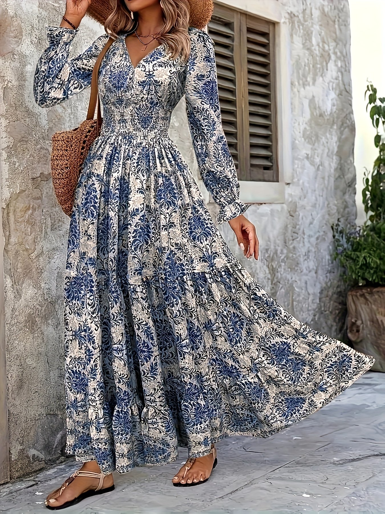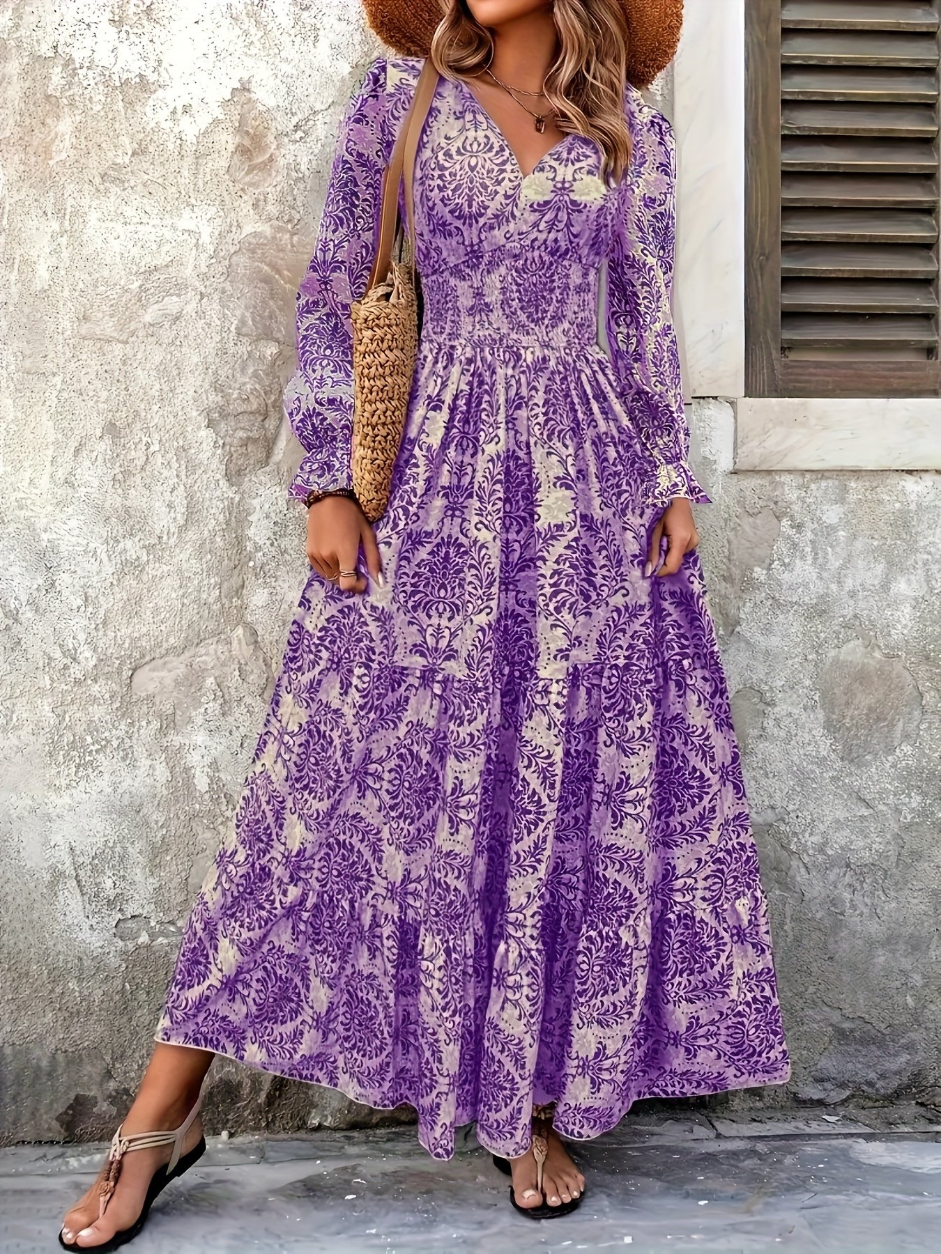 - עיצוב אלגנטי והדפס כובש: השמלה מתאפיינת בהדפס הפאצ'ורי היוקרתי המוסיף נופך של יוקרה, עם מחשוף V המדגיש את יופי צווארך ושרוולי בועה אופנתיים למראה מושך.
