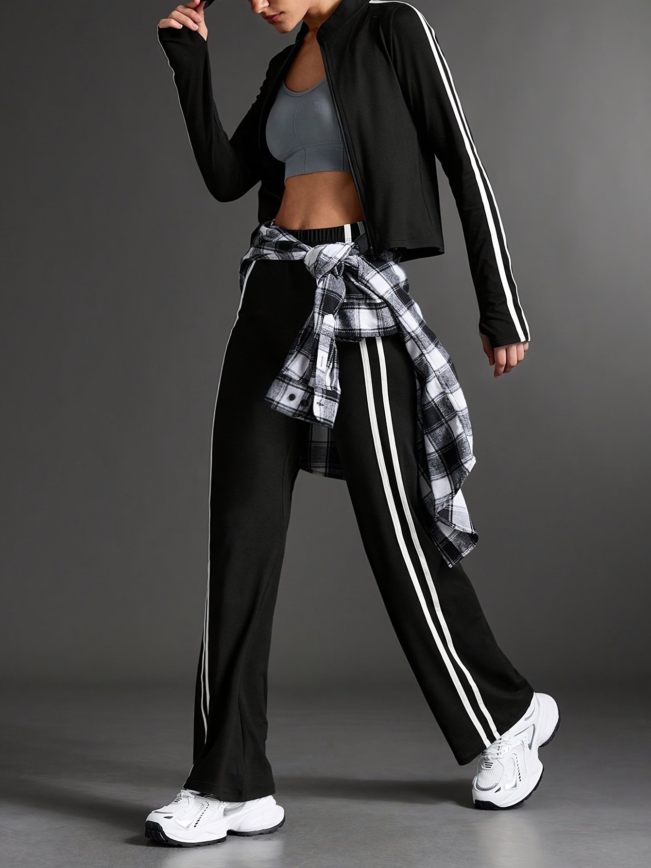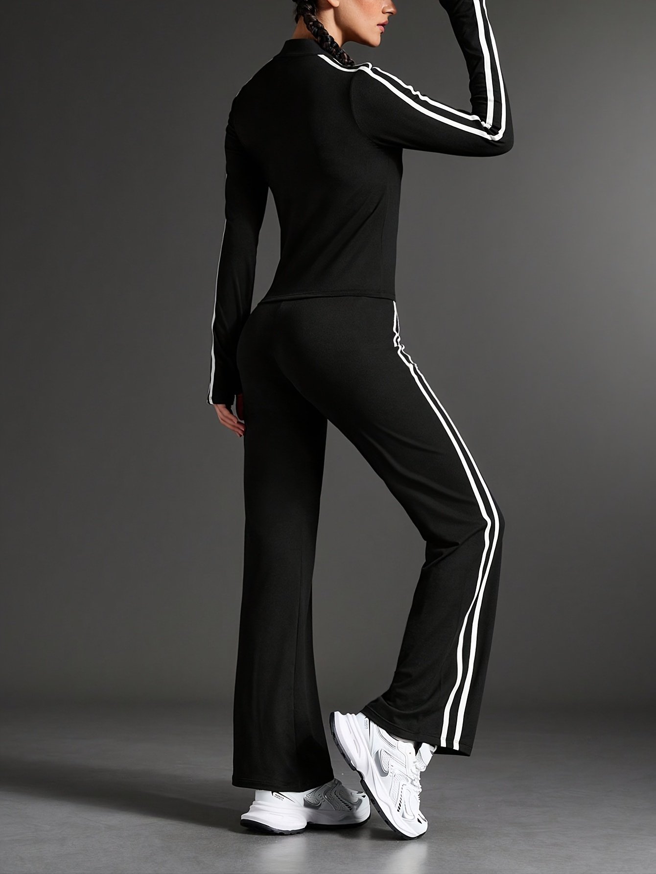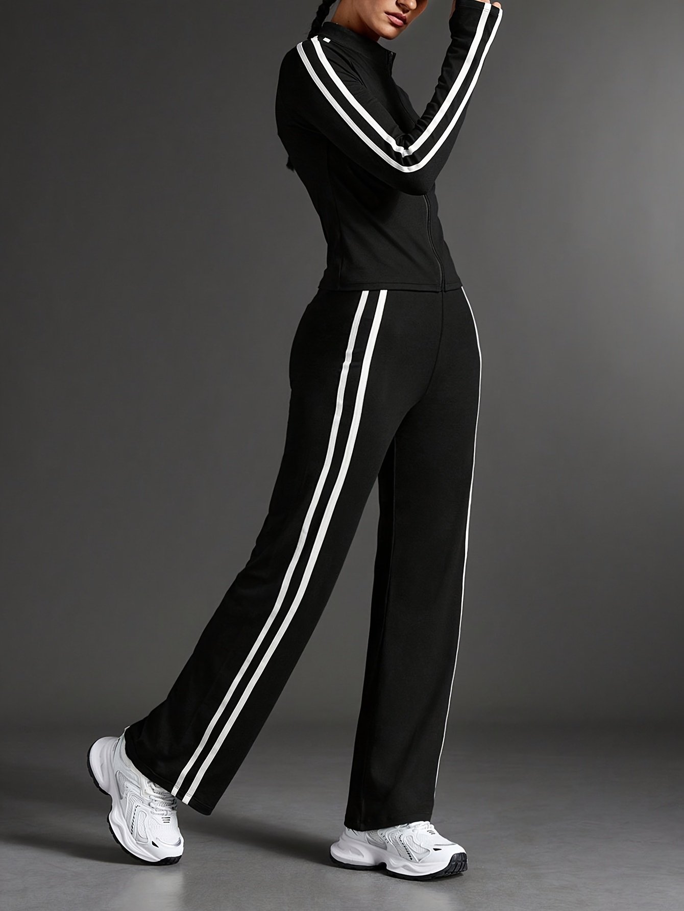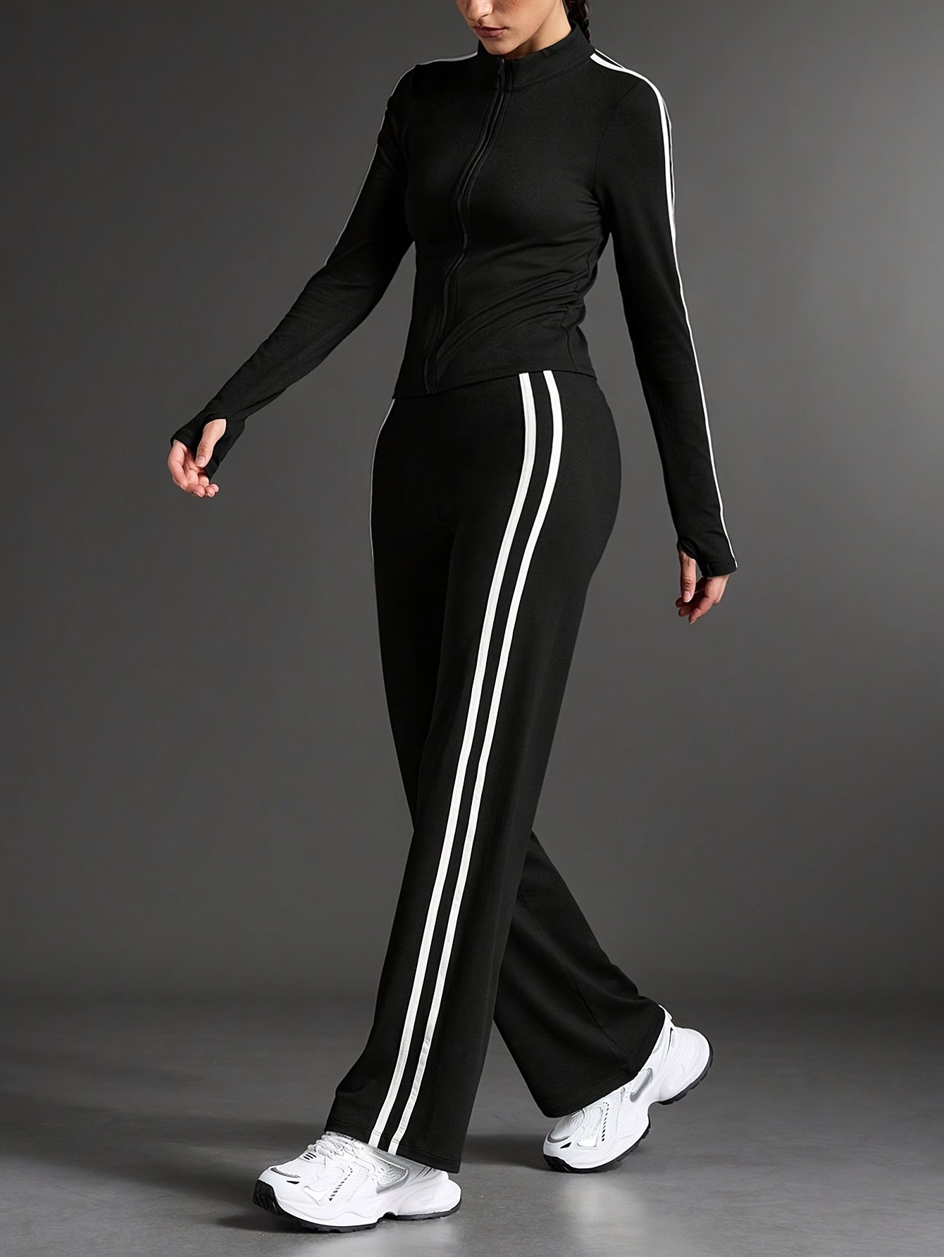 - עיצוב שלם ומודרני: סט שני חלקים הכולל ז'קט אלגנטי עם צווארון עומד ומכנסיים בגזרה ישרה, המעניק לך מראה הרמוני ואטרקטיבי למגוון פעילויות ספורט ויומיום.