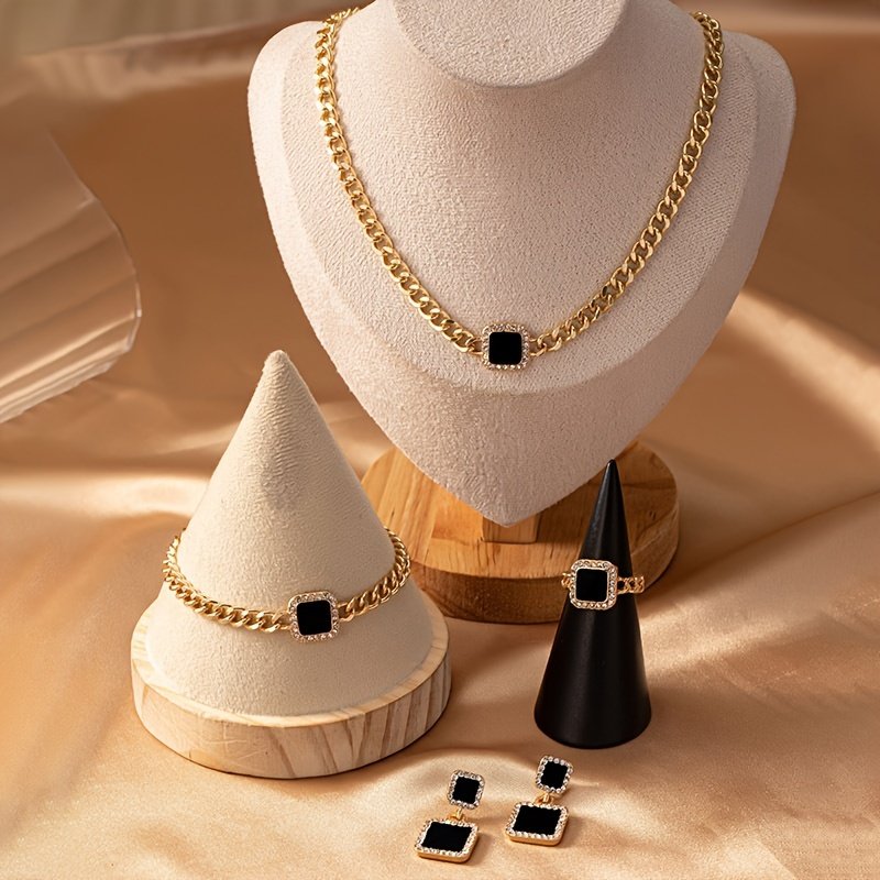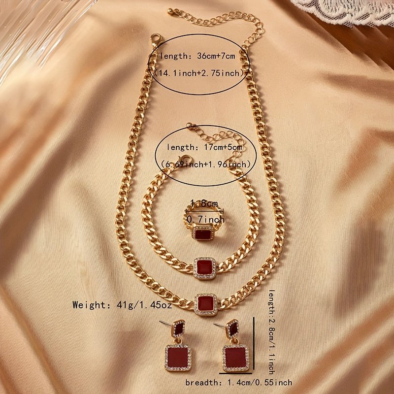 - אלגנטיות מושלמת: סט יוקרתי הכולל 5 פריטים תואמים (שרשרת, צמיד, זוג עגילים וטבעת) שעוצבו בקפידה כדי להעניק לך מראה שלם ומושך ללא מאמץ, ולהבטיח לך זוהר מכף רגל ועד ראש.