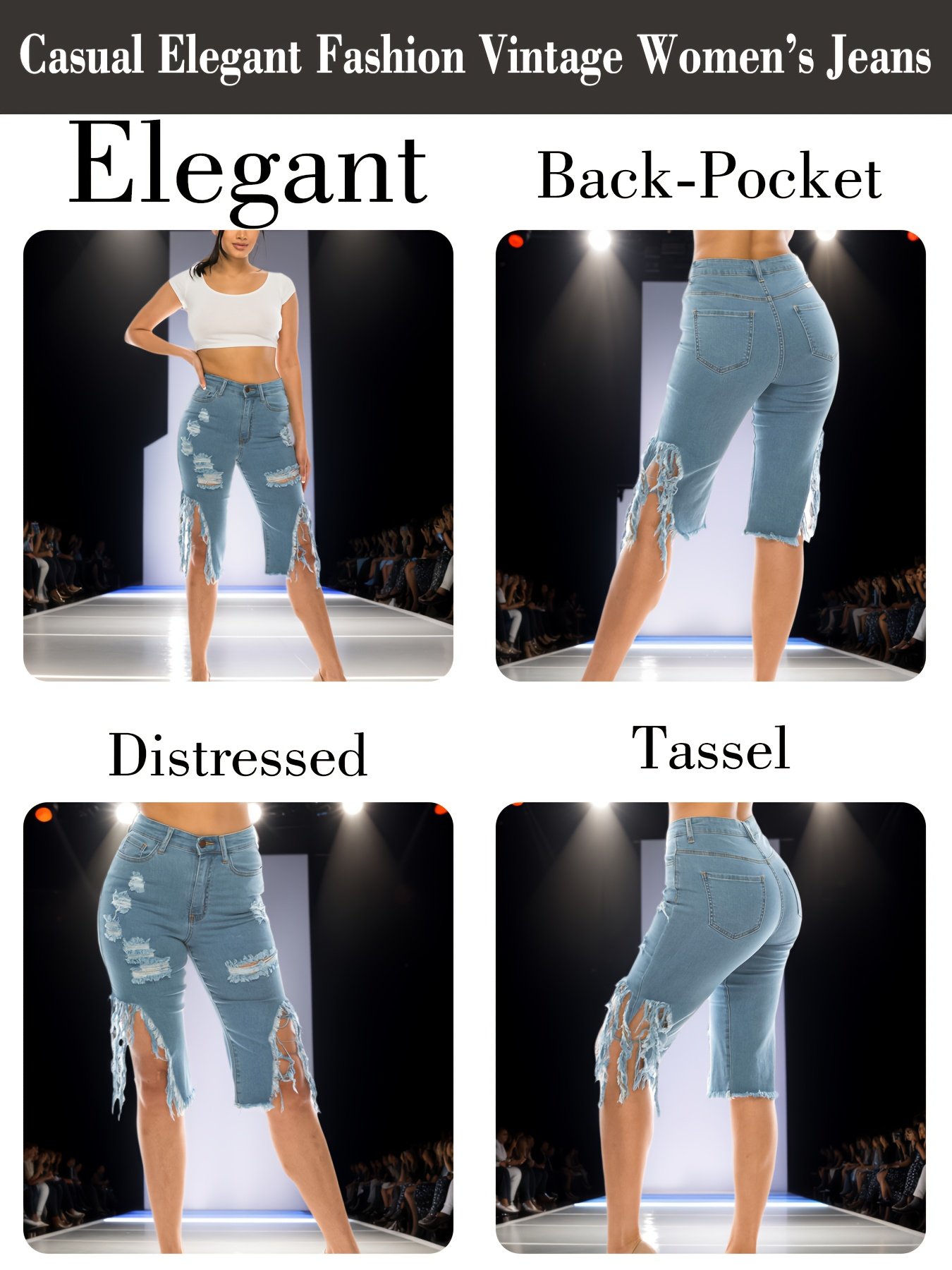 - עיצוב אופנתי ונועז: מתאפיין בפרטים קרועים מסוגננים ובשוליים מעוטרים בגדילים אופנתיים, מה שמוסיף מגע צעיר ונועז ומתאים לטרנדים האחרונים באופנה.