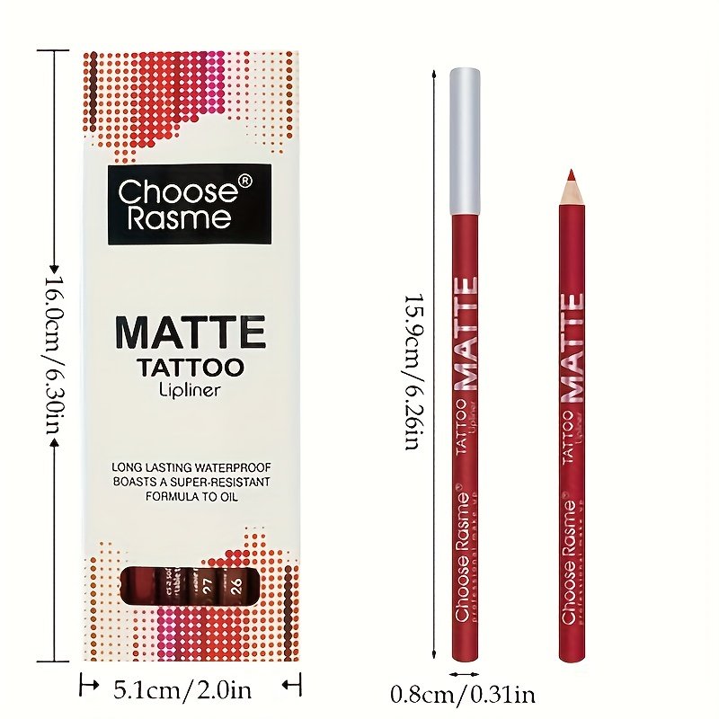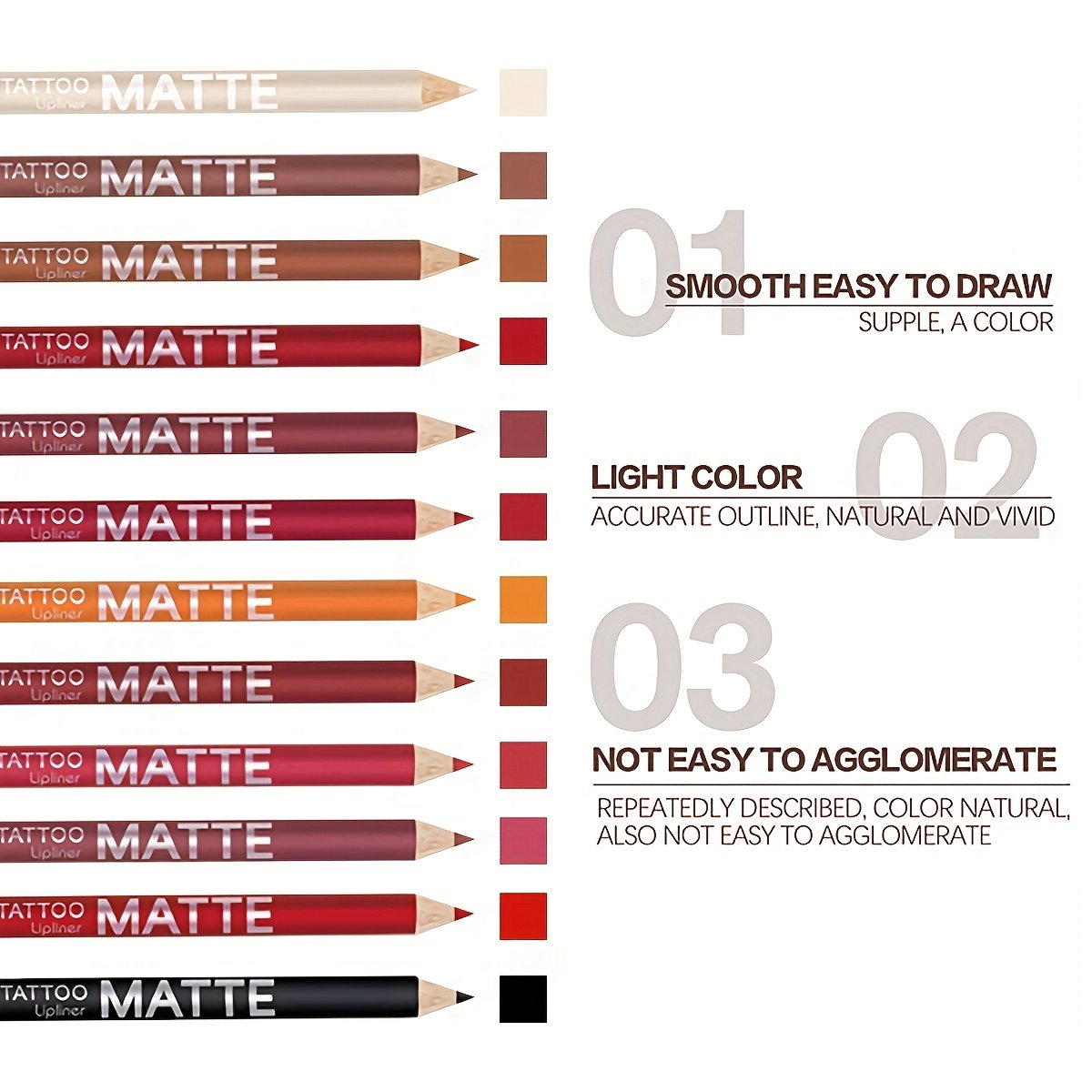 Unleash your inner beauty with the 12-piece matte lip liner set, the secret to perfect lips that last all day. This set is designed to give you extreme precision and captivating colors, allowing you to expertly define your lips and add a luxurious matte finish that suits all your looks, whether for daily use or special occasions.