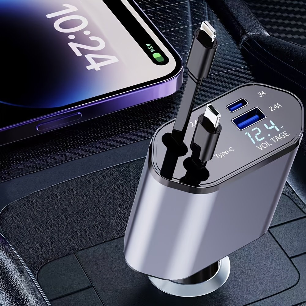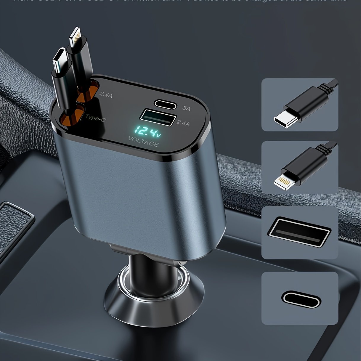 - Additional USB-C Port: In addition to the built-in cables, the charger features an extra USB-C port to connect any other charging cable you need, increasing your charging options and making it your car’s ultimate power hub.