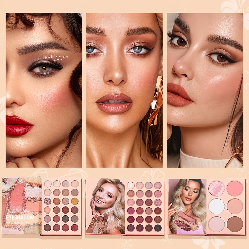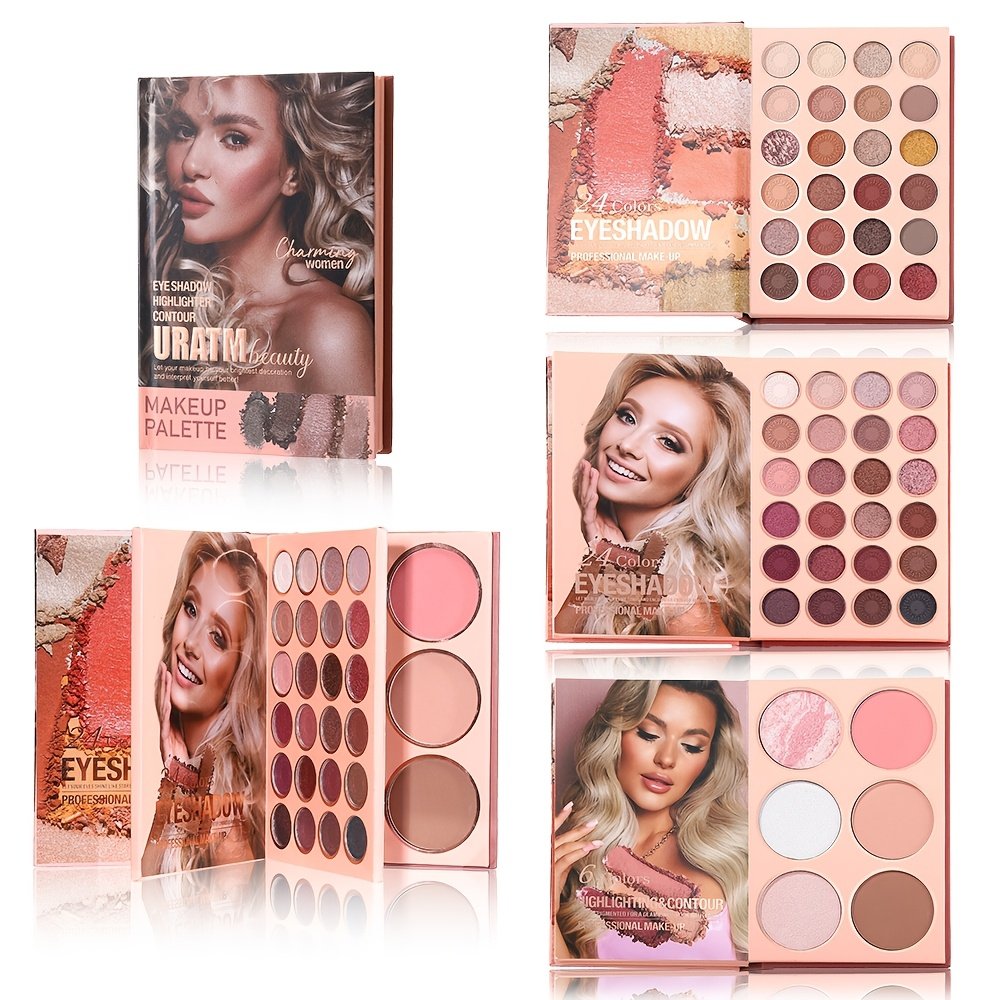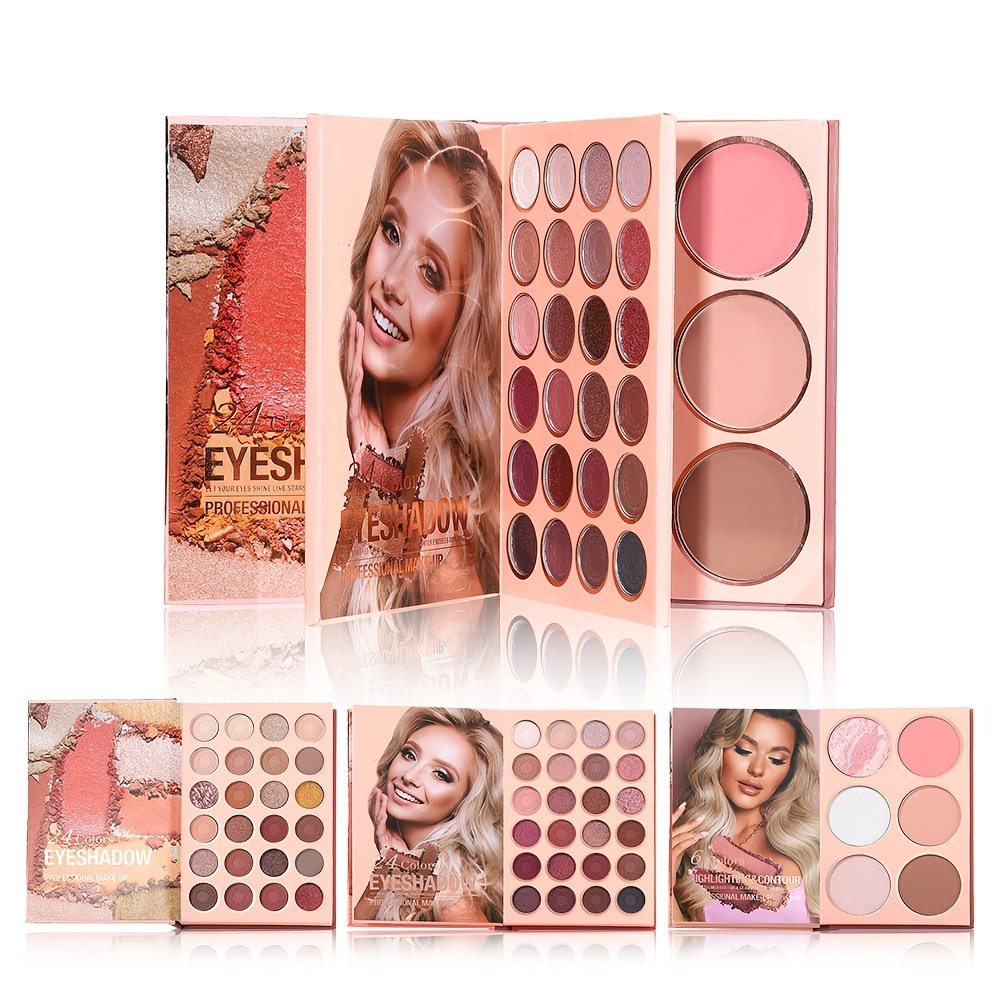 - Comprehensive Color Palette: Featuring 54 dazzling shades in a 3-in-1 design, skillfully combining **48 diverse eyeshadow shades** (matte and shimmer) for every occasion, along with **2 blushes**, **2 contour shades**, and **2 highlighters** to expertly define and enhance your facial features.