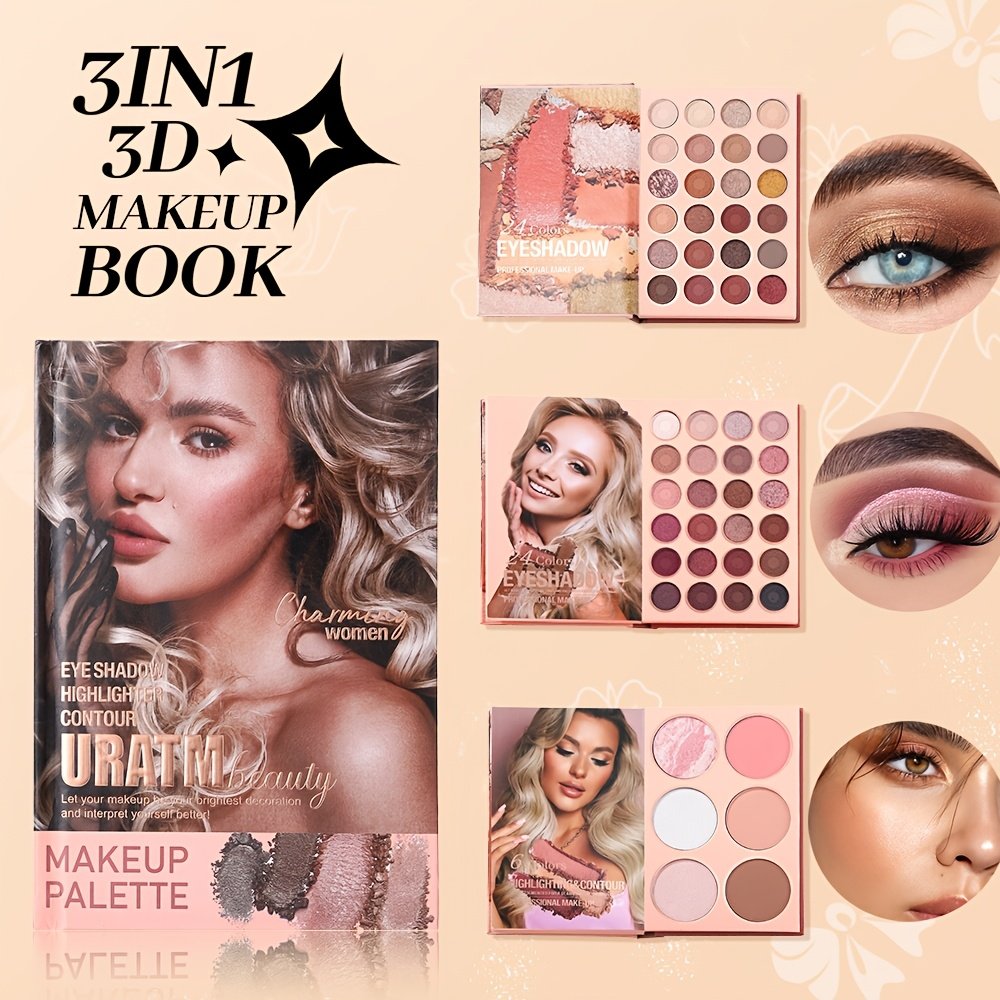 Discover a new world of beauty and innovation with the **3-in-1 3D Beauty Book**! This integrated palette is all you need to unleash your creativity and create unforgettable looks, from soft daily touches to captivating evening glam. Let this elegant book be your key to mastering the art of makeup and achieving a professional, eye-catching look anytime, anywhere.