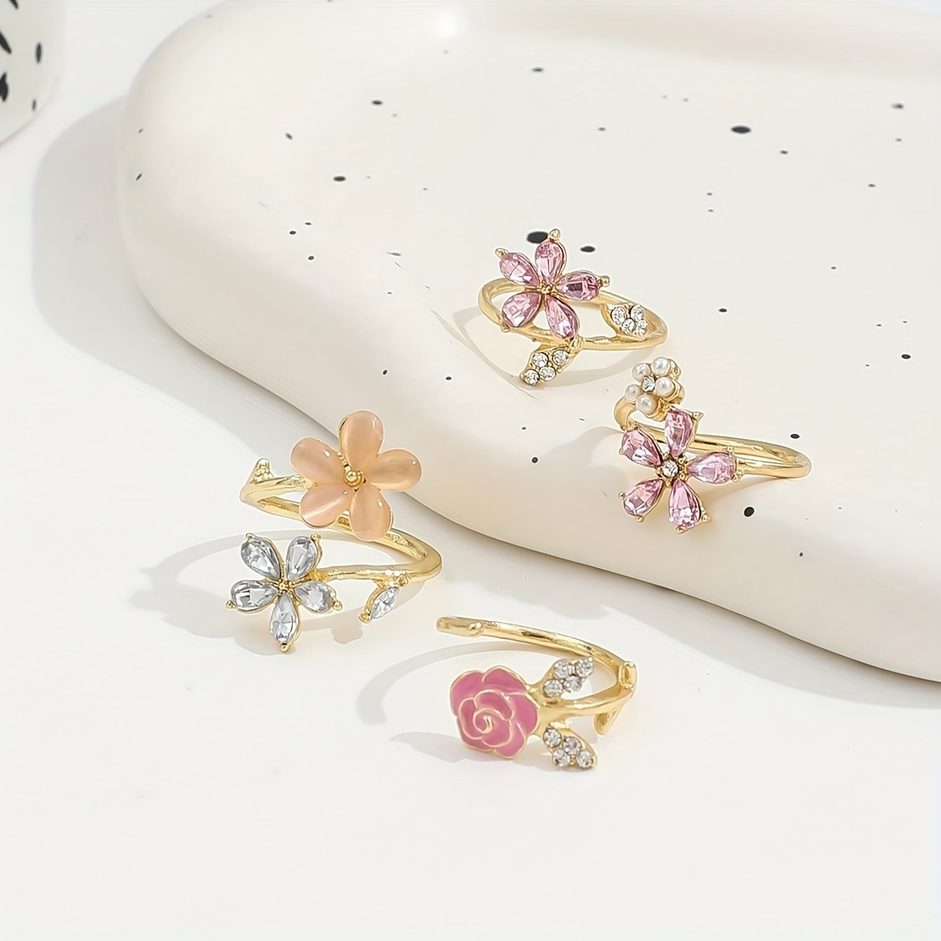 - Colorful Pearl Flowers: The rings feature five-petal rose flowers adorned with colorful faux pearls, adding joy and vitality to your look.