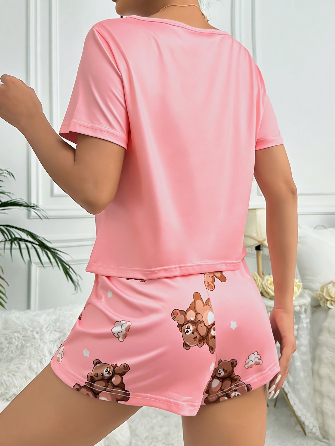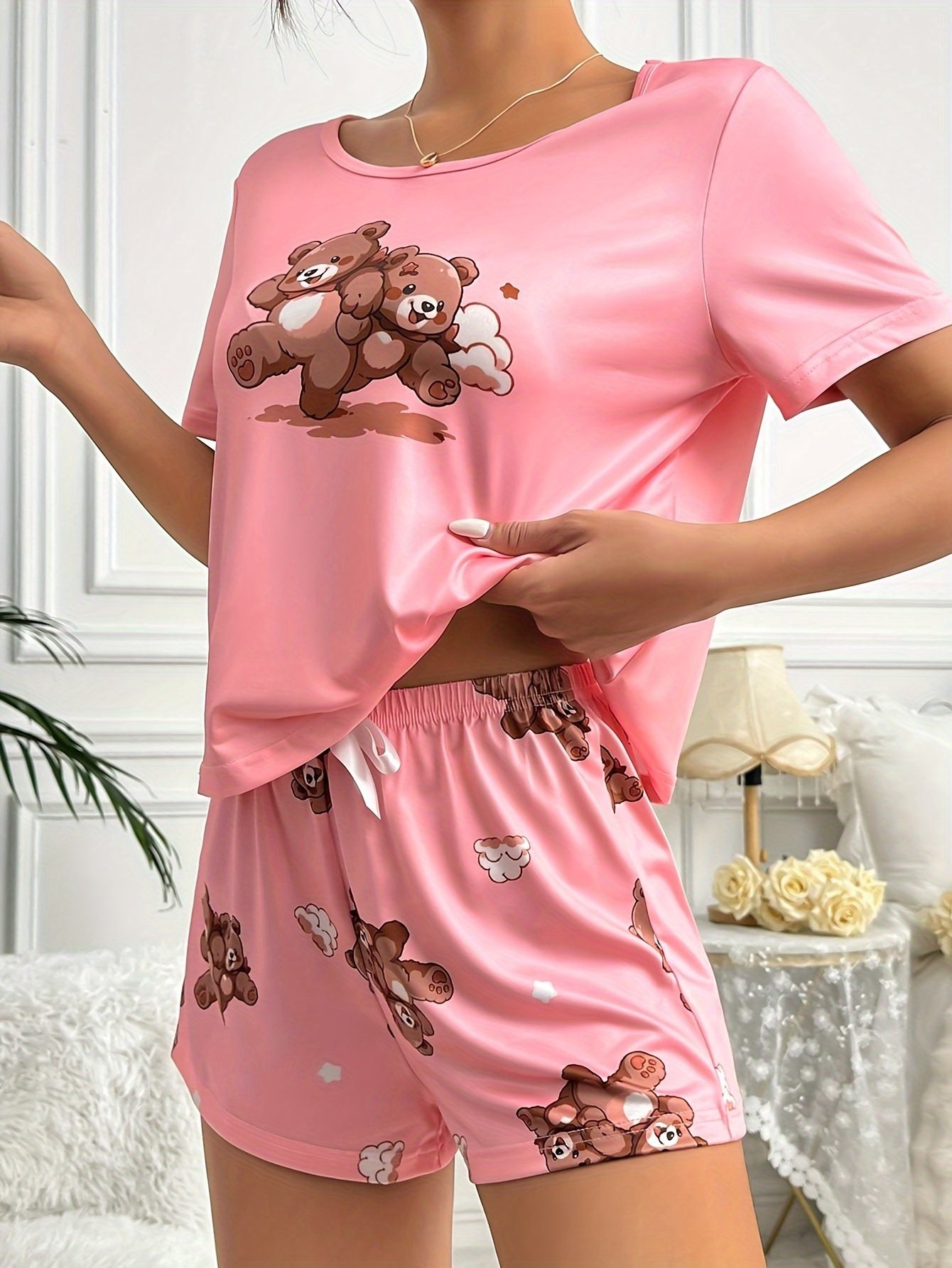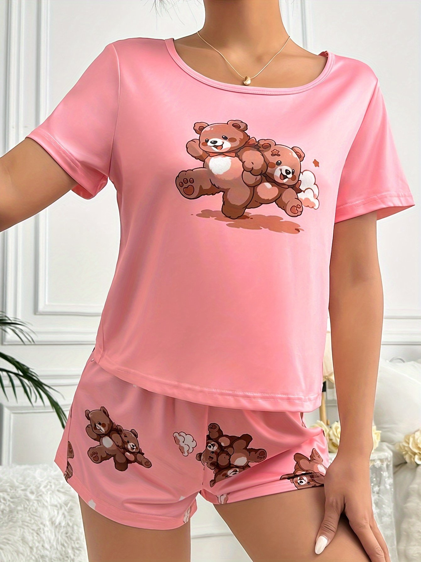 - Attractive & Versatile Design: Featuring a comfortable round neck and short sleeves, with loose shorts that add a touch of casual elegance. Adorned with cute animal prints (bear) that give it a playful and appealing character, making it perfect for relaxing at home or for a modern look on your light outdoor strolls.